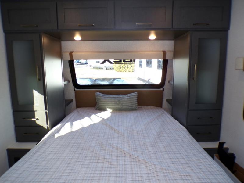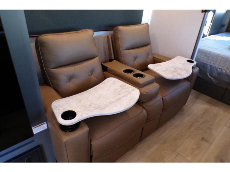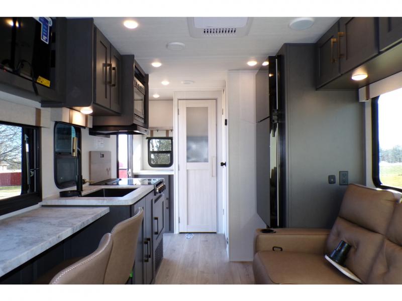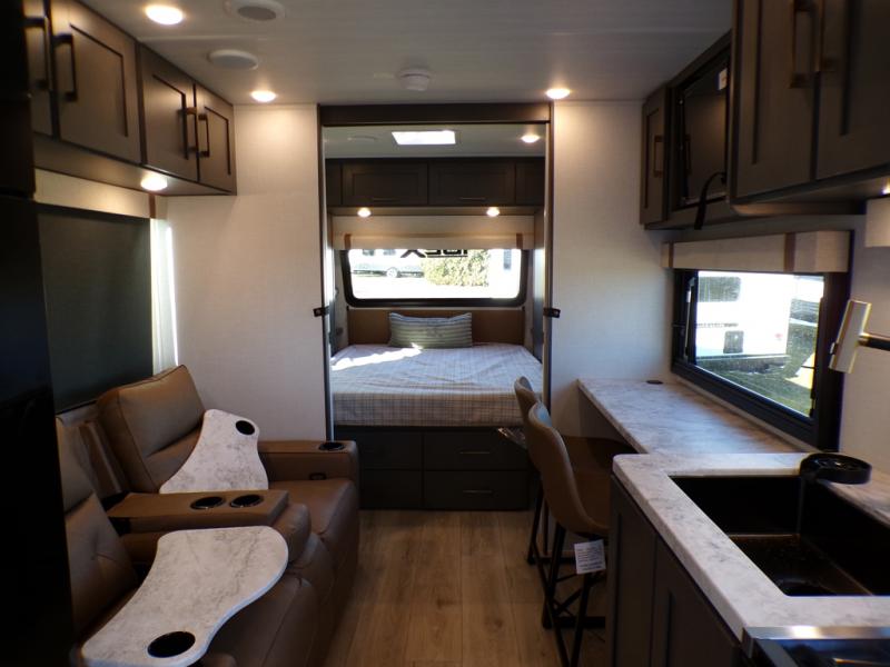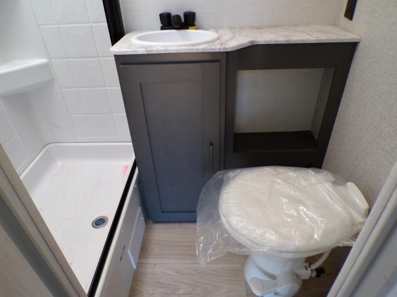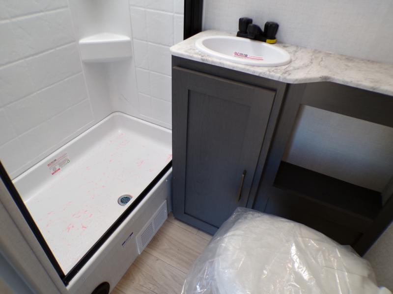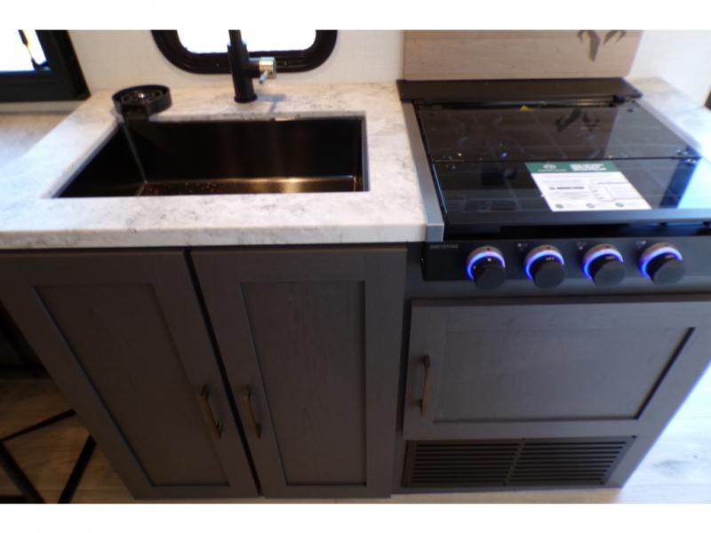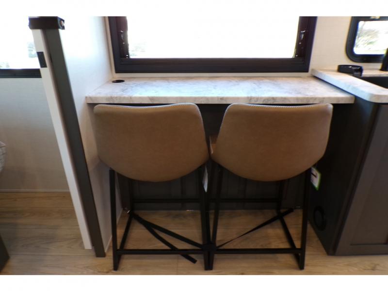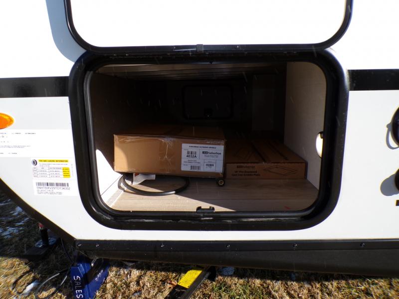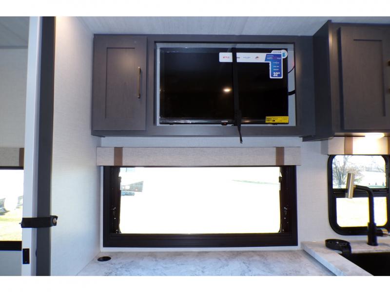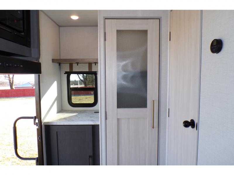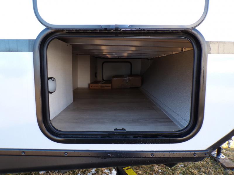 Wherever you decide to camp, you can be sure to have a great time in this cozy travel trailer. A front private bedroom will make you feel right at home, and there are dual bedroom wardrobes to keep your things organized. Once you've made breakfast on the interior cooktop or outside kitchen, you can enjoy your coffee on the theater seating or under the 16' awning. This unit also includes a walk-in pantry, a hutch with a shelf and overhead cabinets so nothing gets left behind!