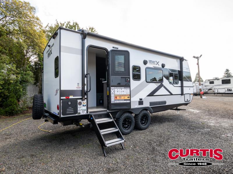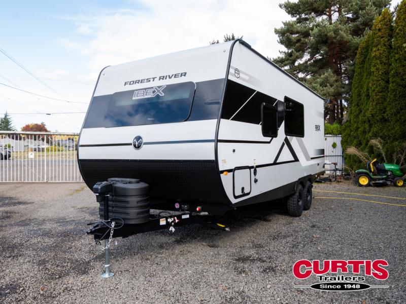 The Forest River IBEX travel trailers are extended season ready, and adventure approved! They are built with a fully walkable PVC roof, a welded aluminum structure, and laminated walls and slide outs with Azdel composite panels. There are also all-terrain tires with TPMS, a hot and cold exterior spray port, and large holding tanks for added convenience when you're set up off-grid. The USB-C ports inside and out will help you keep your electronics charged, and the premium window treatments will make your trailer feel more like home. The optional Black Canyon Beast Mode Package is available with an independent suspension, a 400-watt solar package, a fresh water filter, and a Maxxair roof vent cover.