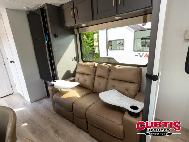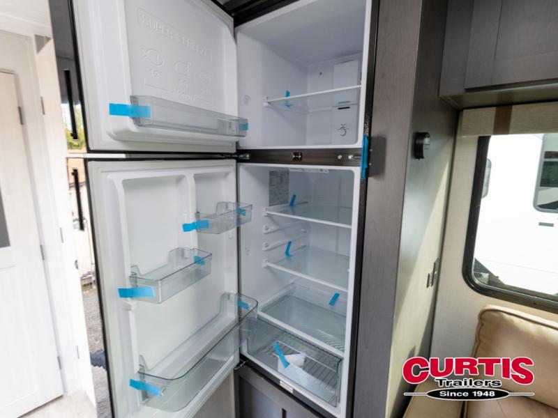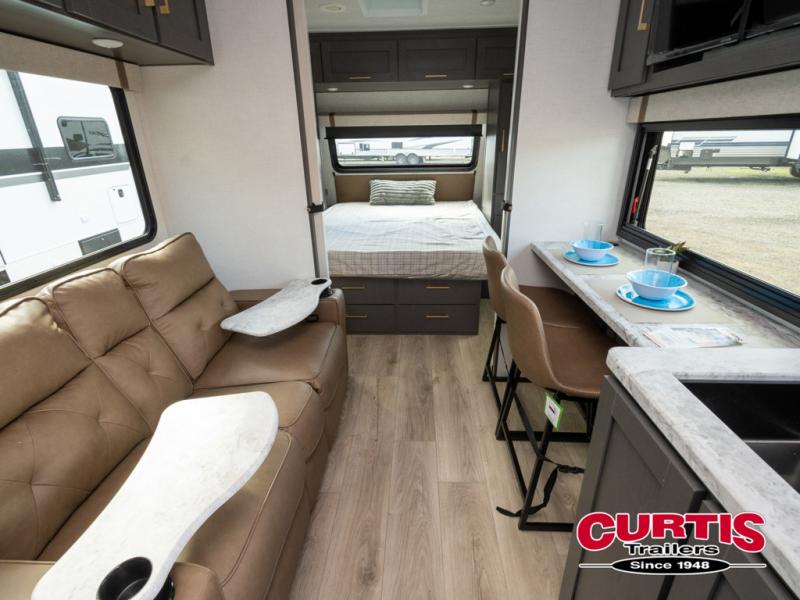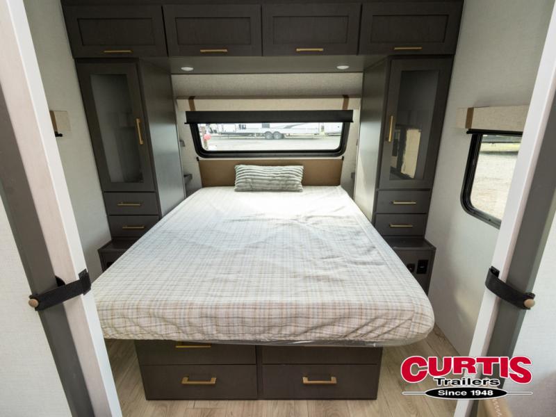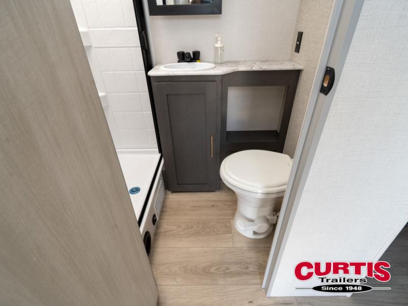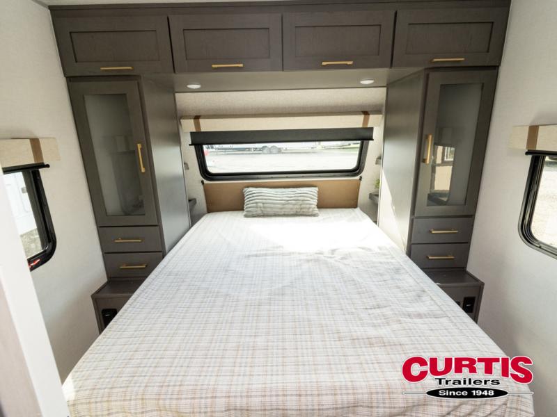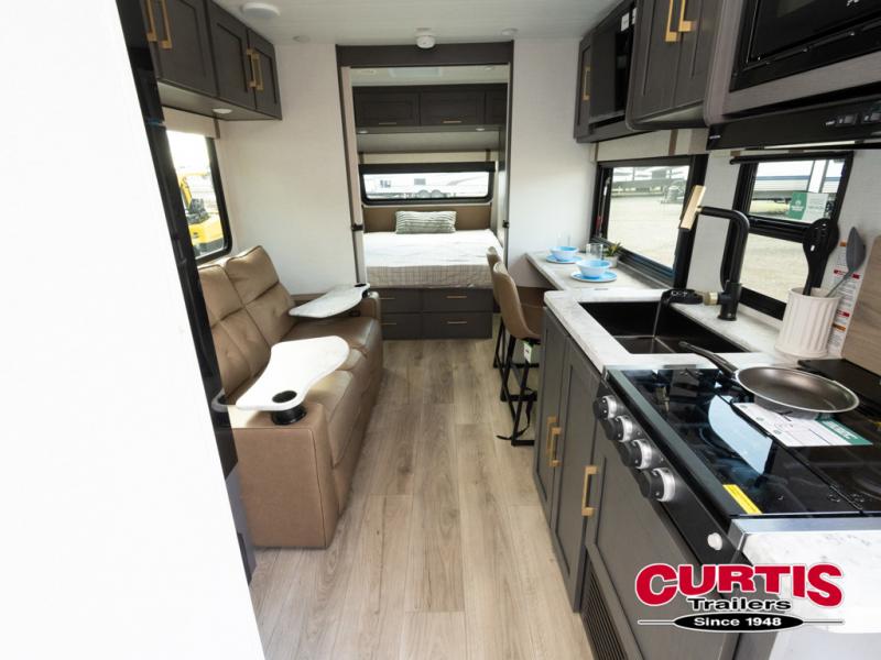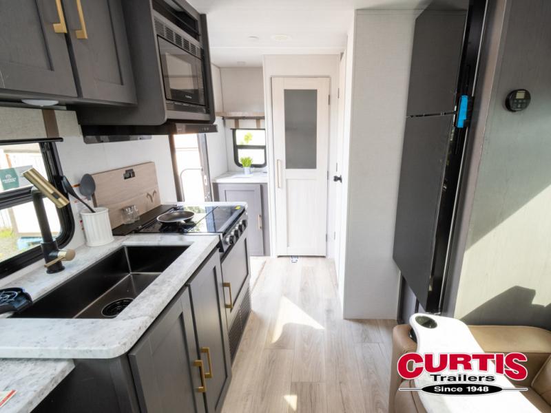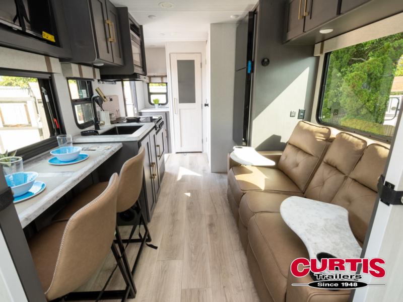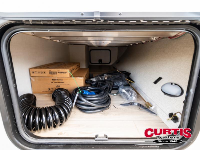 Wherever you decide to camp, you can be sure to have a great time in this cozy travel trailer. A front private bedroom will make you feel right at home, and there are dual bedroom wardrobes to keep your things organized. Once you've made breakfast on the interior cooktop or outside kitchen, you can enjoy your coffee on the theater seating or under the 16' awning. This unit also includes a walk-in pantry, a hutch with a shelf and overhead cabinets so nothing gets left behind!