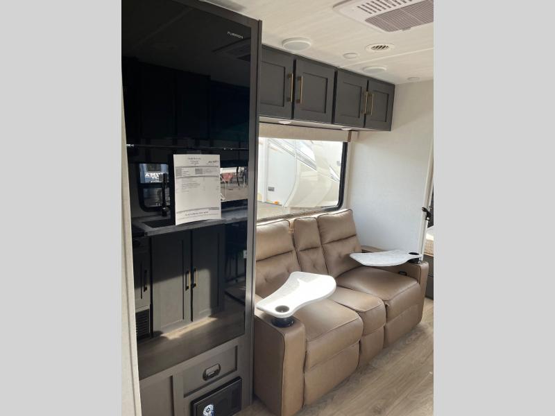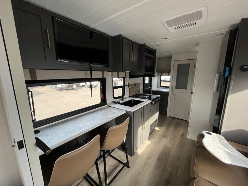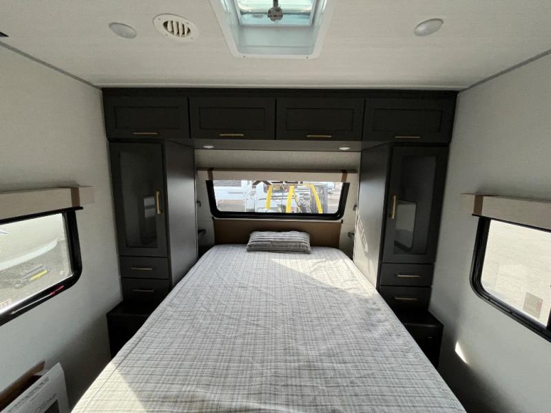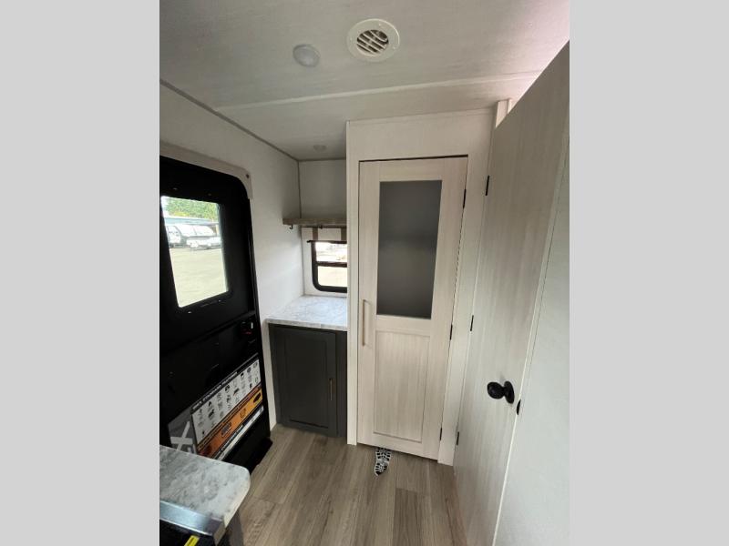 Wherever you decide to camp, you can be sure to have a great time in this cozy travel trailer. A front private bedroom will make you feel right at home, and there are dual bedroom wardrobes to keep your things organized. Once you've made breakfast on the interior cooktop or outside kitchen, you can enjoy your coffee on the theater seating or under the 16' awning. This unit also includes a walk-in pantry, a hutch with a shelf and overhead cabinets so nothing gets left behind!