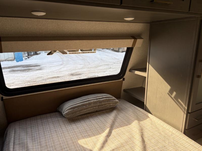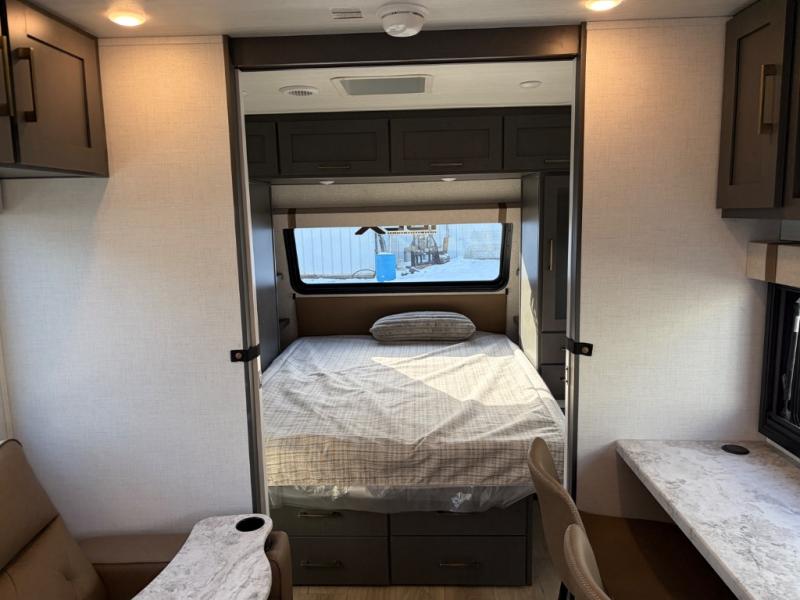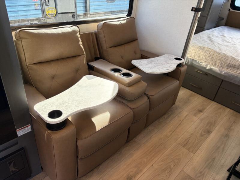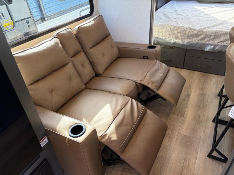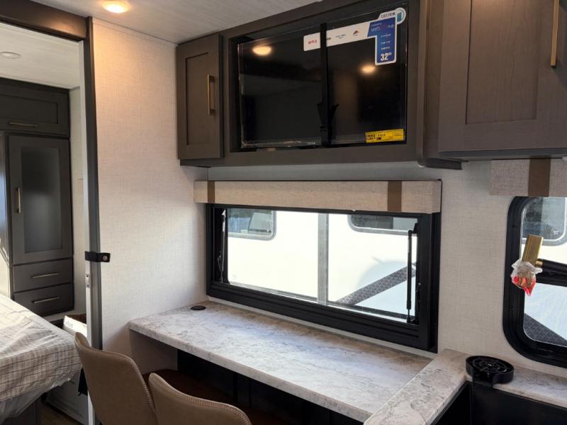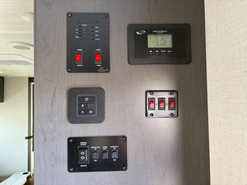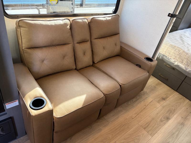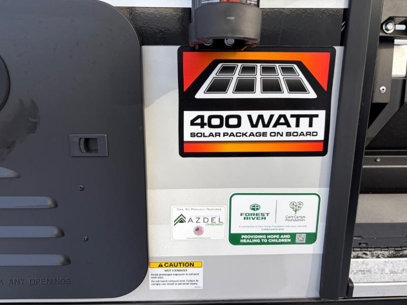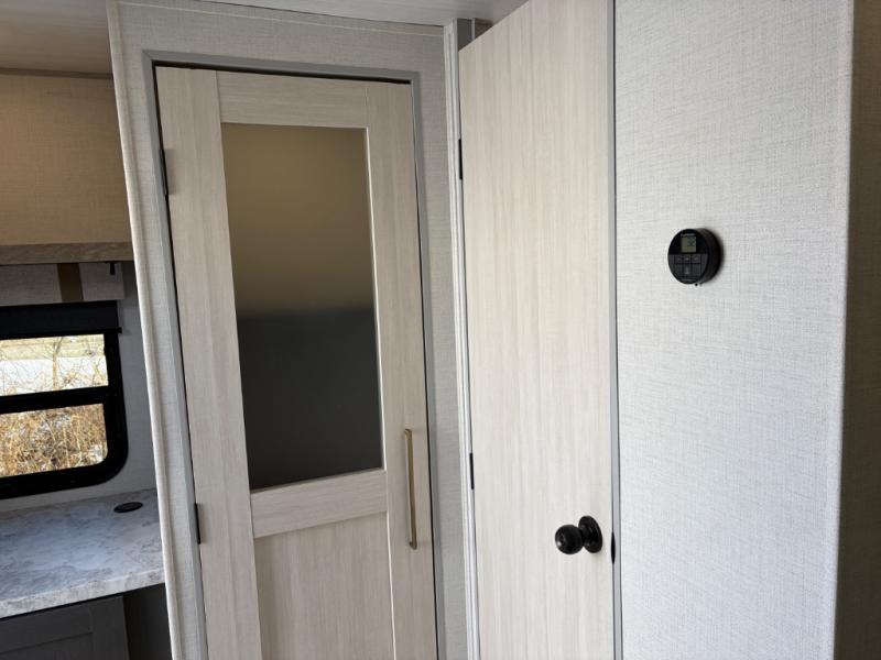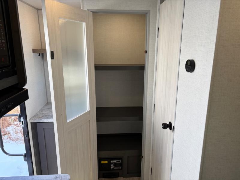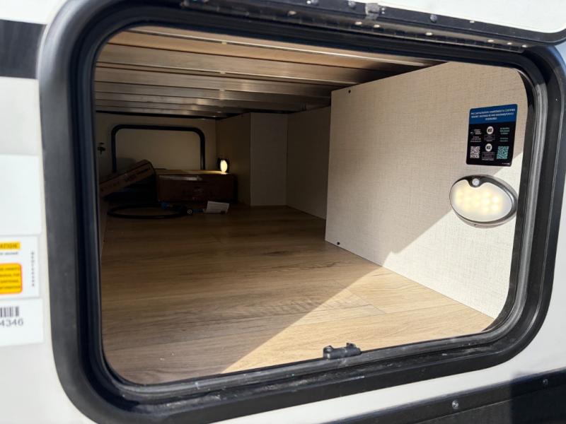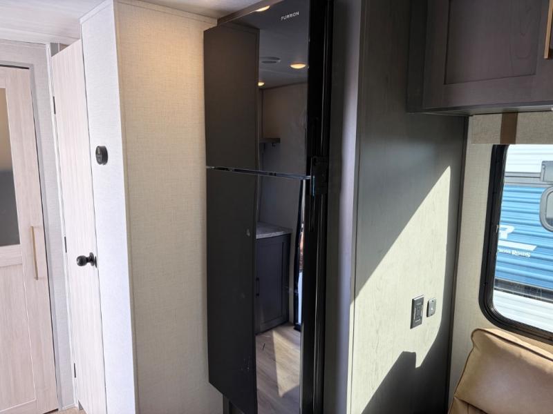Wherever you decide to camp, you can be sure to have a great time in this cozy travel trailer. A front private bedroom will make you feel right at home, and there are dual bedroom wardrobes to keep your things organized. Once you've made breakfast on the interior cooktop or outside kitchen with a grill, you can enjoy your coffee on the theater seating or under the 16' awning. This unit also includes a walk-in pantry, a hutch with a shelf and overhead cabinets so nothing gets left behind. When the optional Black Canyon Beast Mode Package is chosen on this model, you'll find an independent suspension, an additional 200-watt solar panel, totaling 400 watts of solar, a Maxxair vent cover and more!
