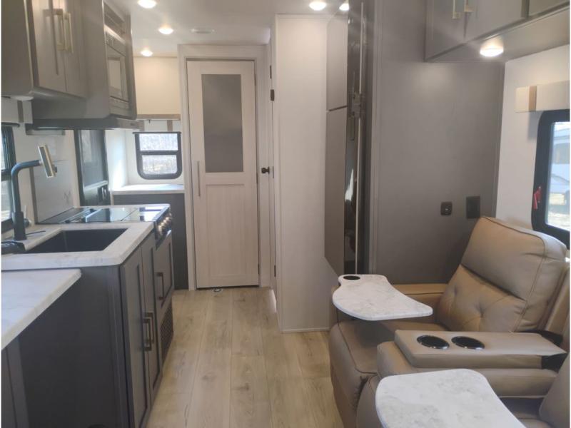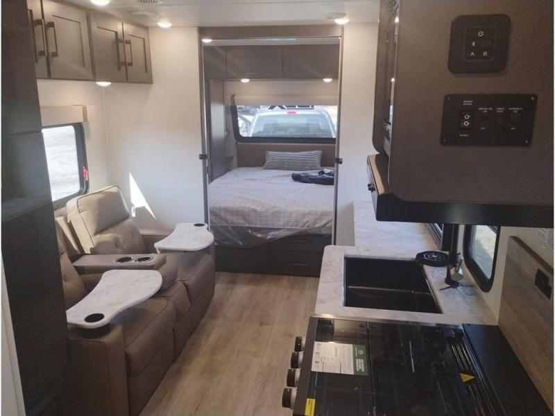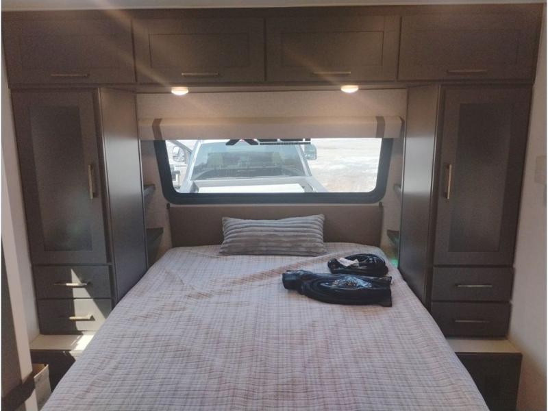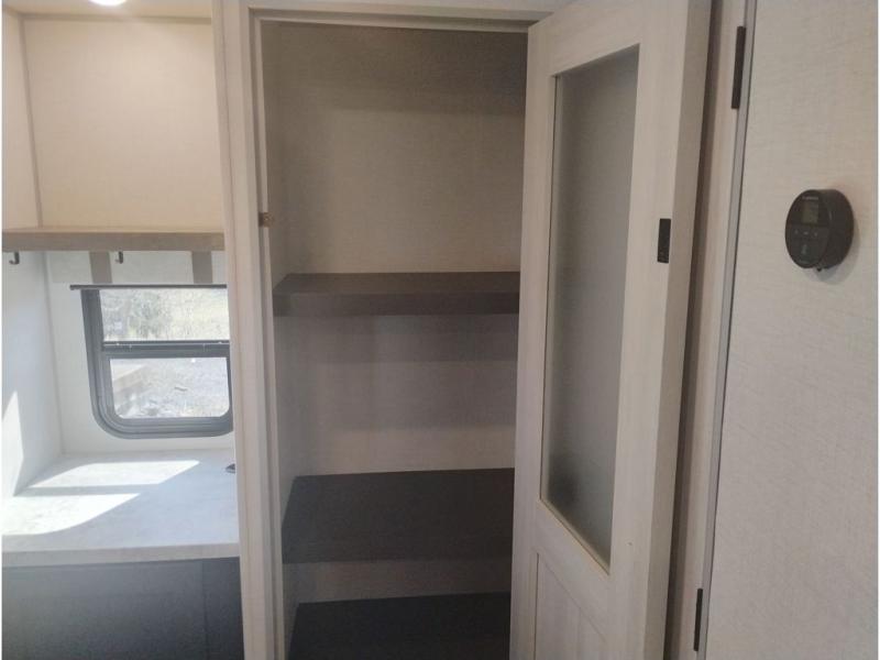 Wherever you decide to camp, you can be sure to have a great time in this cozy travel trailer. A front private bedroom will make you feel right at home, and there are dual bedroom wardrobes to keep your things organized. Once you've made breakfast on the interior cooktop or outside kitchen with a grill, you can enjoy your coffee on the theater seating or under the 16' awning. This unit also includes a walk-in pantry, a hutch with a shelf and overhead cabinets so nothing gets left behind. When the optional Black Canyon Beast Mode Package is chosen on this model, you'll find an independent suspension, an additional 200-watt solar panel, totaling 400 watts of solar, a Maxxair vent cover and more!
