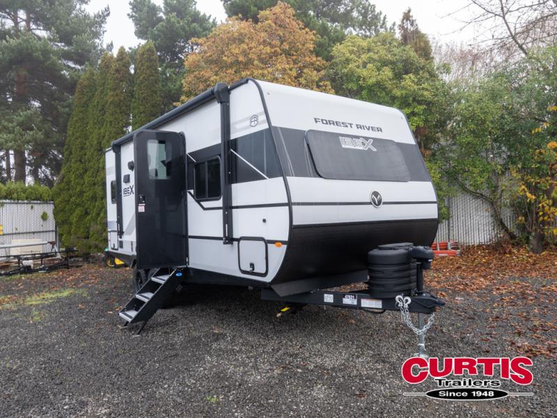 The Forest River IBEX travel trailers are extended season ready, and adventure approved! They are built with a fully walkable PVC roof, a welded aluminum structure, and laminated walls and slide outs with Azdel composite panels. There are also all-terrain tires with TPMS, a hot and cold exterior spray port, and large holding tanks for added convenience when you're set up off-grid. The USB-C ports inside and out will help you keep your electronics charged, and the premium window treatments will make your trailer feel more like home. The optional Black Canyon Beast Mode Package is available with an independent suspension, a 400-watt solar package, a fresh water filter, and a Maxxair roof vent cover.