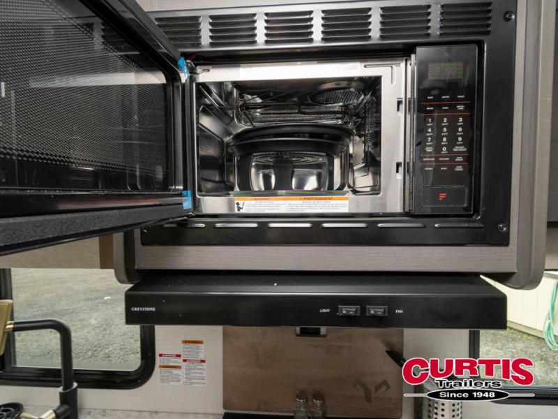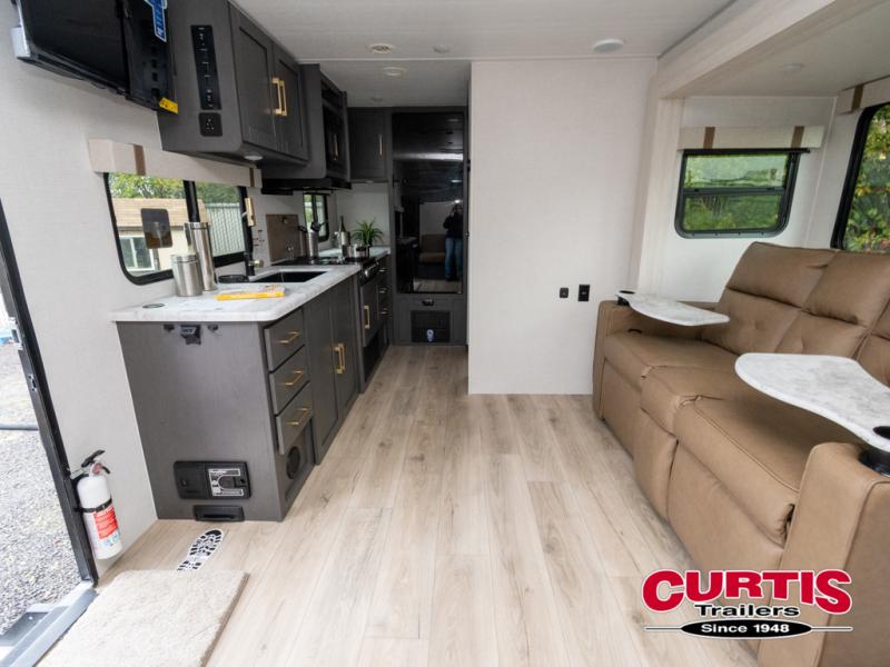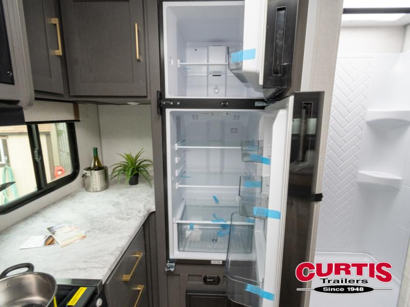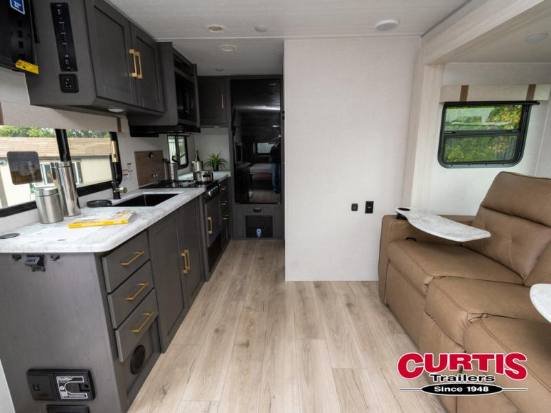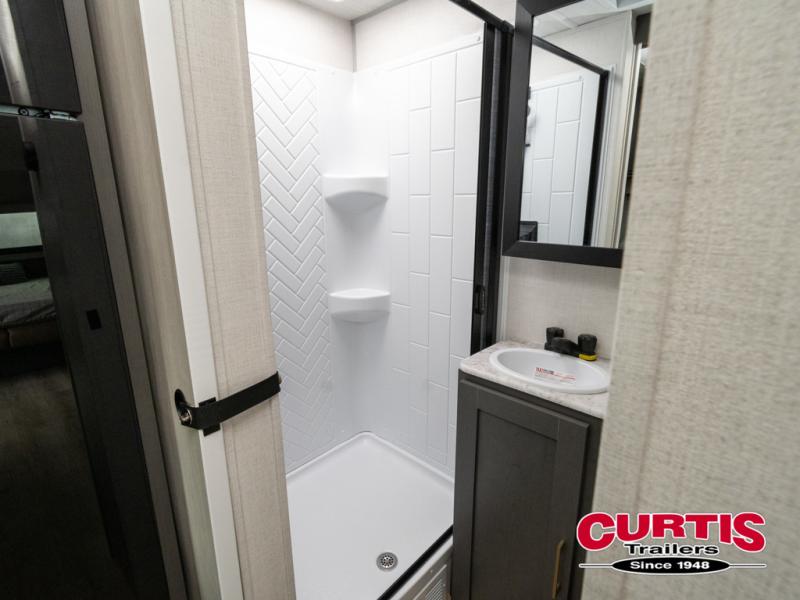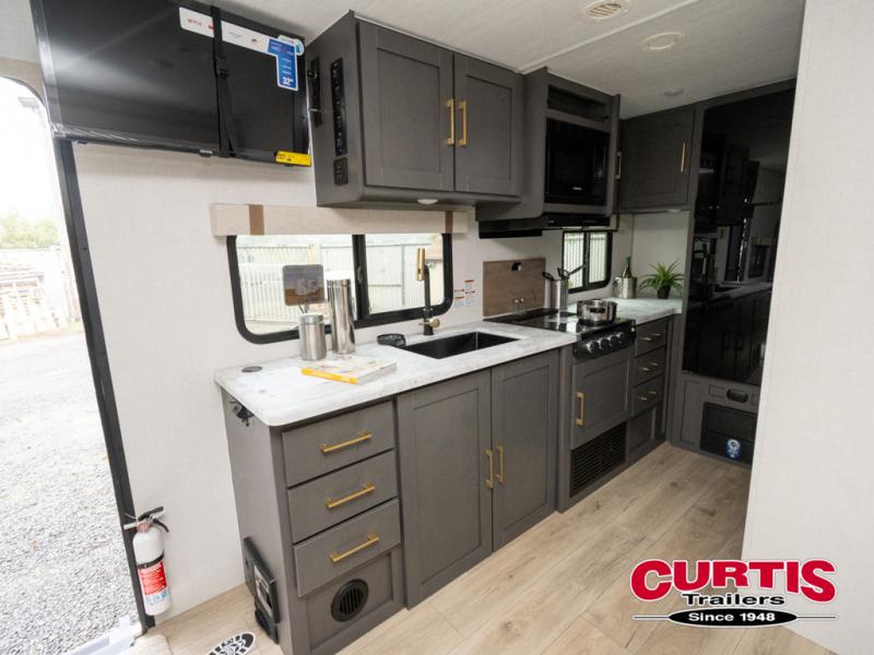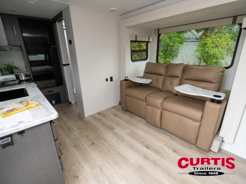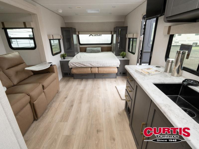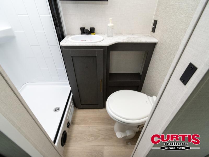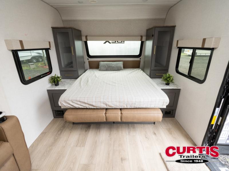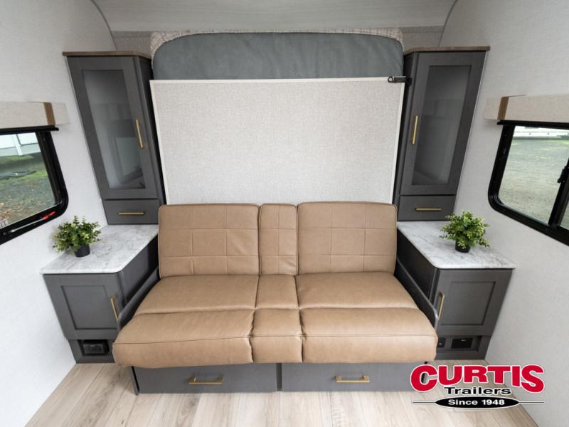 This Forest River IBEX travel trailer has a clever use of space that gives you a lot of options. The kitchen features ample counter space to prep meals, and you can relax on the sofa slide out after dinner. When it's time for bed, there's a 60" x 80" Murphy bed which will be super comfortable for a good night's sleep! The rear corner bath has a roomy shower to freshen up each day, along with a toilet, sink, and medicine cabinet.