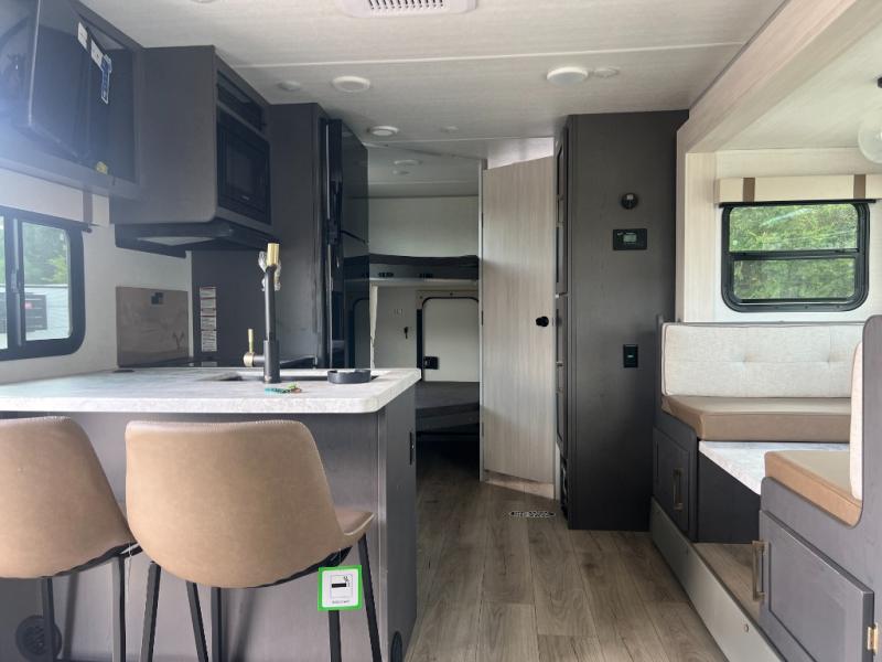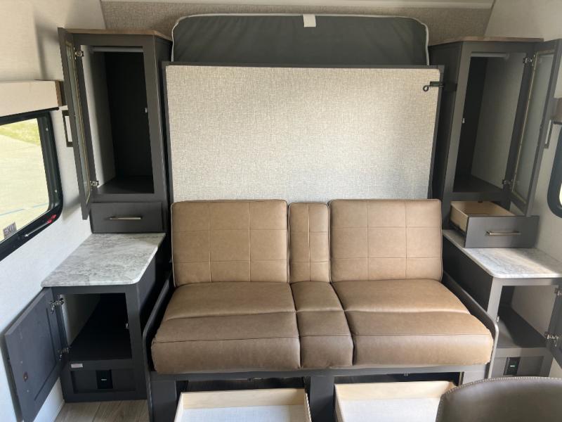 The 23MBH is a spacious, family-friendly travel trailer that combines comfort and versatility. A front Murphy bed converts to a sofa for added living space, while rear double bunks provide room for guests or kids. The slide-out dinette expands the interior, and the full kitchen—with microwave, air fryer, and pantry—makes meals easy. A full bath adds comfort, and exteriors features like an enclosed underbelly and 16' awnings keep you ready for adventure.
