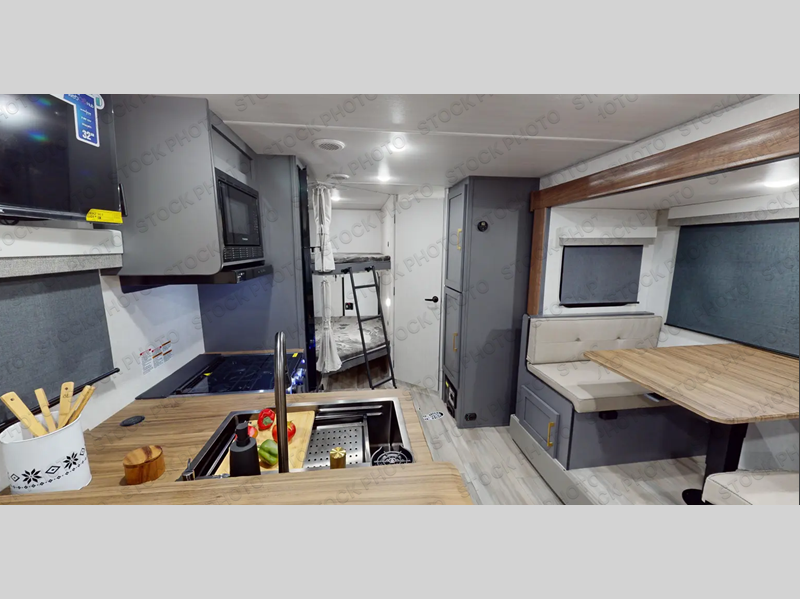 This Forest River IBEX travel trailer has a clever use of space that gives you a lot of options. The kitchen includes an all-in-one microwave and air fryer to cook meals plus a pantry and refrigerator for food storage. When it's time for bed, there's a 60" x 80" Murphy bed which will be super comfortable for a good night's sleep, and the little ones can claim the double-size bunks towards the back. A full bath onboard means you won't have to use the camp's facilities at night, and you'll find plenty of storage throughout this unit for all your gear!