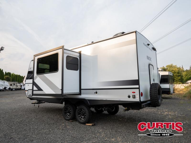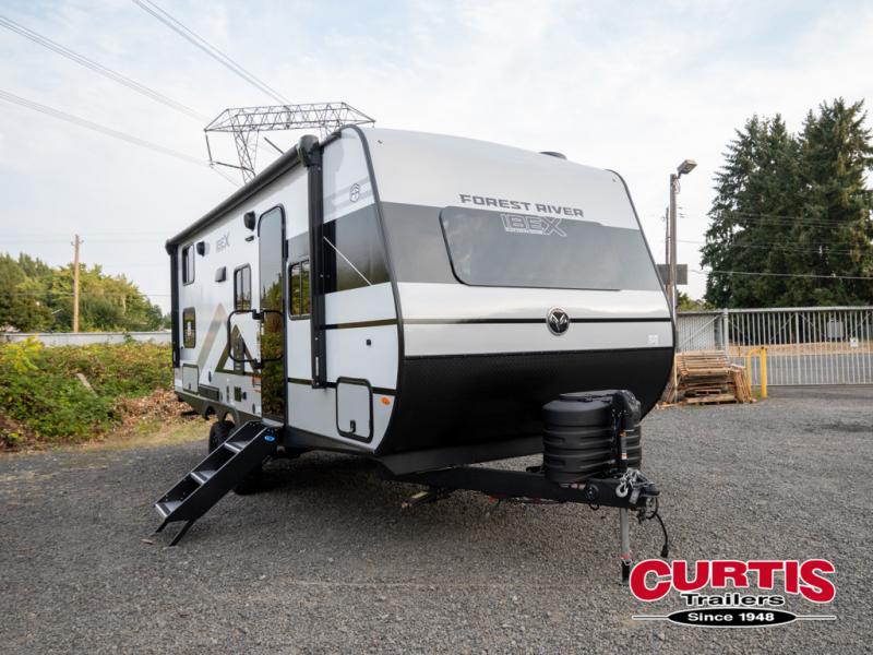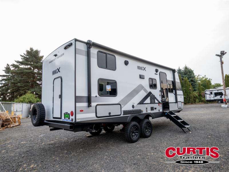 The Forest River IBEX travel trailers are extended season ready, and adventure approved! They are built with a fully walkable PVC roof, a welded aluminum structure, and laminated walls and slide outs with Azdel composite panels. There are also all-terrain tires with TPMS, a hot and cold exterior spray port, and large holding tanks for added convenience when you're set up off-grid. The USB-C ports inside and out will help you keep your electronics charged, and the premium window treatments will make your trailer feel more like home. The optional Black Canyon Beast Mode Package is available with an independent suspension, a 400-watt solar package, a fresh water filter, and a Maxxair roof vent cover.