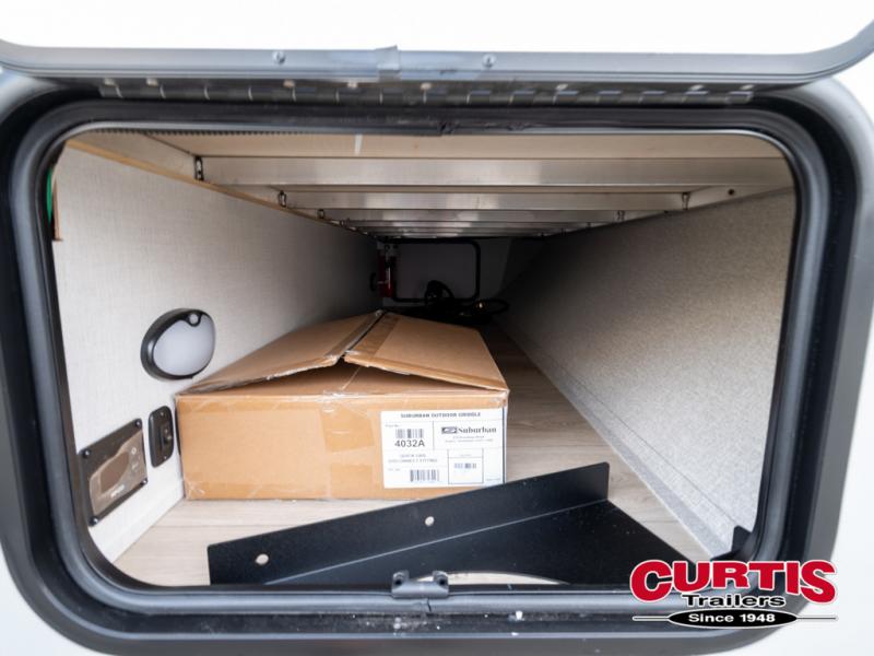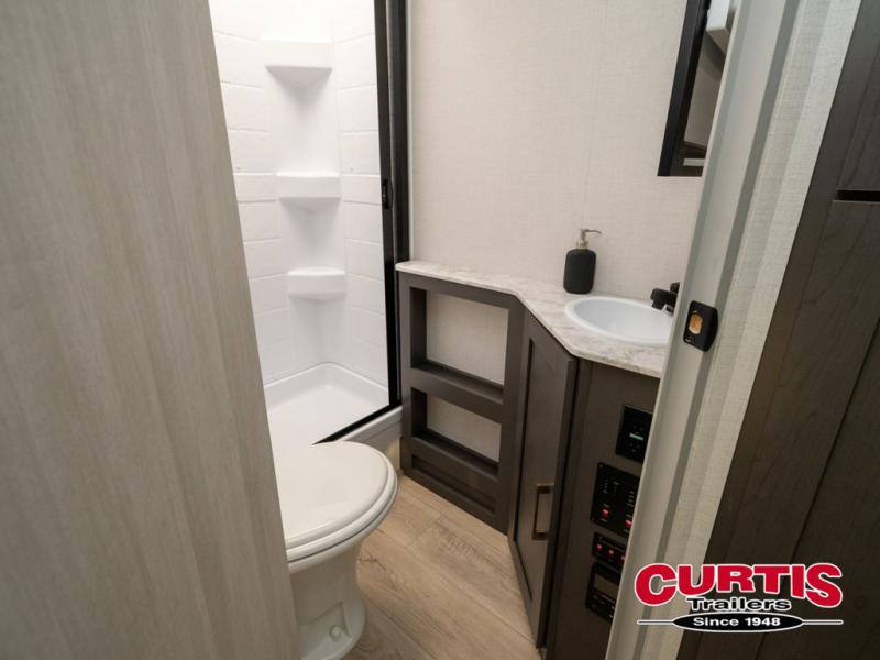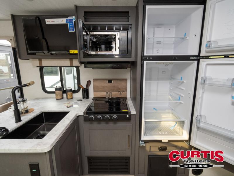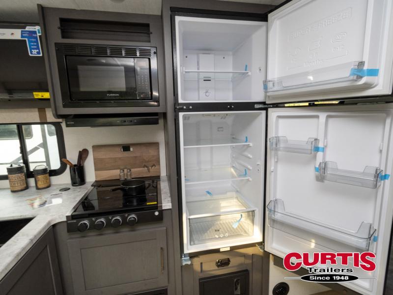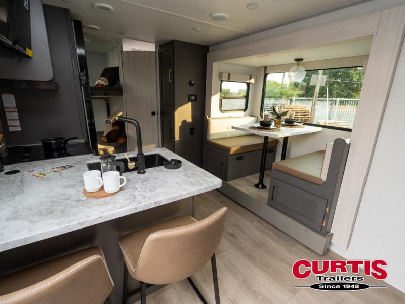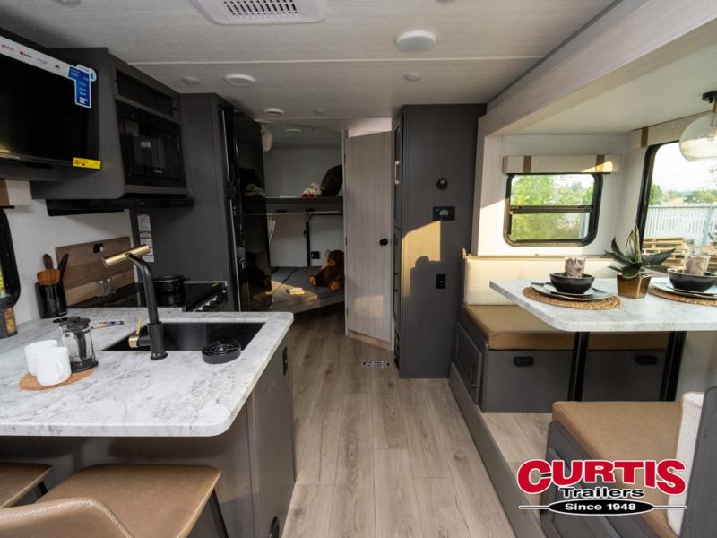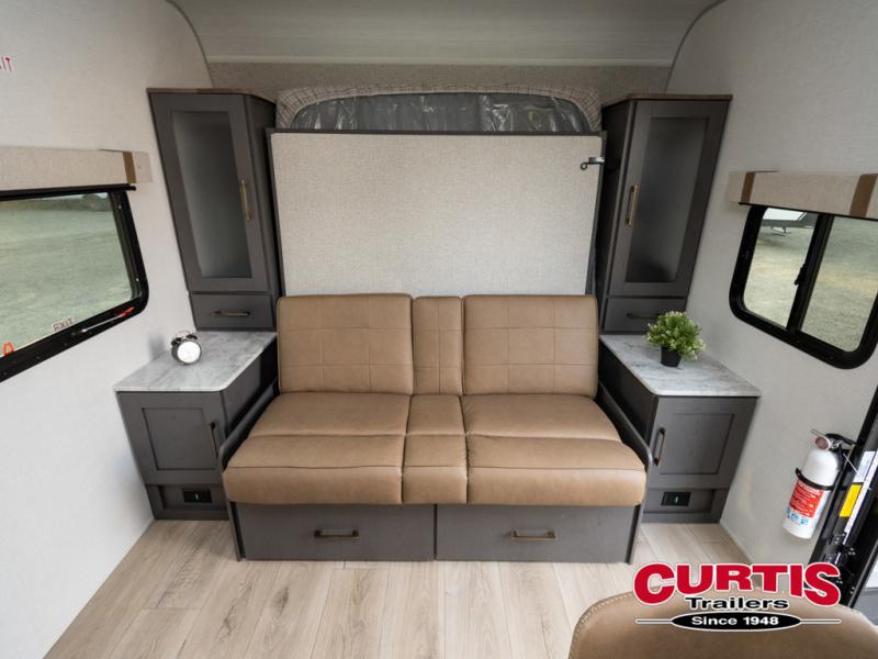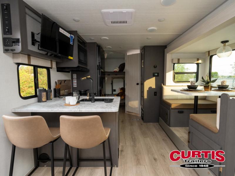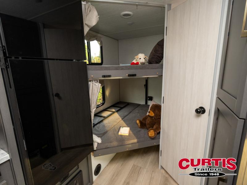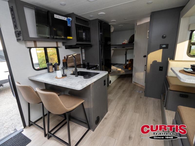 This Forest River IBEX travel trailer has a clever use of space that gives you a lot of options. The kitchen includes microwave air fryer to cook meals plus a pantry and refrigerator for food storage. When it's time for bed, there's a 60" x 80" Murphy bed which will be super comfortable for a good night's sleep, and the little ones can claim the double-size bunks towards the back. A full bath onboard means you won't have to use the camp's facilities at night, and you'll find plenty of storage throughout this unit for all your gear!