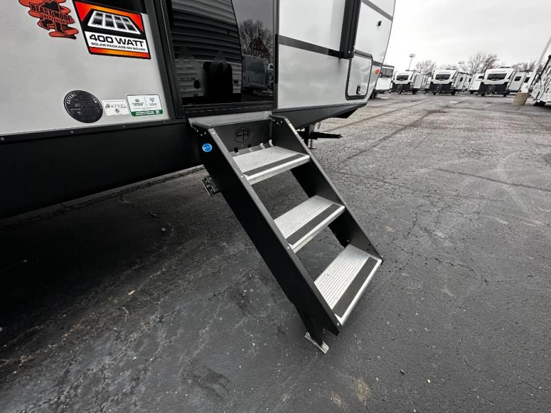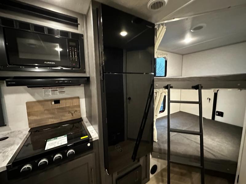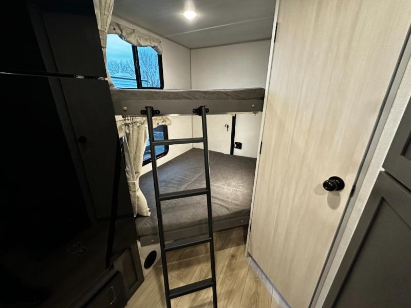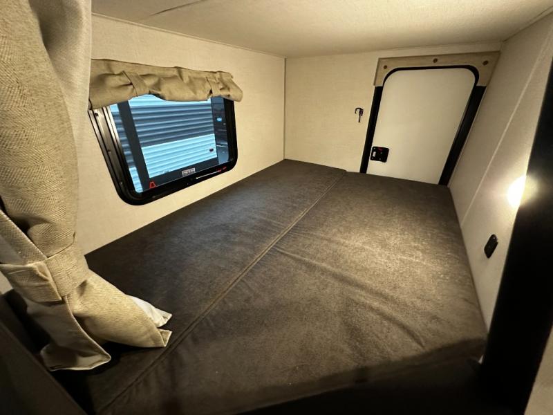 Step inside to a bright, modern interior featuring a mid-bunk floorplan that maximizes sleeping space without sacrificing living comfort. The private bunkhouse is perfect for kids, guests, or extra storage, while the open main living area offers a welcoming place to relax after a day outdoors. Large windows bring in natural light and create an open, airy feel throughout.