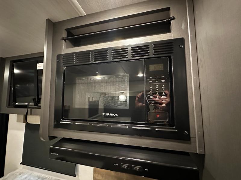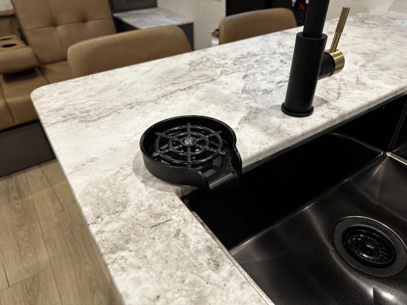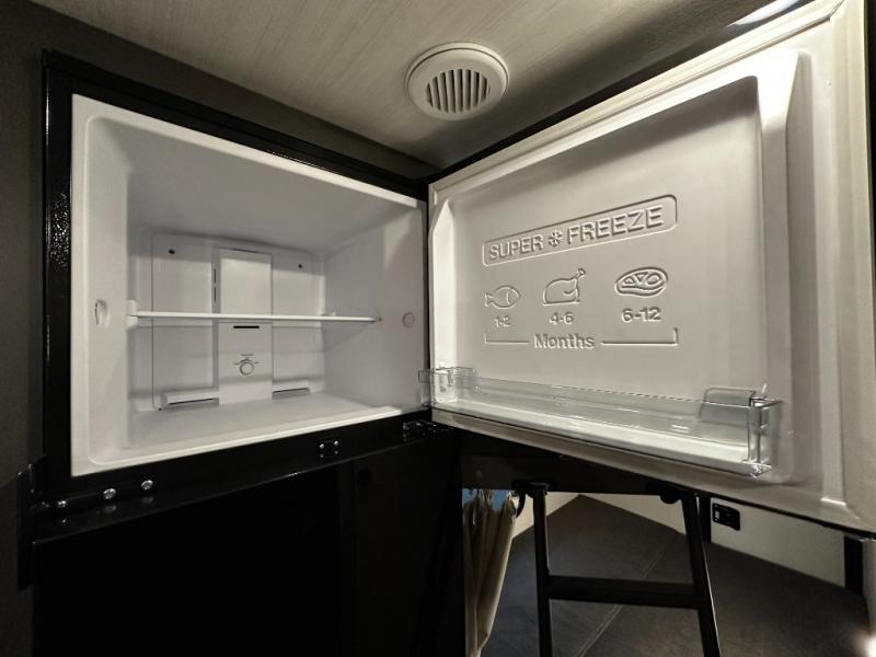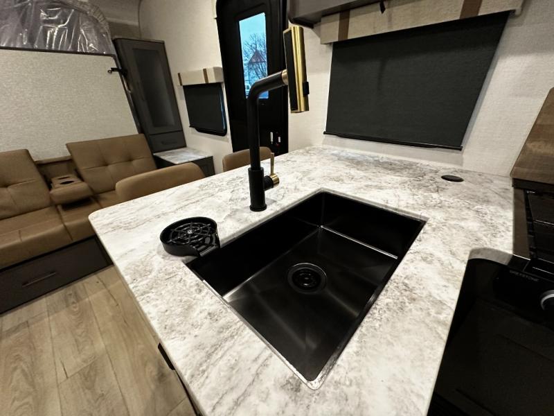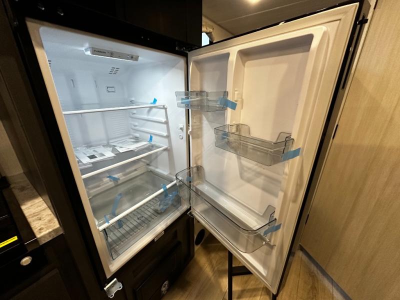 The kitchen is designed for convenience and efficiency, equipped with solid-surface countertops, a residential-style refrigerator, a three-burner cooktop, microwave, and ample cabinet space. A comfortable dinette provides a versatile space for meals, games, or additional sleeping accommodations.