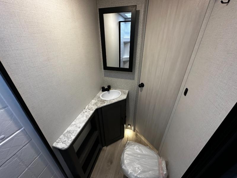 At the front, the private master bedroom offers a cozy retreat with a comfortable bed and overhead storage. The centrally located bathroom provides easy access for everyone, featuring a shower, vanity, and linen storage. Every inch of the IBEX 23MBH is thoughtfully designed to support real-life travel needs.