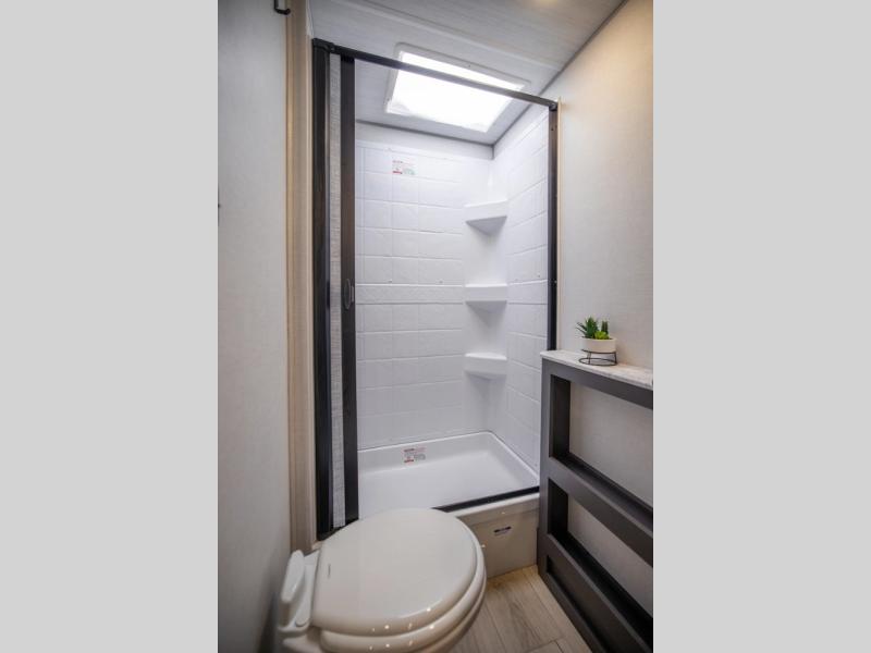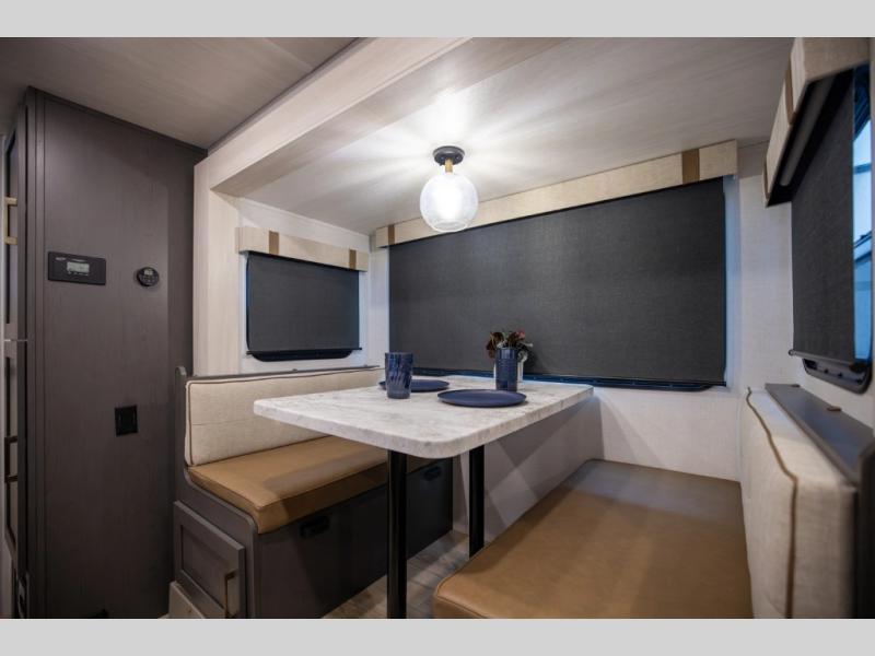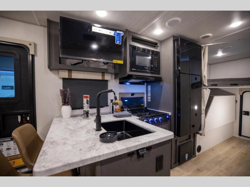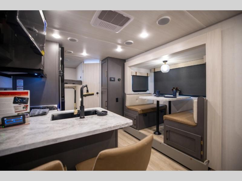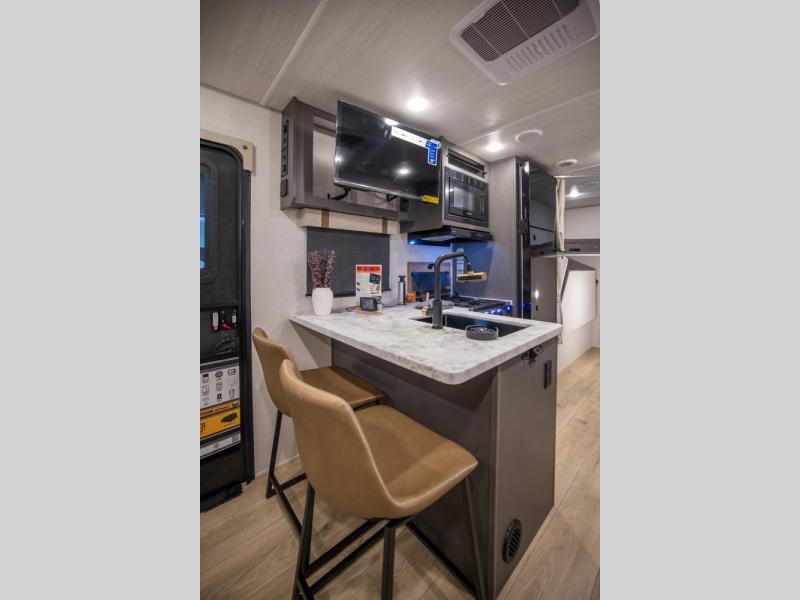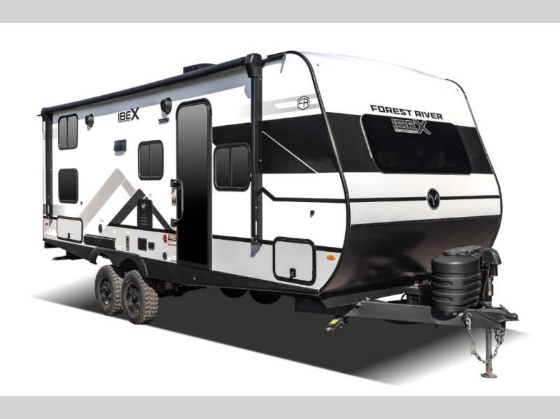 The Forest River IBEX travel trailers are extended season ready, and adventure approved! They are built with a sealed underbelly with forced heat and radiant foil barrier, along with an aluminum framed floor and 12V tank heaters. There are also all-terrain tires with TPMS, a 200-watt solar panel, a power tongue jack, and roof ladder prep. Inside, you'll love the Surf(X) seamless countertops and the large kitchen sink with a cup washer, plus there is Bluetooth audio with marine grade speakers so you can listen to your favorite tunes.