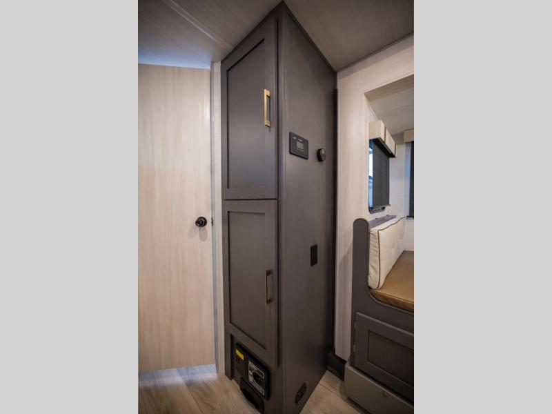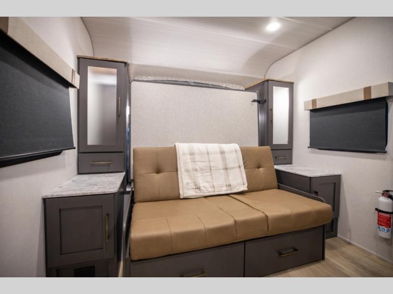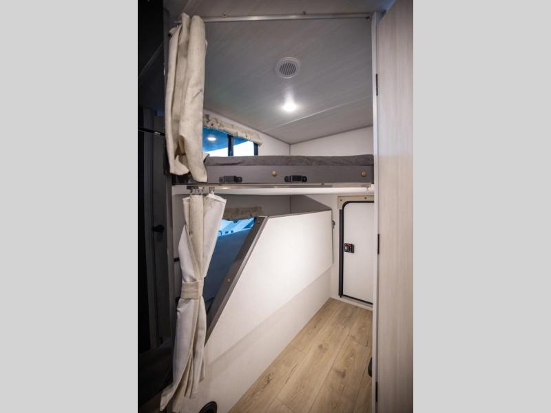 This travel trailer has a clever use of space that gives you a lot of options. The kitchen includes a microwave air fryer to cook meals plus a pantry and refrigerator for food storage. When it's time for bed, there's a 60" x 80" Murphy bed which will be super comfortable for a good night's sleep, and the little ones can claim the double-size bunks towards the back. A full bath onboard means you won't have to use the camp's facilities at night, and you'll find plenty of storage throughout this unit for all your gear! When the optional Black Canyon Beast Mode Package is chosen on this model, you'll find an independent suspension, an additional 200-watt solar panel, totaling 400 watts of solar, a 2000-watt inverter and more!