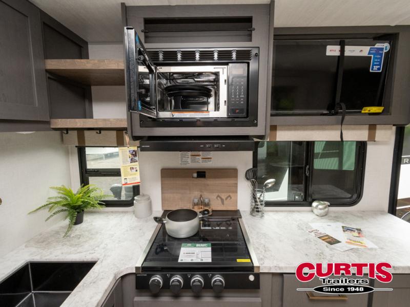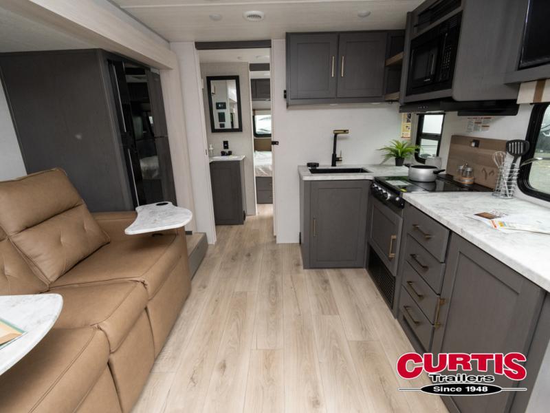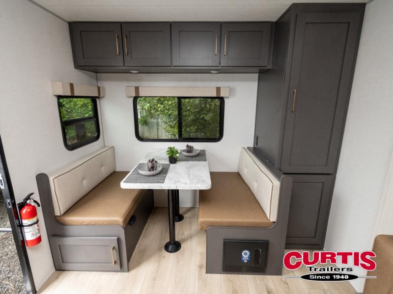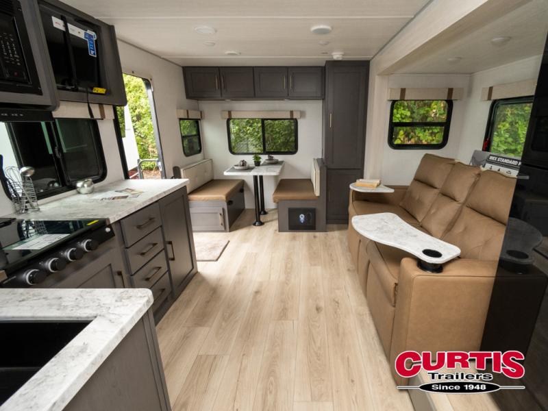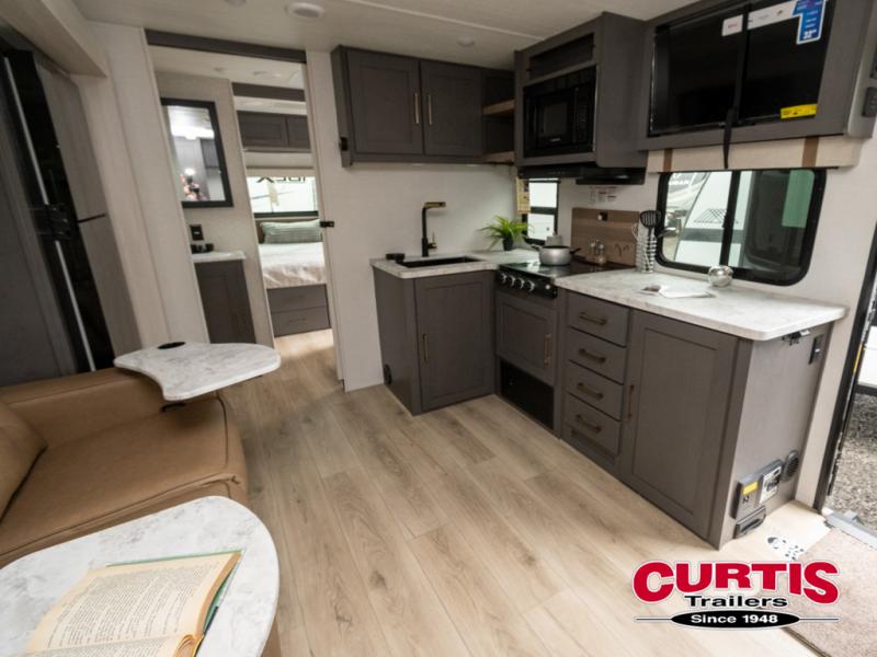 Camping trips to the lake just got sweeter in this single slide out travel trailer! There is a front master bedroom with a queen bed and dual wardrobes to keep your clothes organized, and the walk-thru bath is easily accessible. You can make meals each day with the microwave air fryer, and keep your food stocked up in the refrigerator and large pantry. After dinner, you can play a game at the rear booth dinette or relax on the sofa slide out if it's not a campfire night!