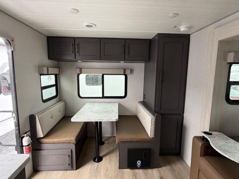 Camping trips to the lake just got sweeter in this single slide out travel trailer! There is a front master bedroom with a queen bed and dual wardrobes to keep your clothes organized, and the walk-thru bath is easily accessible. You can make meals each day with the microwave air fryer, and keep your food stocked up in the refrigerator and large pantry. After dinner, you can play a game at the rear booth dinette or relax on the sofa slide out if it's not a campfire night!