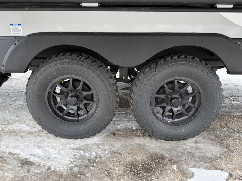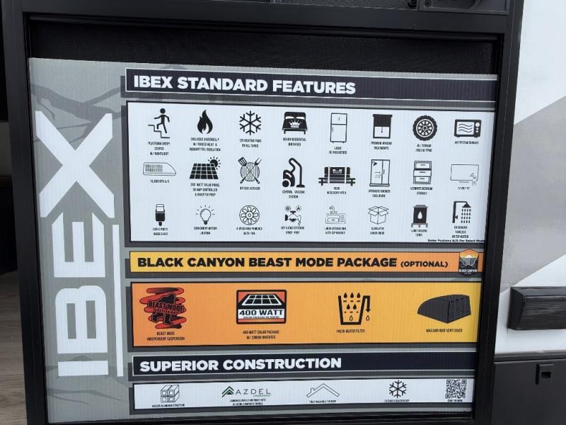 The Forest River IBEX travel trailers are extended season ready, and adventure approved! They are built with a fully walkable PVC roof, a welded aluminum structure, and laminated walls and slide outs with Azdel composite panels. There are also all-terrain tires with TPMS, a hot and cold exterior spray port, and large holding tanks for added convenience when you're set up off-grid. The USB-C ports inside and out will help you keep your electronics charged, and the premium window treatments will make your trailer feel more like home. The optional Black Canyon Beast Mode Package is available with an independent suspension, a 400-watt solar package, a fresh water filter, and a Maxxair roof vent cover.