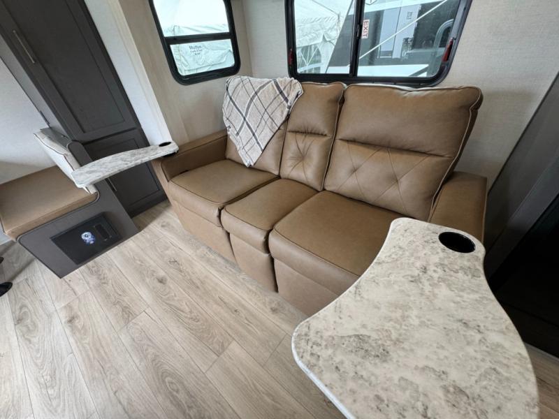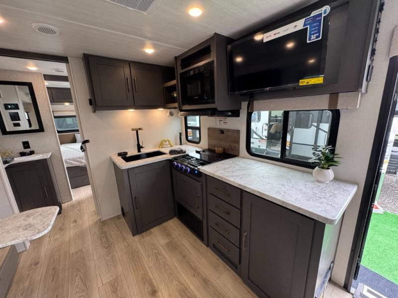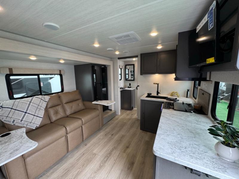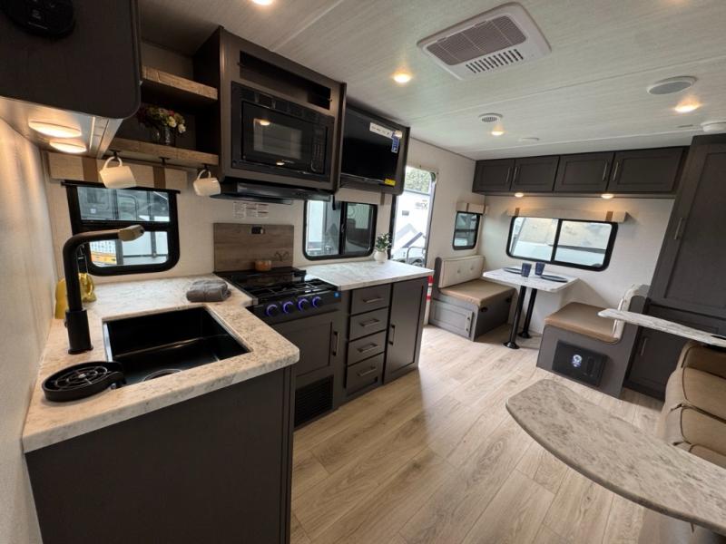 Camping trips to the lake just got sweeter in this single slide out travel trailer! There is a front master bedroom with a queen bed and dual wardrobes to keep your clothes organized, and the walk-thru bath is easily accessible. You can make meals each day with the microwave air fryer, and keep your food stocked up in the refrigerator and large pantry. After dinner, you can play a game at the rear booth dinette or relax on the sofa slide out if it's not a campfire night!