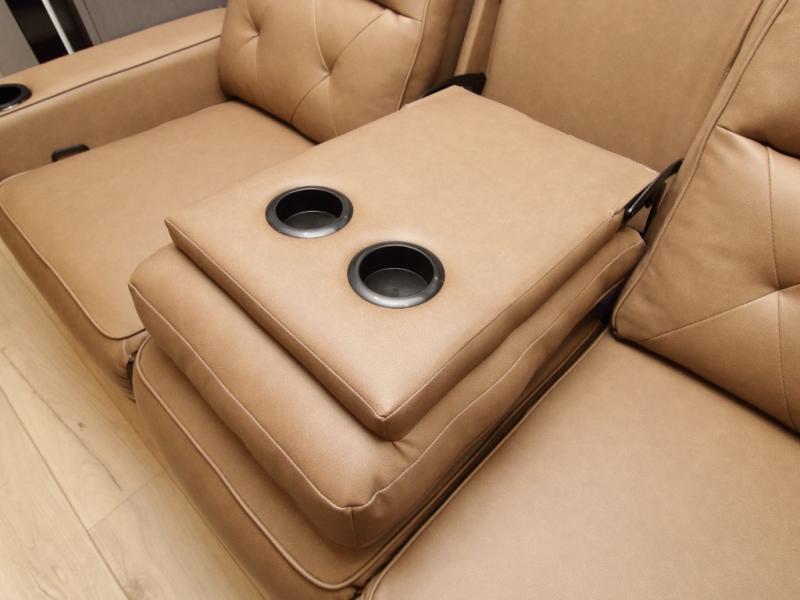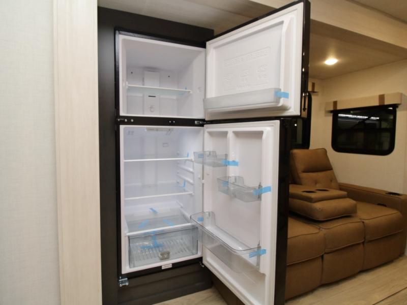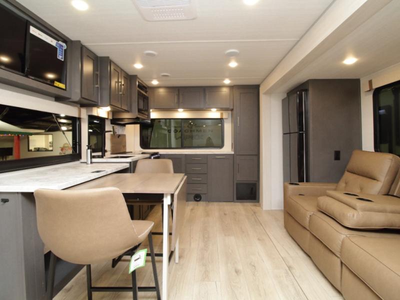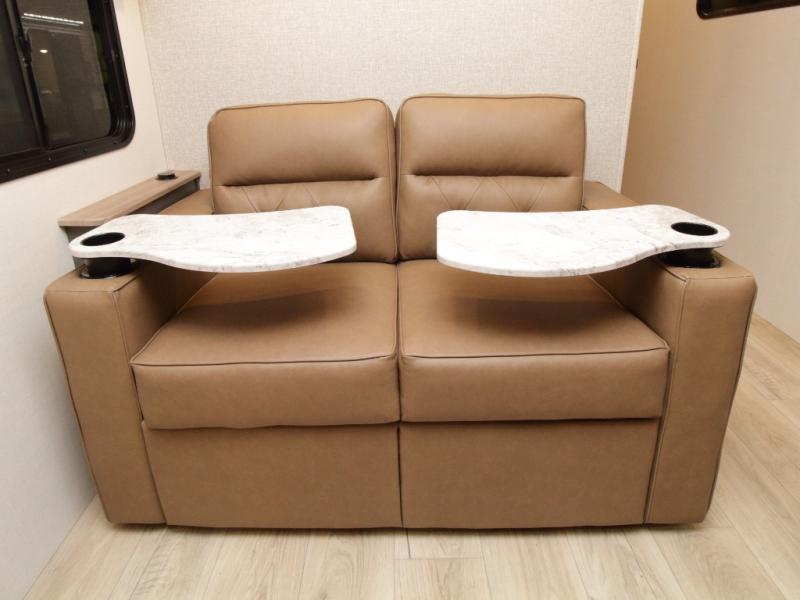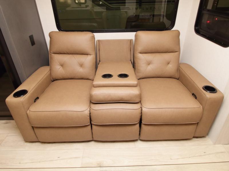 The rear kitchen layout gives you abundant counter space and functionality, perfect for prepping meals, setting out snacks, or hosting friends. With theater seating, a tri-fold sofa, and flexible dining space, there’s room for everyone to relax in comfort.