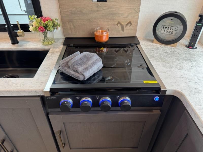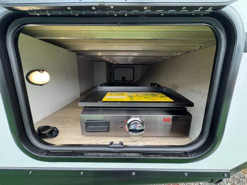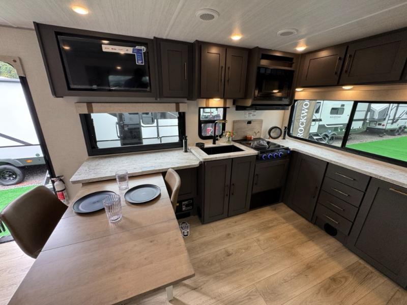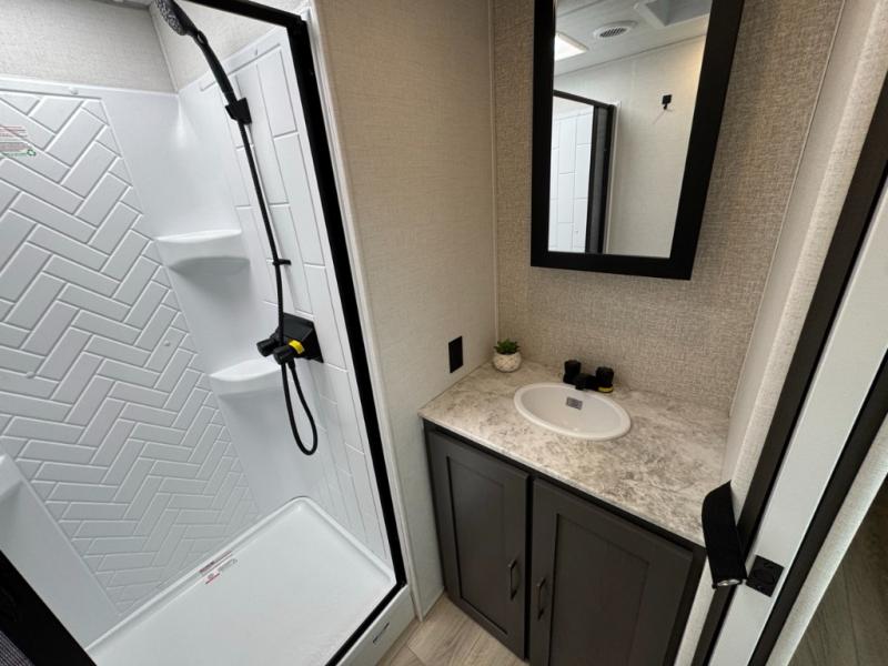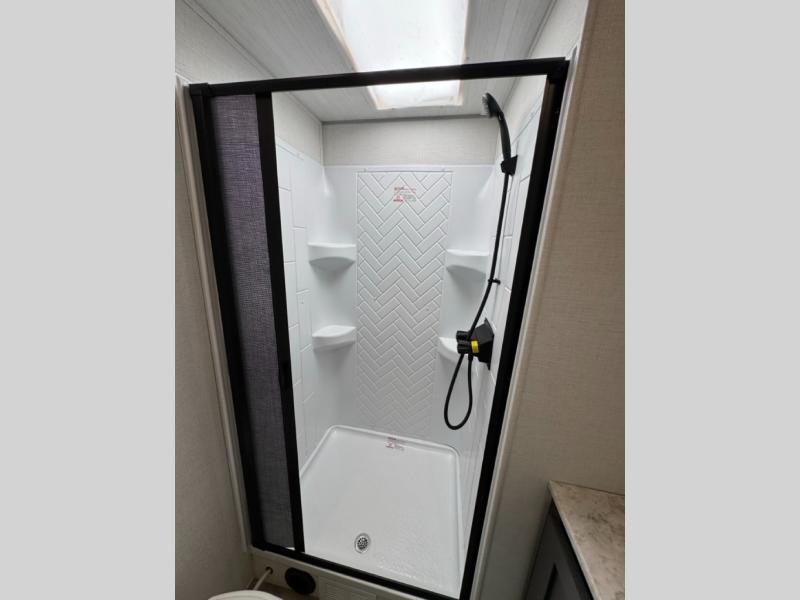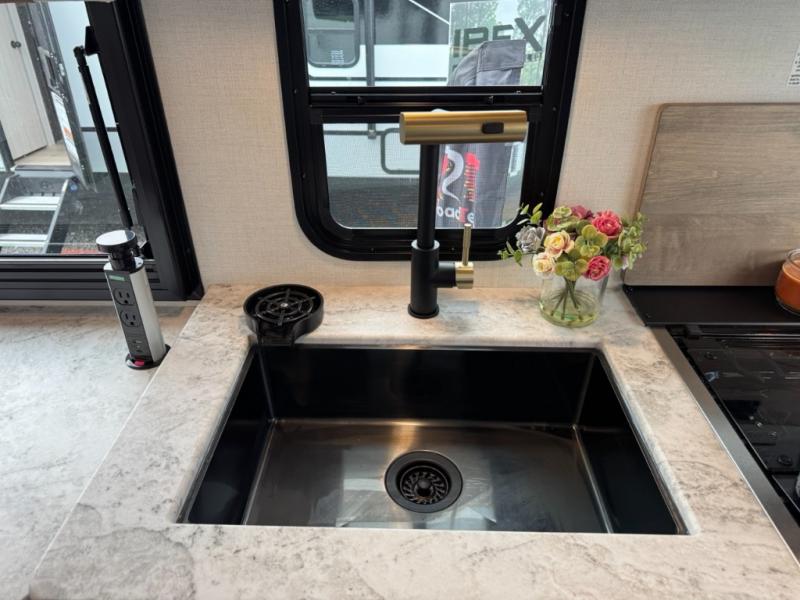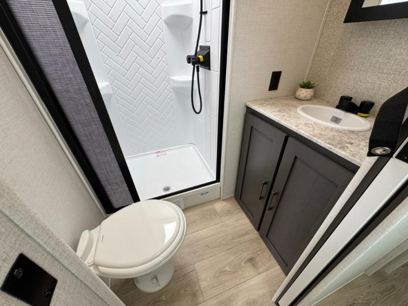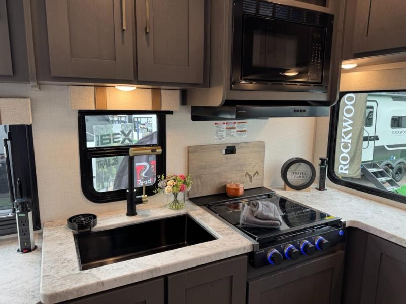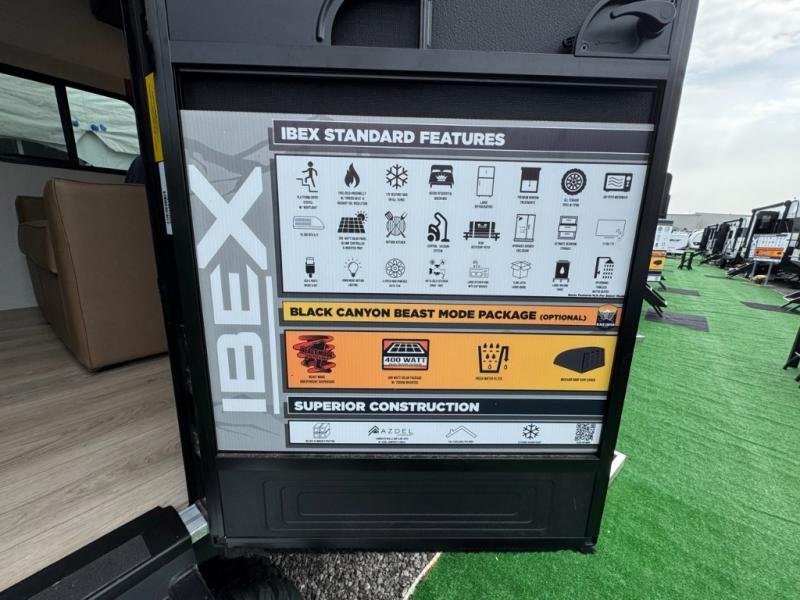 The Forest River IBEX travel trailers are extended season ready, and adventure approved! They are built with a fully walkable PVC roof, a welded aluminum structure, and laminated walls and slide outs with Azdel composite panels. There are also all-terrain tires with TPMS, a hot and cold exterior spray port, and large holding tanks for added convenience when you're set up off-grid. The USB-C ports inside and out will help you keep your electronics charged, and the premium window treatments will make your trailer feel more like home.