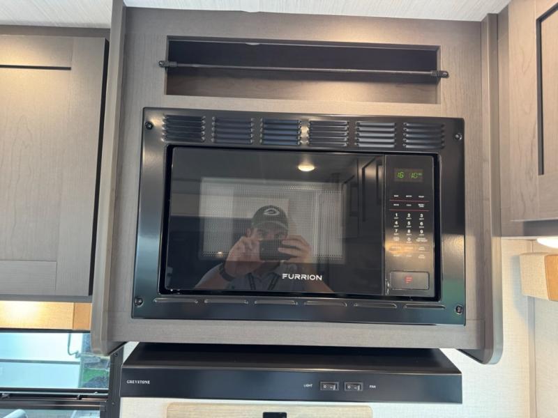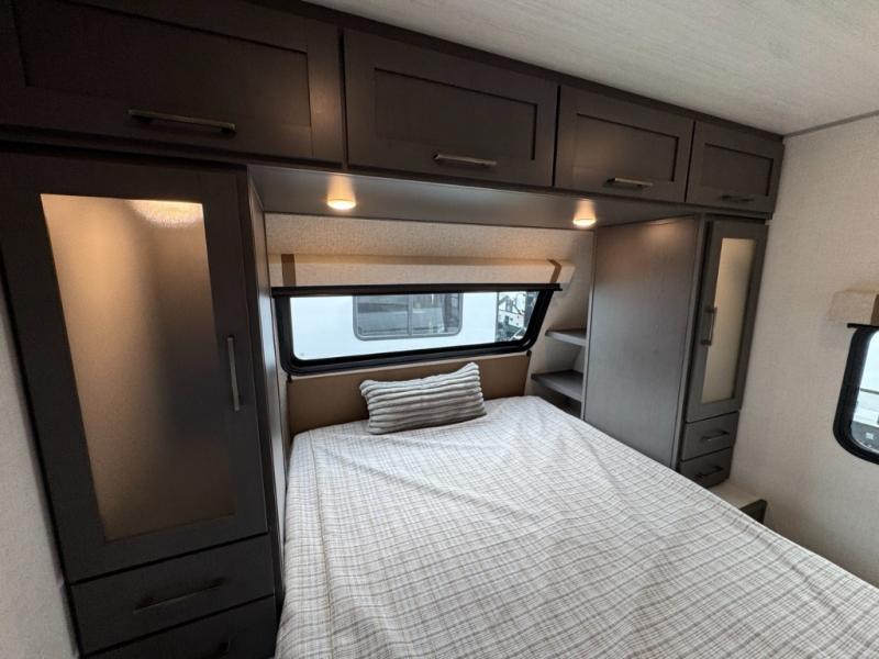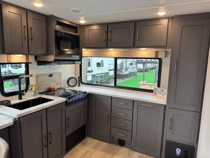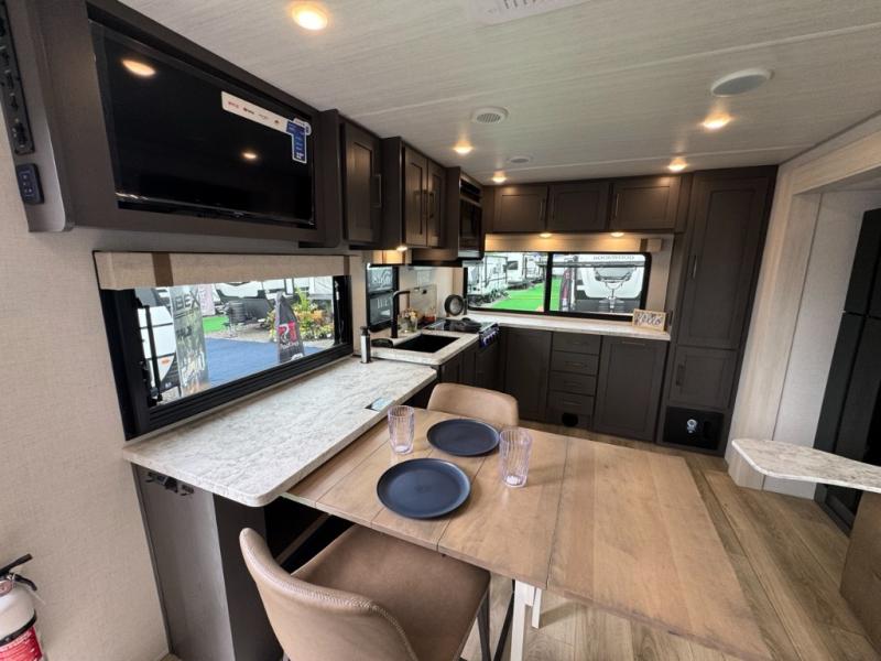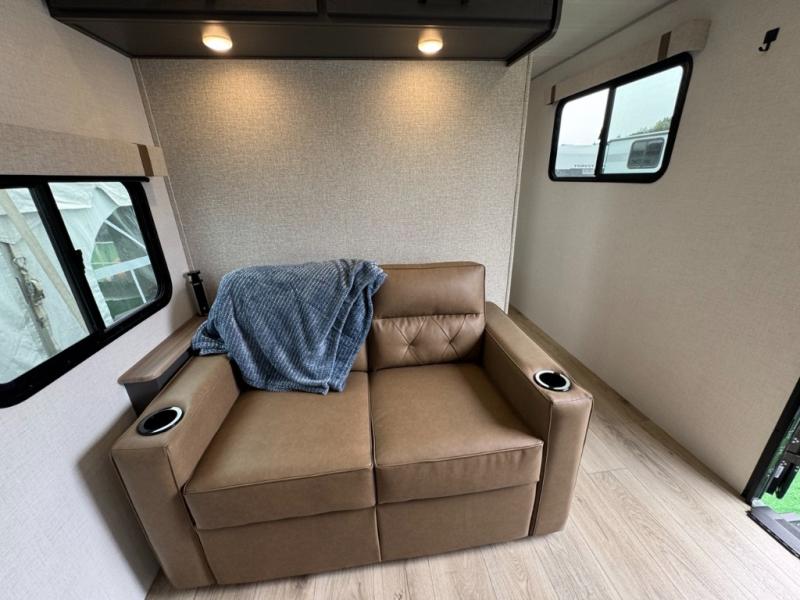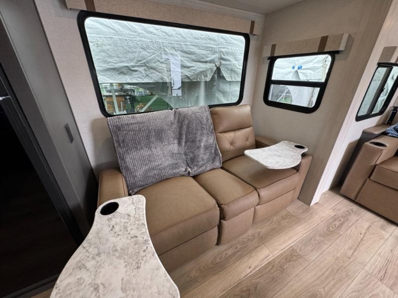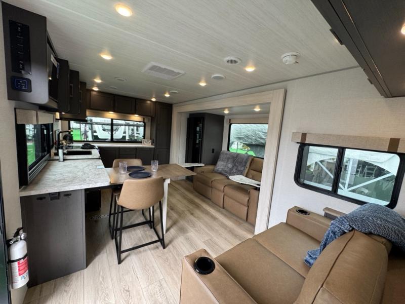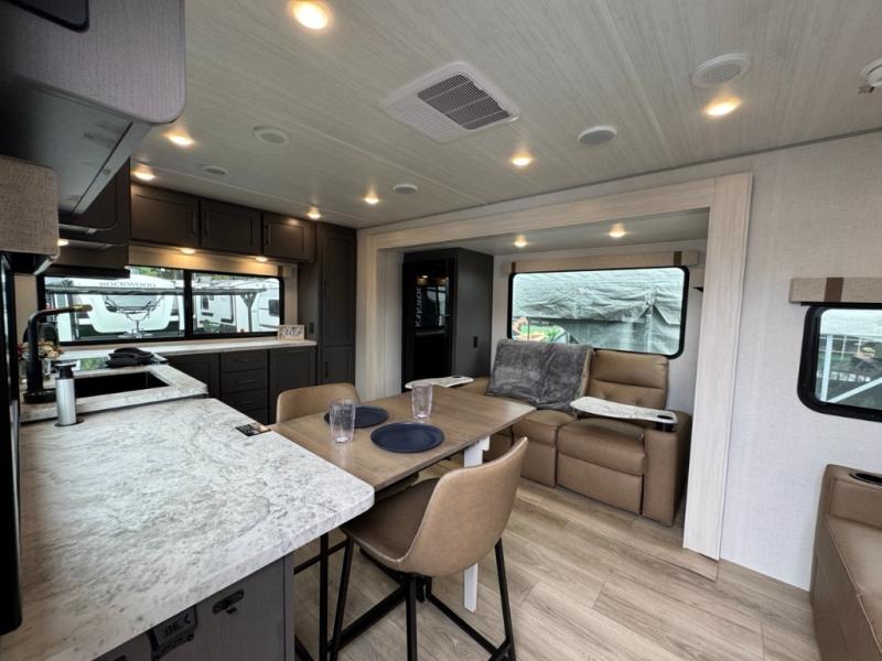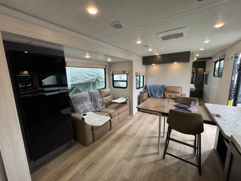 Pack your bags and head for the lake in this spacious travel trailer! Once you've set up camp, you can unload the slam latch cargo doors with pass-thru lighting, then start lunch on the outside kitchen. If you don't want to eat outdoors, there is a Bar 2 Table pull-out dinette table, theater seating, and a tri-fold sofa for ample seating spaces. The flip-up window in front of the dinette will give you a great view as you enjoy your coffee each morning, and the full bath onboard will let you freshen up after a day of hiking. This unit also includes a rear kitchen with ample counter space, plus a front private bedroom, complete with a queen bed, dual wardrobes, and washer/dryer prep!