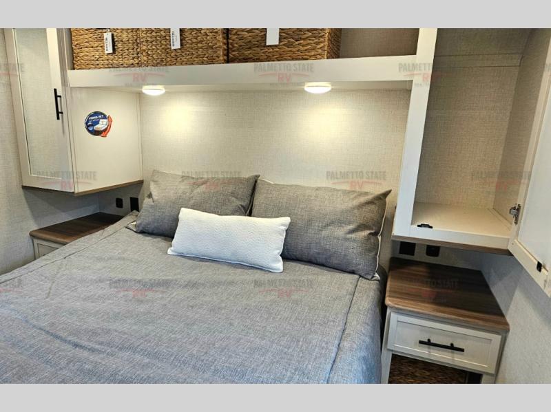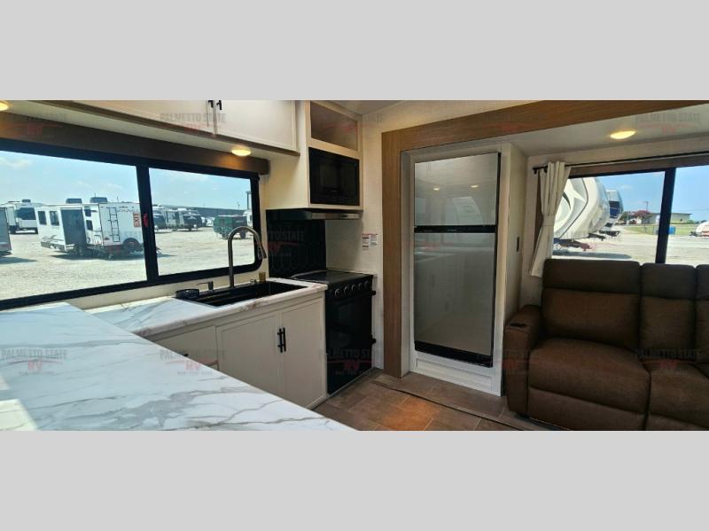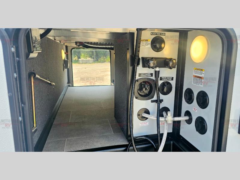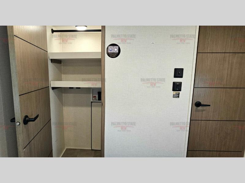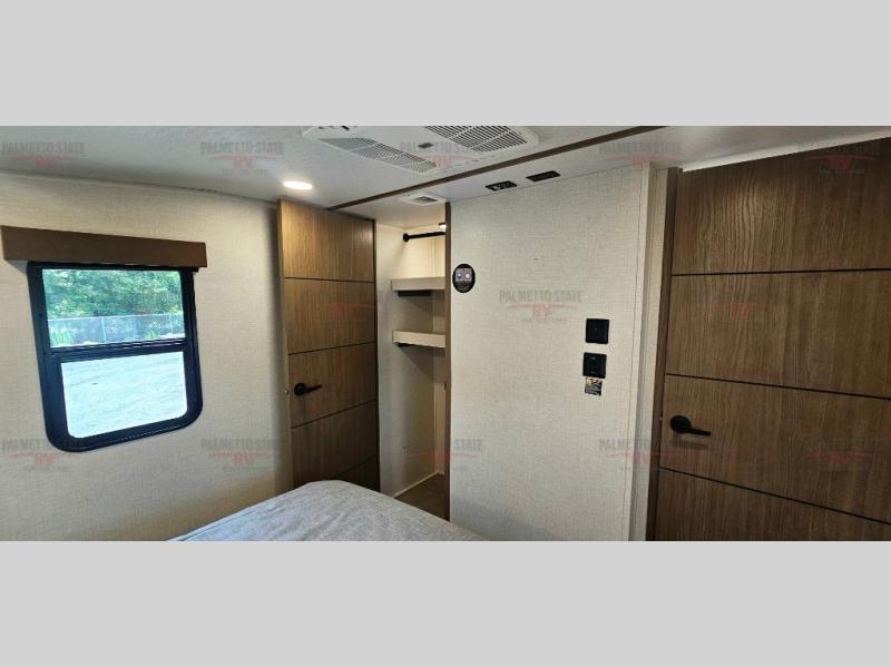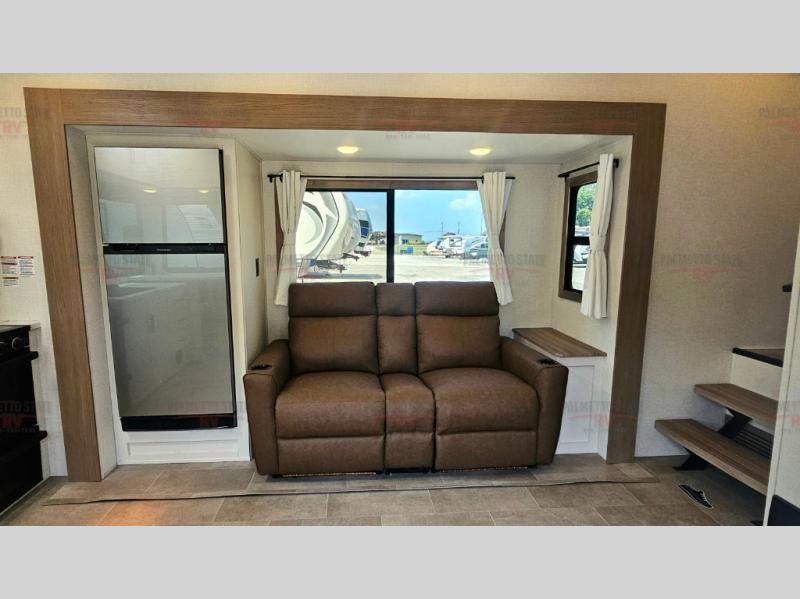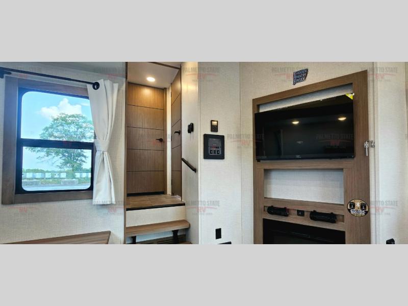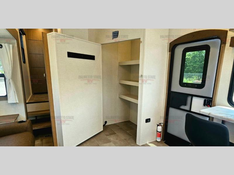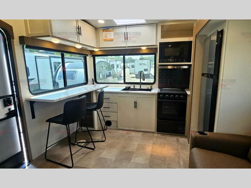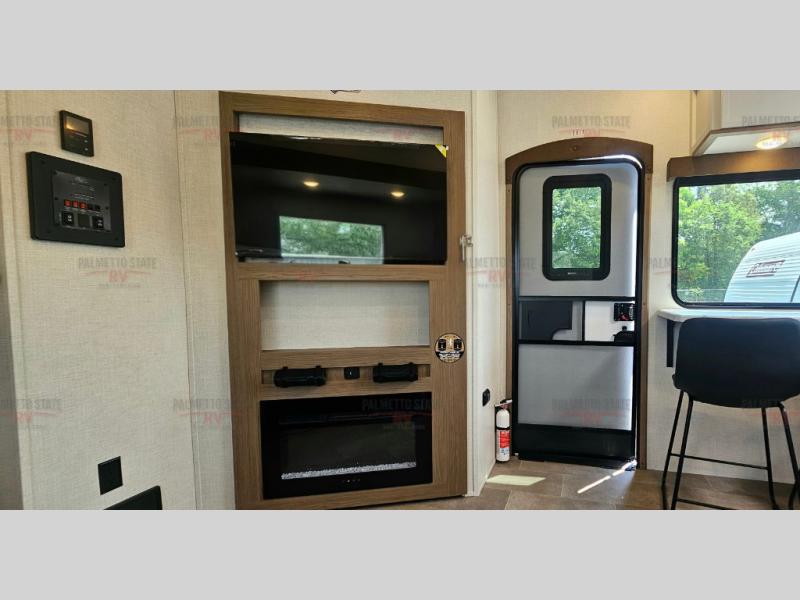 This unit is a perfect couples coach with plenty of space thanks to a large slide opposite the entry door. You will love the rear kitchen which includes large rear facing and camp facing windows to bring your view right inside. You will also find another large window above the theater seat within the slide. Easily enjoy cooking with all the necessary amenities including a 12V refrigerator, microwave oven, range, and sink. Counter space with added bar stools becomes a convenient place to enjoy your meals. A private front bedroom with a queen bed with Versa Tilt technology and double wardrobes makes a relaxing retreat when you retire for the evening, and the bathroom features a nice size walk-in shower with skylight for more natural lighting. There is also a wardrobe with washer and dryer prep if you choose to add those appliances. You are also sure to love the unobstructed pass-through storage outside for all of your outdoor camping gear and games. There is also some hidden storage to the right of the entry door behind a 40" LED TV and soundbar!