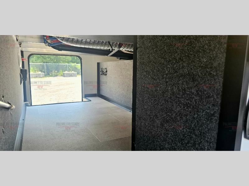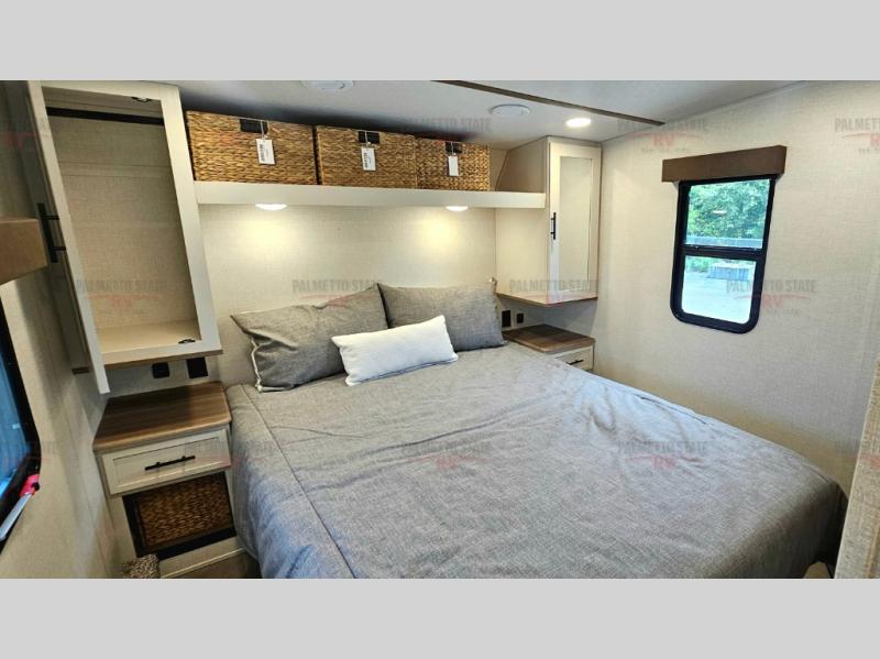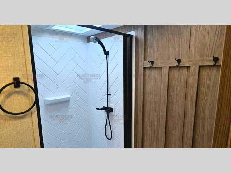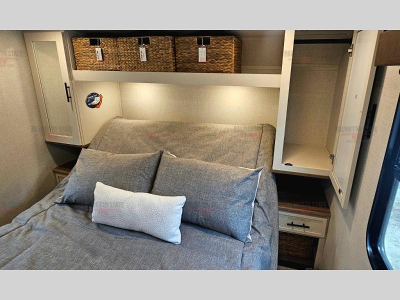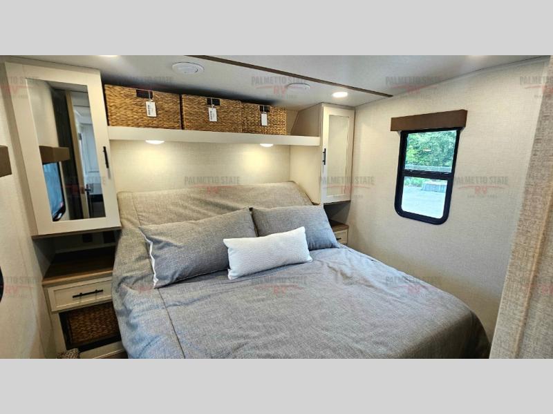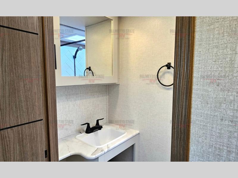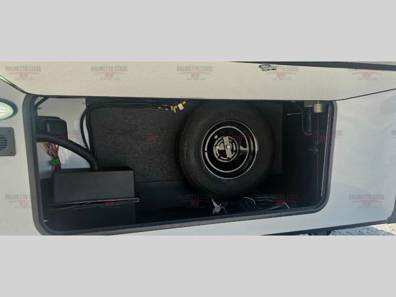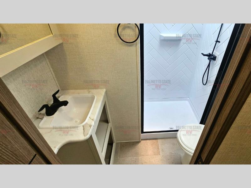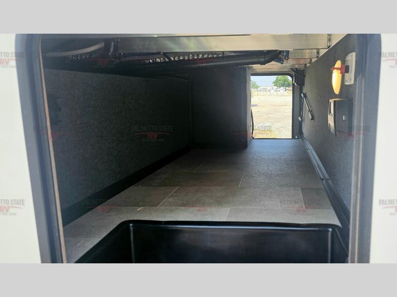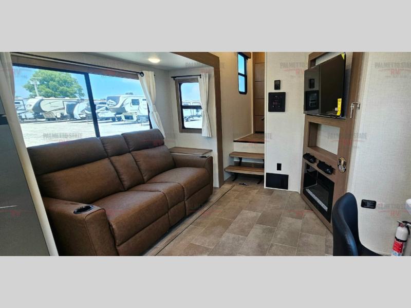 This unit is a perfect couples coach with plenty of space thanks to a large slide opposite the entry door. You will love the rear kitchen which includes large rear facing and camp facing windows to bring your view right inside. You will also find another large window above the theater seat within the slide. Easily enjoy cooking with all the necessary amenities including a 12V refrigerator, microwave oven, range, and sink. Counter space with added bar stools becomes a convenient place to enjoy your meals. A private front bedroom with a queen bed with Versa Tilt technology and double wardrobes makes a relaxing retreat when you retire for the evening, and the bathroom features a nice size walk-in shower with skylight for more natural lighting. There is also a wardrobe with washer and dryer prep if you choose to add those appliances. You are also sure to love the unobstructed pass-through storage outside for all of your outdoor camping gear and games. There is also some hidden storage to the right of the entry door behind a 40" LED TV and soundbar!