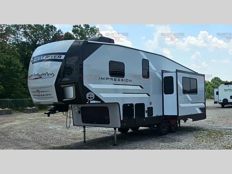 With any Impression fifth wheel by Forest River, the focus of the design is comfort and value, built with quality craftsmanship and attention to customer's desires in each Impression! The exterior includes upgraded E-rated tires, custom exterior graphics package, and insulated slam latch baggage doors. There is also an enclosed docking station, an outside shower, and a 100W roof panel for off-grid capabilities. The fully heated and enclosed AccessiBelly has removable underbelly panels along with enclosed tank valves. There is an industry leading 15K A/C plus 35K BTU furnace to keep you comfortable. The interior has lumbercore cabinetry, residential linoleum, residential backsplash in the kitchen, and oversized opening windows in the living area for more natural lighting and good air flow.
