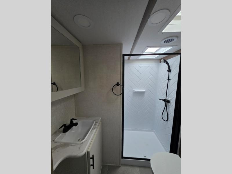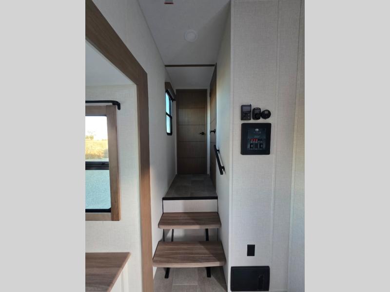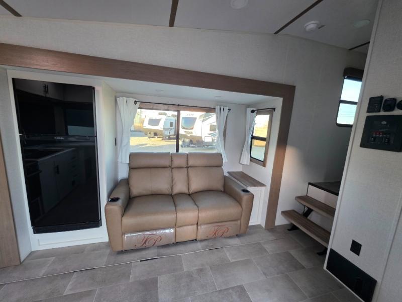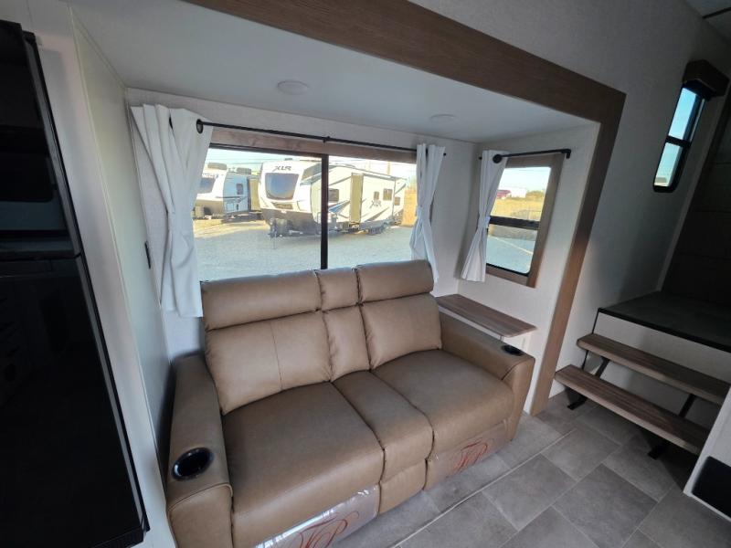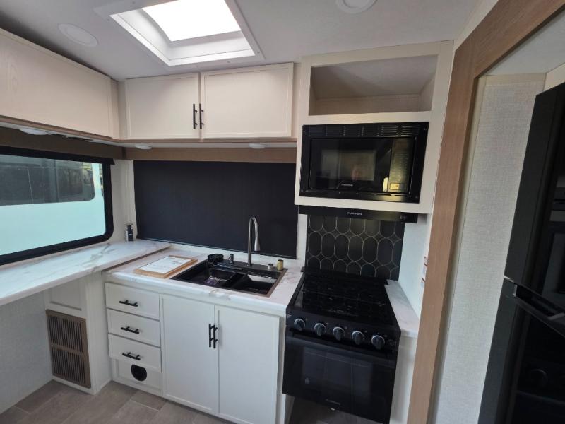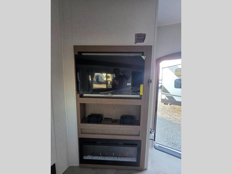 This unit is a perfect couples coach with plenty of space thanks to a large slide opposite the entry door. You will love the rear kitchen which includes large rear facing and camp facing windows to bring your view right inside. You will also find another large window above the theater seat within the slide. Easily enjoy cooking with all the necessary amenities including a 12V refrigerator, microwave oven, range, and sink. Counter space with added bar stools becomes a convenient place to enjoy your meals. A private front bedroom with a queen bed with Versa Tilt technology and double wardrobes makes a relaxing retreat when you retire for the evening, and the bathroom features a nice size walk-in shower with skylight for more natural lighting. There is also a wardrobe with washer and dryer prep if you choose to add those appliances. You are also sure to love the unobstructed pass-through storage outside for all of your outdoor camping gear and games. There is also some hidden storage to the right of the entry door behind a 40" LED TV and soundbar!