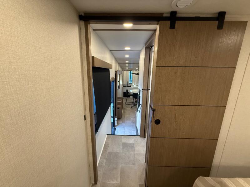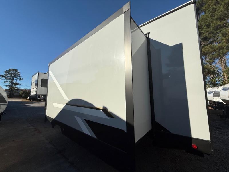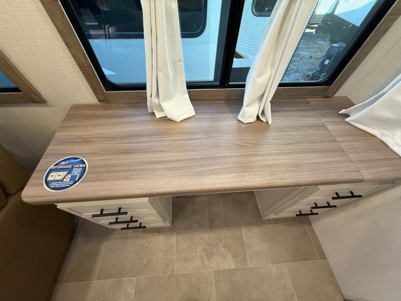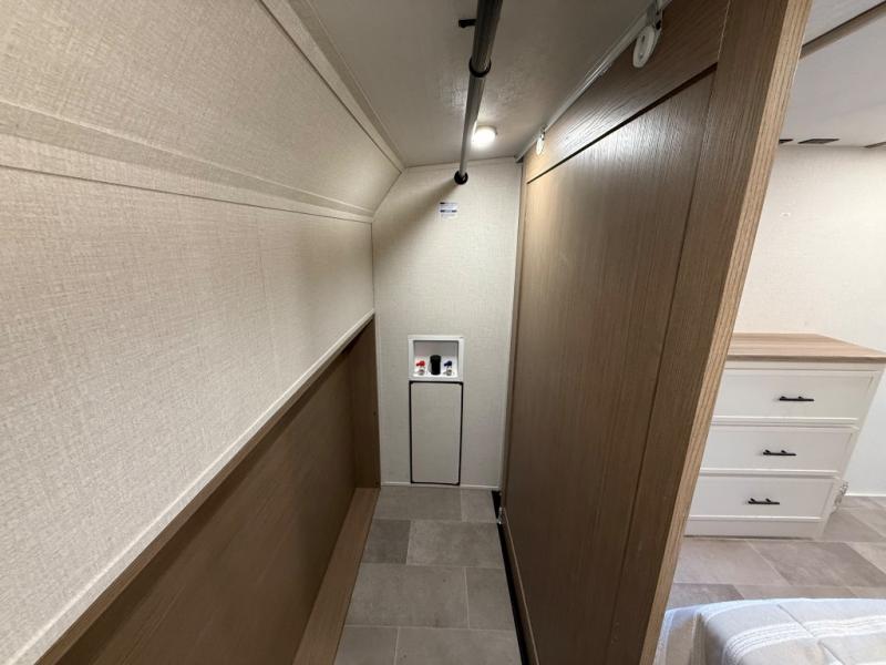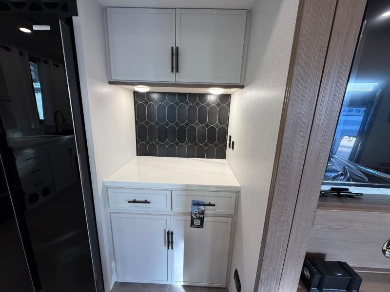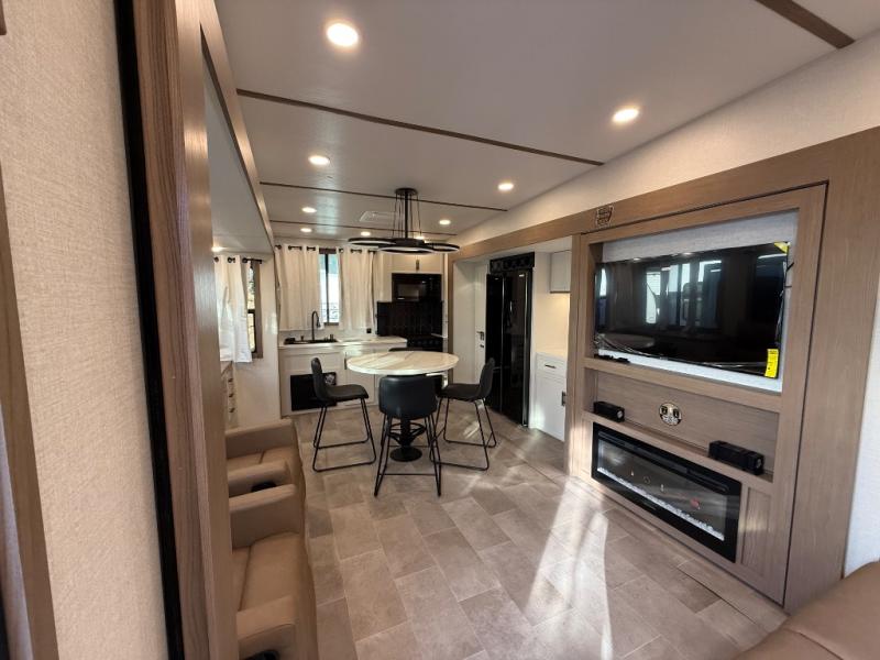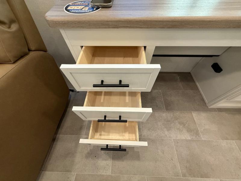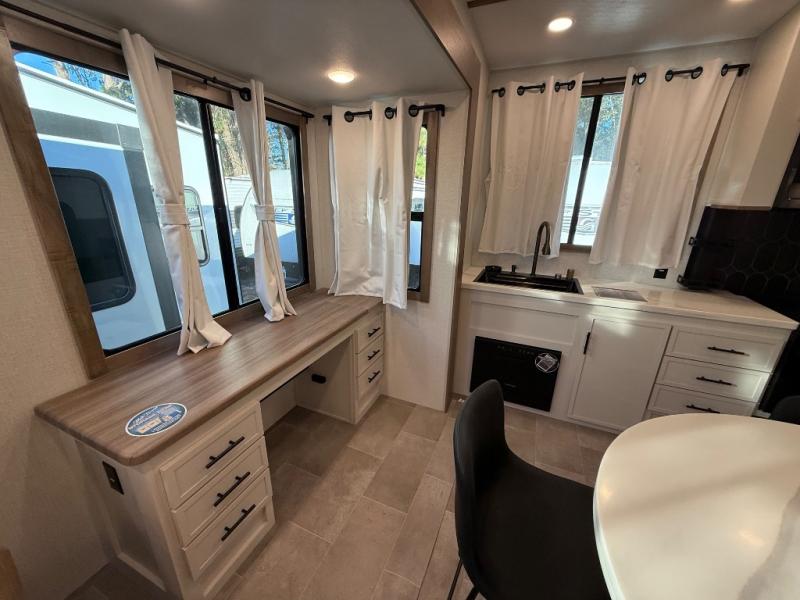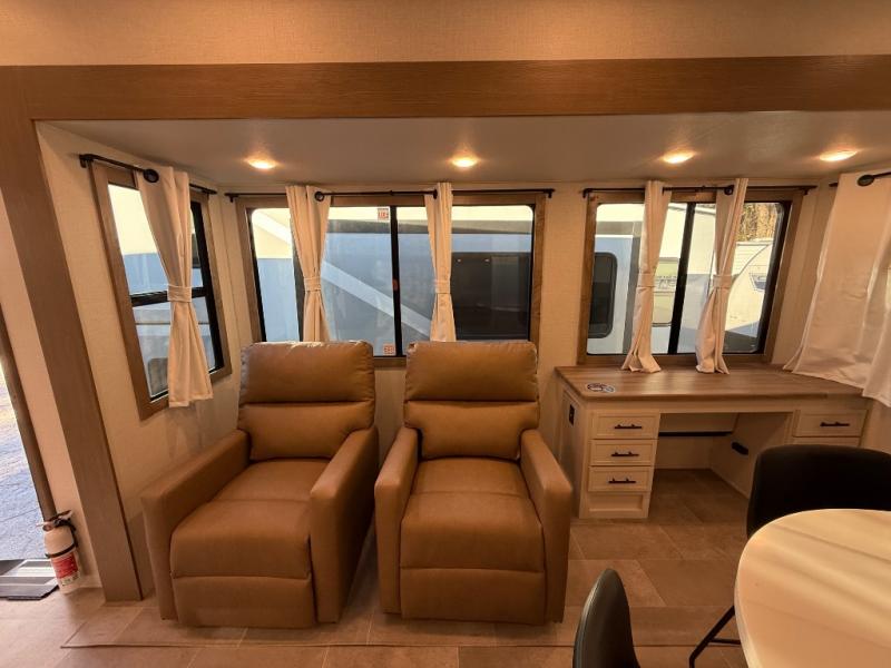 With this 301ML model, the main living area of this travel trailer is truly the heart of the home, featuring a spacious table and chairs perfect for gathering around during dinner or enjoying a fun board game, all while watching TV with hidden storage behind it to keep your essentials and snacks neatly tucked away. For added comfort, there’s a versatile trifold sofa that doubles as extra sleeping space, or you can relax in the cozy recliners and kick your feet up. Next to the recliners is a convenient desk, ideal for studying or working from home. The full rear kitchen is fully equipped with modern conveniences, including a dishwasher and a spacious 16-cubic-foot refrigerator. Moving toward the center, you’ll find a full bathroom with a walk-in shower and skylight, while the front of the trailer boasts a private bedroom complete with a king bed featuring Versa Tilt technology, a dresser, bench, and wardrobe to ensure maximum comfort and storage.