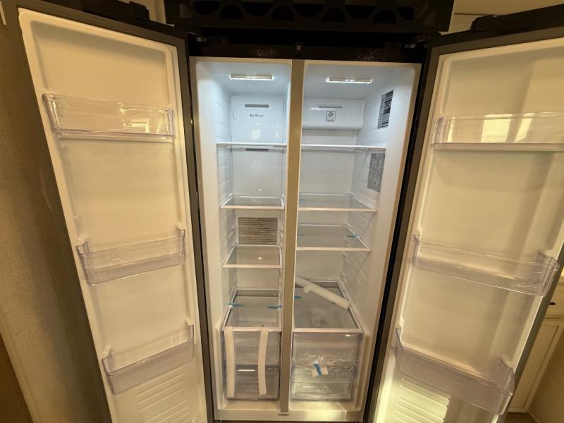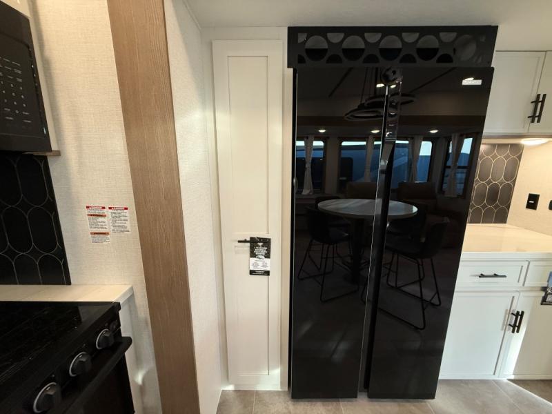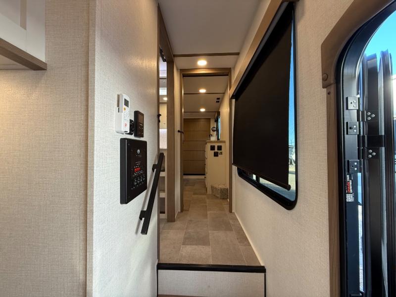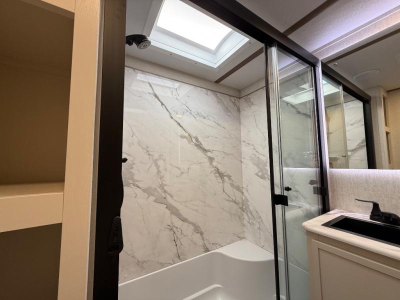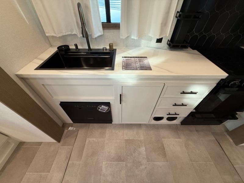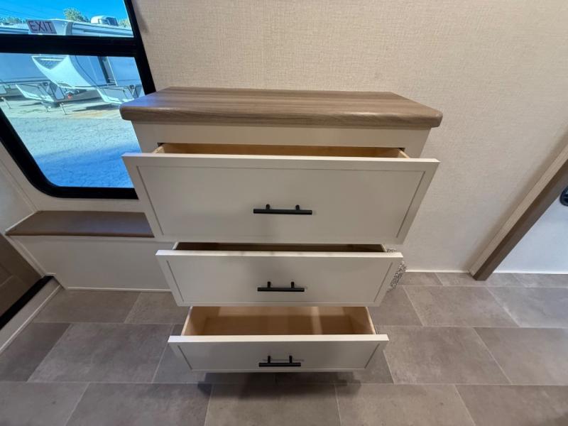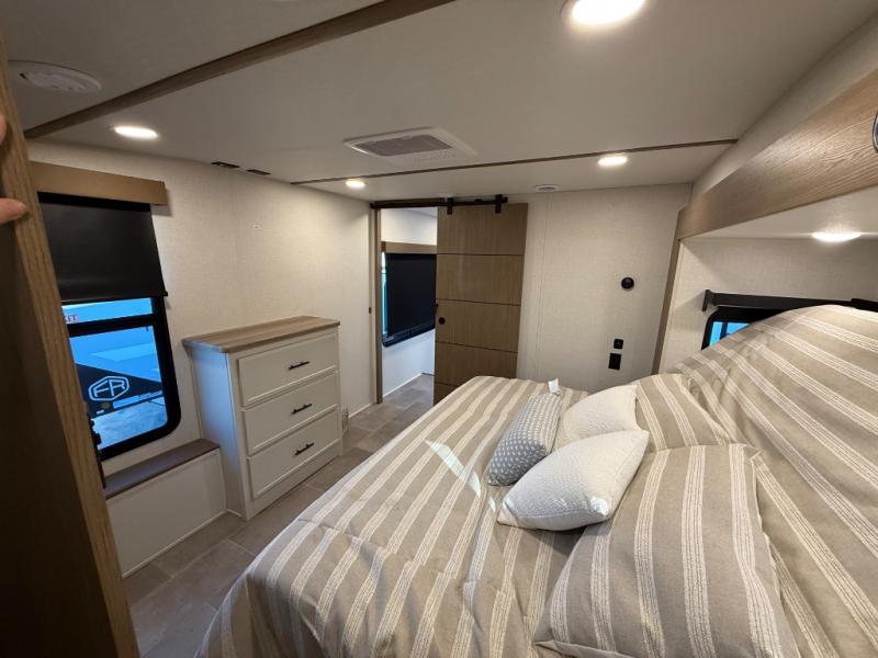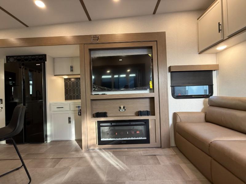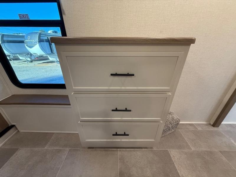 With this 301ML model, the main living area of this travel trailer is truly the heart of the home, featuring a spacious table and chairs perfect for gathering around during dinner or enjoying a fun board game, all while watching TV with hidden storage behind it to keep your essentials and snacks neatly tucked away. For added comfort, there’s a versatile trifold sofa that doubles as extra sleeping space, or you can relax in the cozy recliners and kick your feet up. Next to the recliners is a convenient desk, ideal for studying or working from home. The full rear kitchen is fully equipped with modern conveniences, including a dishwasher and a spacious 16-cubic-foot refrigerator. Moving toward the center, you’ll find a full bathroom with a walk-in shower and skylight, while the front of the trailer boasts a private bedroom complete with a king bed featuring Versa Tilt technology, a dresser, bench, and wardrobe to ensure maximum comfort and storage.