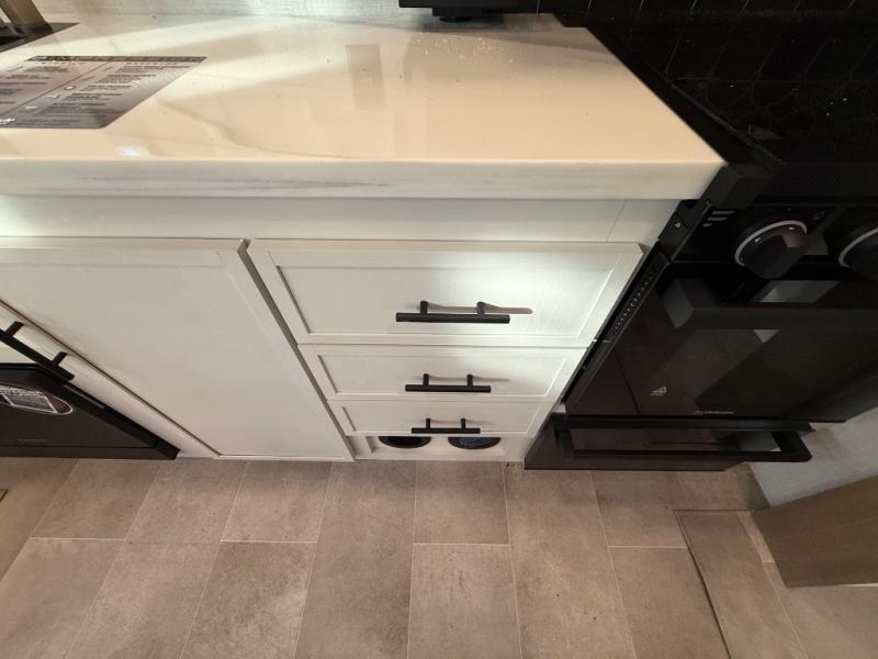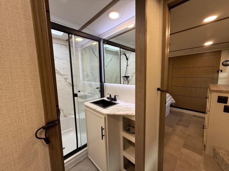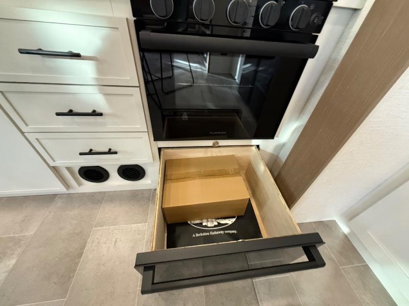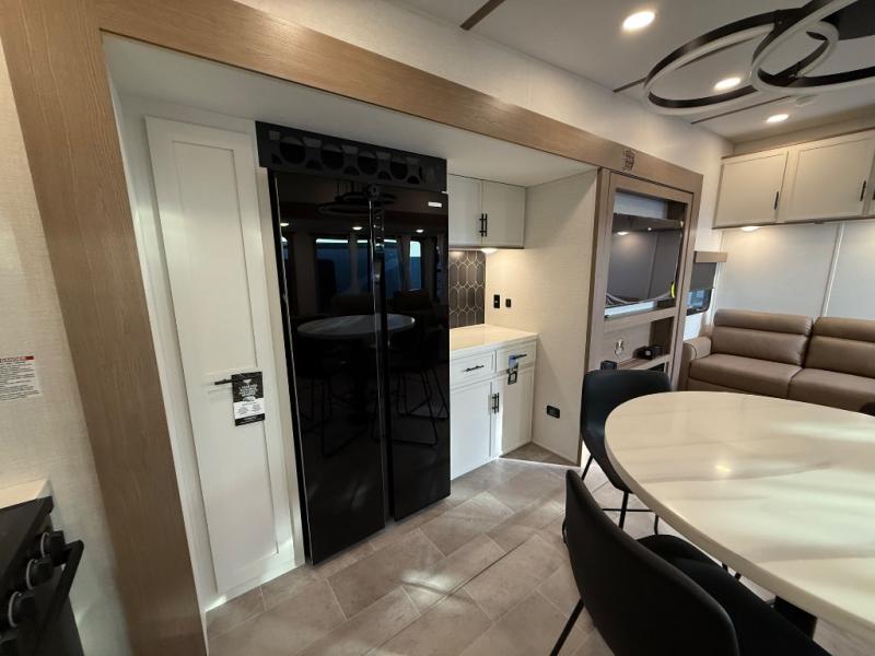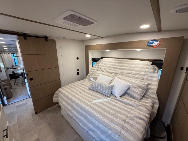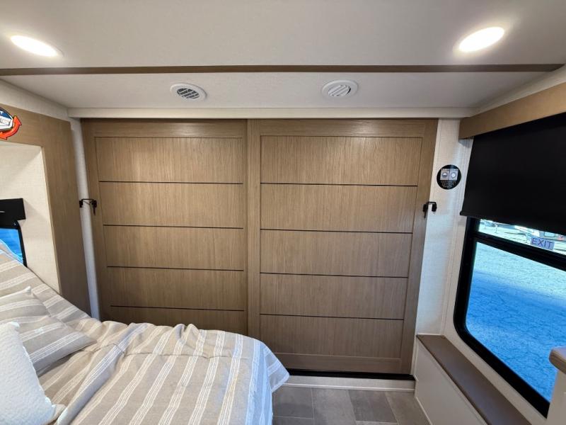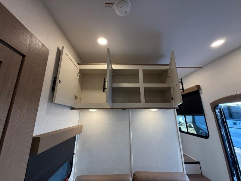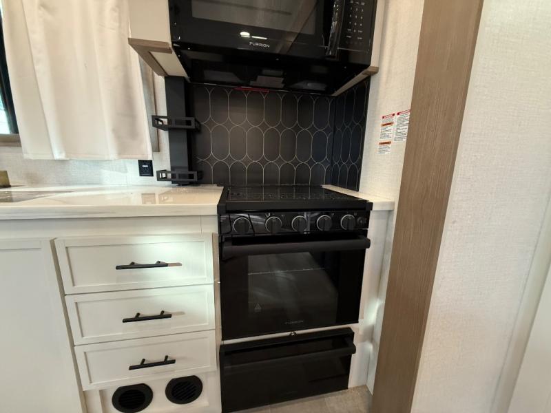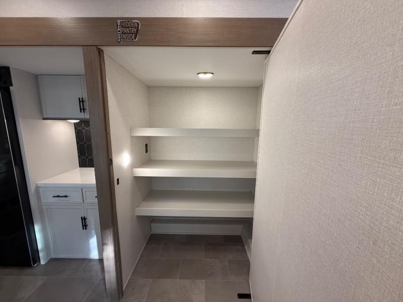 With this 301ML model, the main living area of this travel trailer is truly the heart of the home, featuring a spacious table and chairs perfect for gathering around during dinner or enjoying a fun board game, all while watching TV with hidden storage behind it to keep your essentials and snacks neatly tucked away. For added comfort, there’s a versatile trifold sofa that doubles as extra sleeping space, or you can relax in the cozy recliners and kick your feet up. Next to the recliners is a convenient desk, ideal for studying or working from home. The full rear kitchen is fully equipped with modern conveniences, including a dishwasher and a spacious 16-cubic-foot refrigerator. Moving toward the center, you’ll find a full bathroom with a walk-in shower and skylight, while the front of the trailer boasts a private bedroom complete with a king bed featuring Versa Tilt technology, a dresser, bench, and wardrobe to ensure maximum comfort and storage.