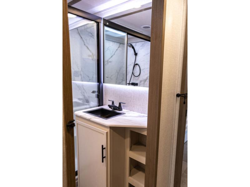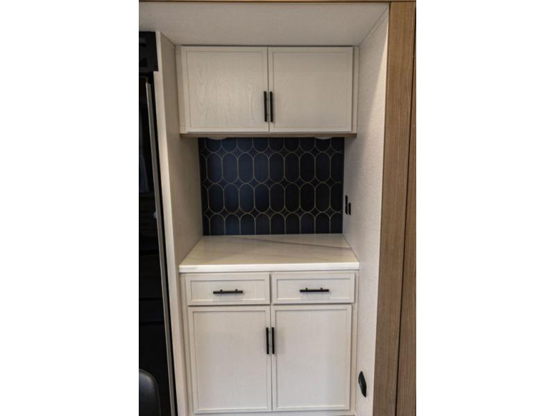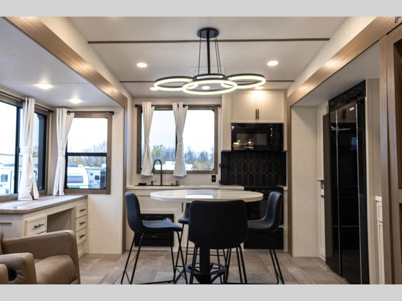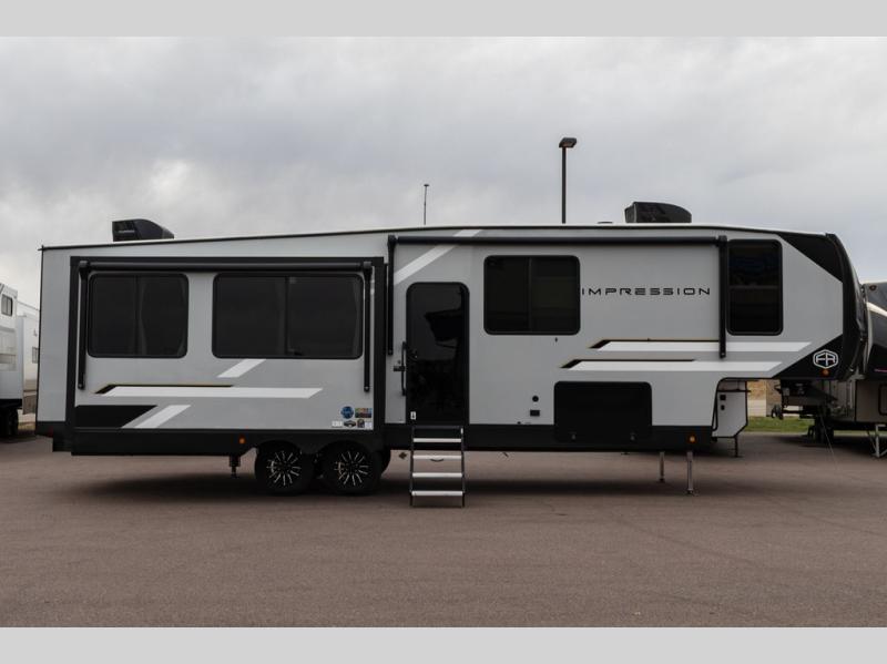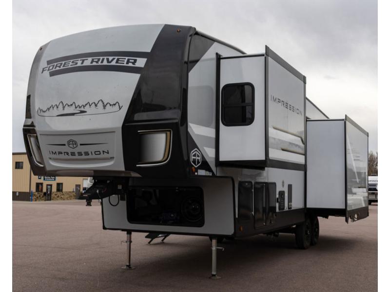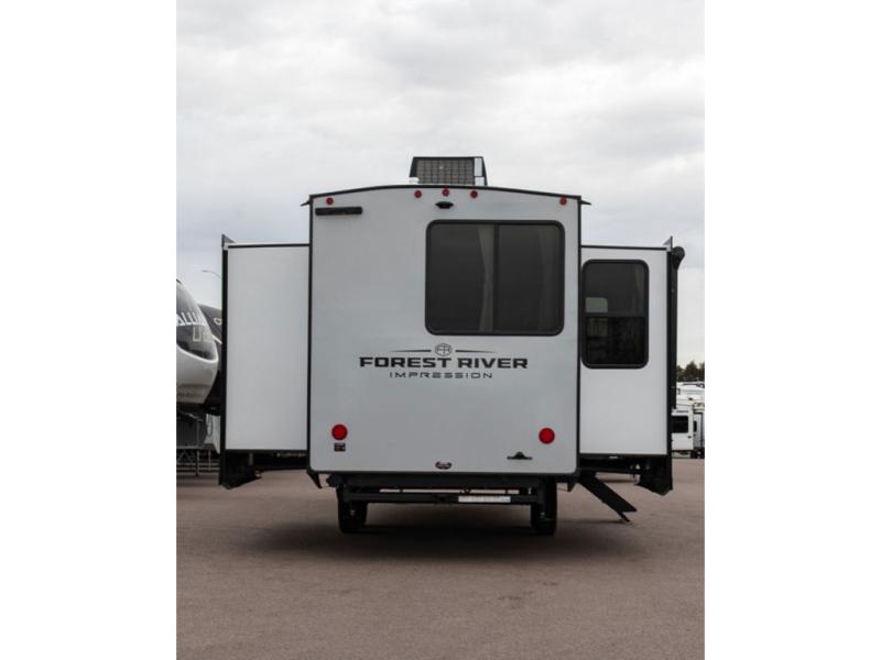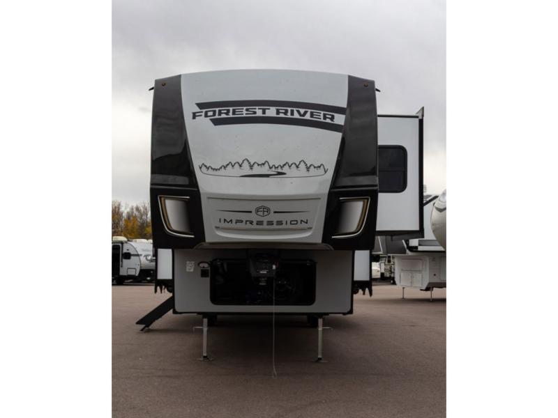 With any Impression fifth wheel by Forest River, the focus of the design is comfort and value, built with quality craftsmanship and attention to customer's desires in each Impression! The exterior includes upgraded E-rated tires, custom exterior graphics package, and insulated slam latch baggage doors. There is also an enclosed docking station, an outside shower, and a 100W roof panel for off-grid capabilities. The fully heated and enclosed AccessiBelly has removable underbelly panels along with enclosed tank valves. There is an industry leading 15K A/C plus 35K BTU furnace to keep you comfortable. The interior has lumbercore cabinetry, residential linoleum, residential backsplash in the kitchen, and oversized opening windows in the living area for more natural lighting and good air flow.