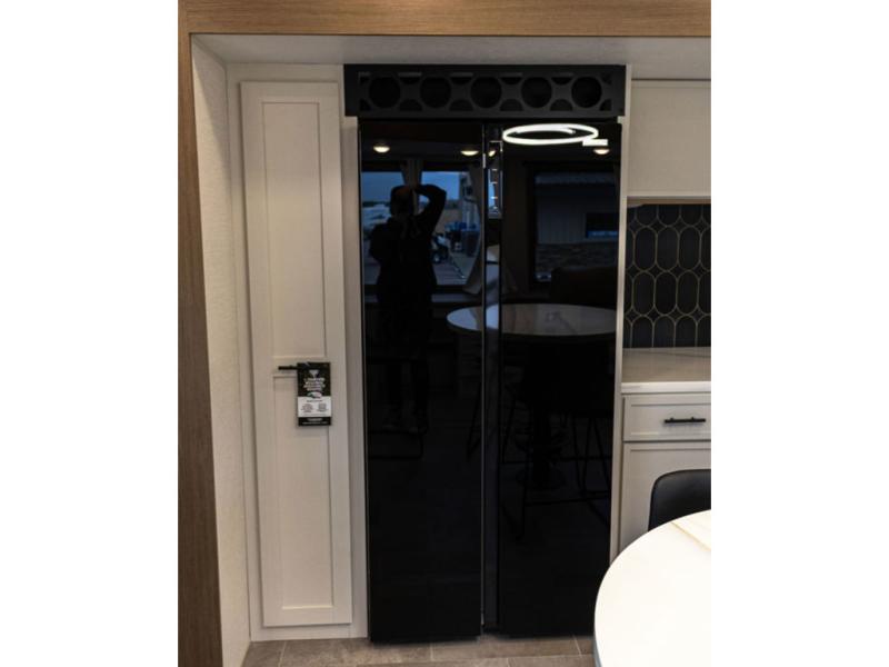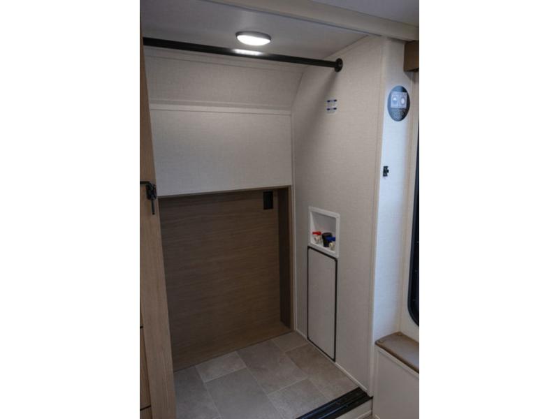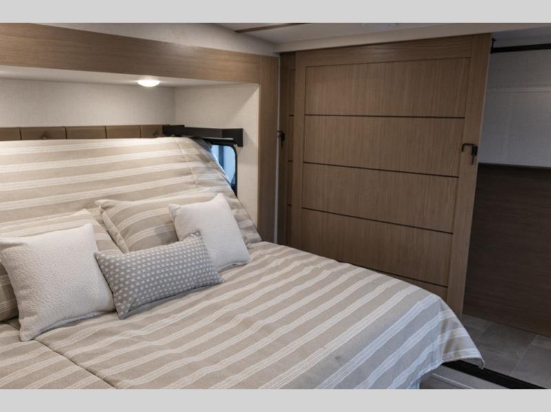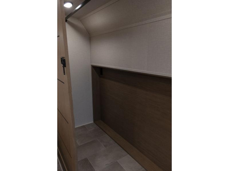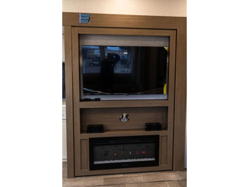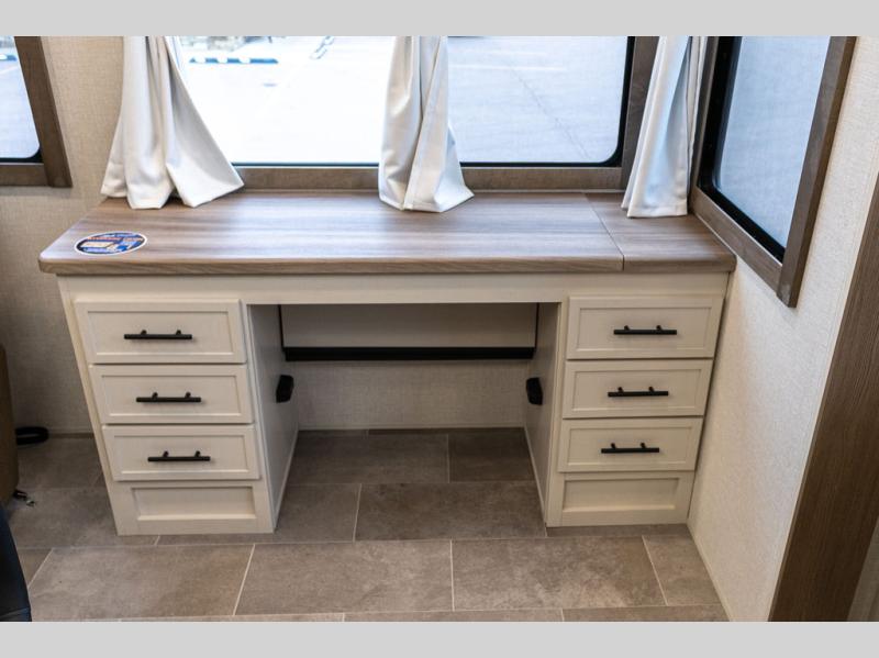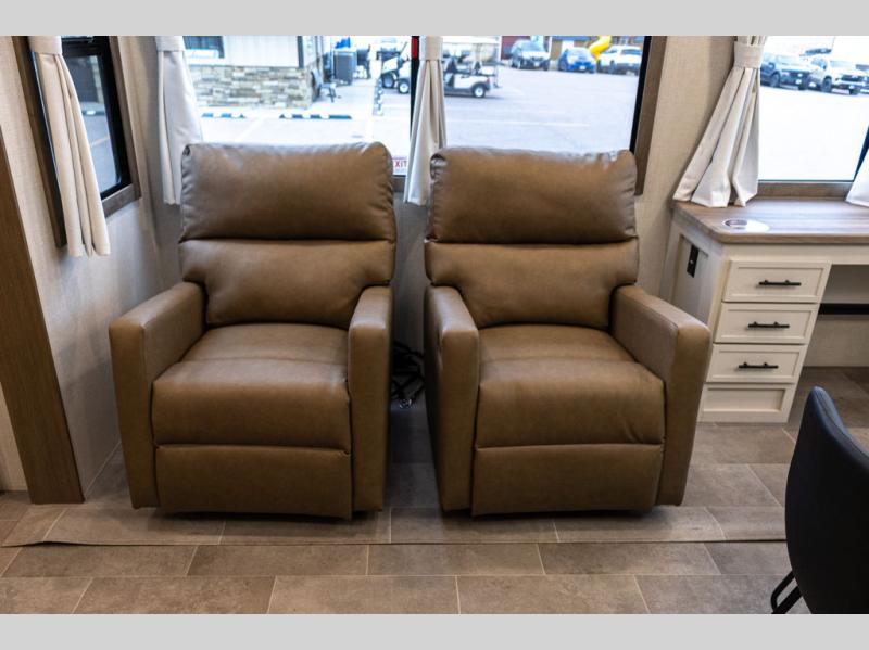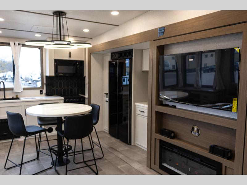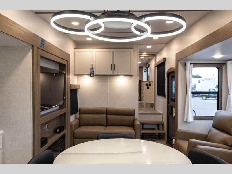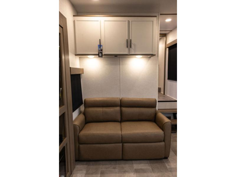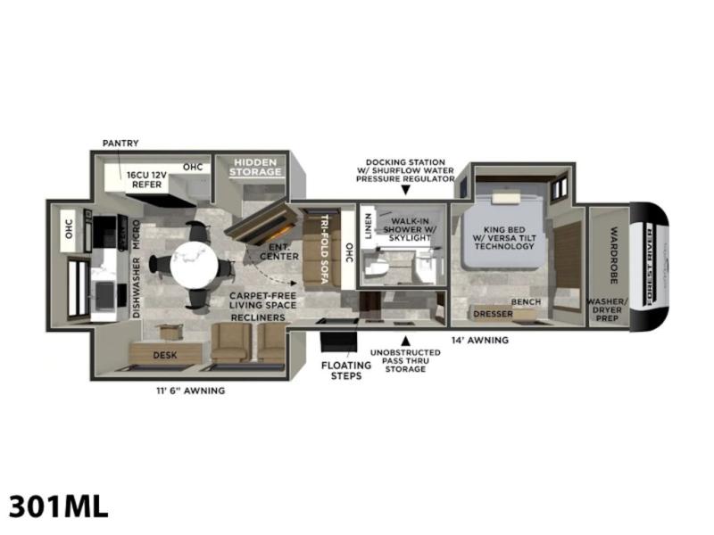 With this 301ML model, the main living area of this travel trailer is truly the heart of the home, featuring a spacious table and chairs perfect for gathering around during dinner or enjoying a fun board game, all while watching TV with hidden storage behind it to keep your essentials and snacks neatly tucked away. For added comfort, there’s a versatile trifold sofa that doubles as extra sleeping space, or you can relax in the cozy recliners and kick your feet up. Next to the recliners is a convenient desk, ideal for studying or working from home. The full rear kitchen is fully equipped with modern conveniences, including a dishwasher and a spacious 16-cubic-foot refrigerator. Moving toward the center, you’ll find a full bathroom with a walk-in shower and skylight, while the front of the trailer boasts a private bedroom complete with a king bed featuring Versa Tilt technology, a dresser, bench, and wardrobe to ensure maximum comfort and storage.