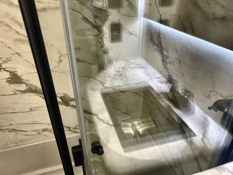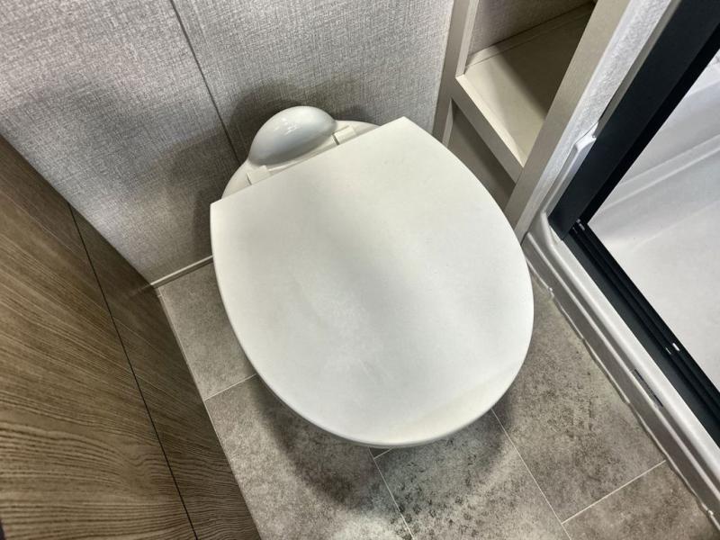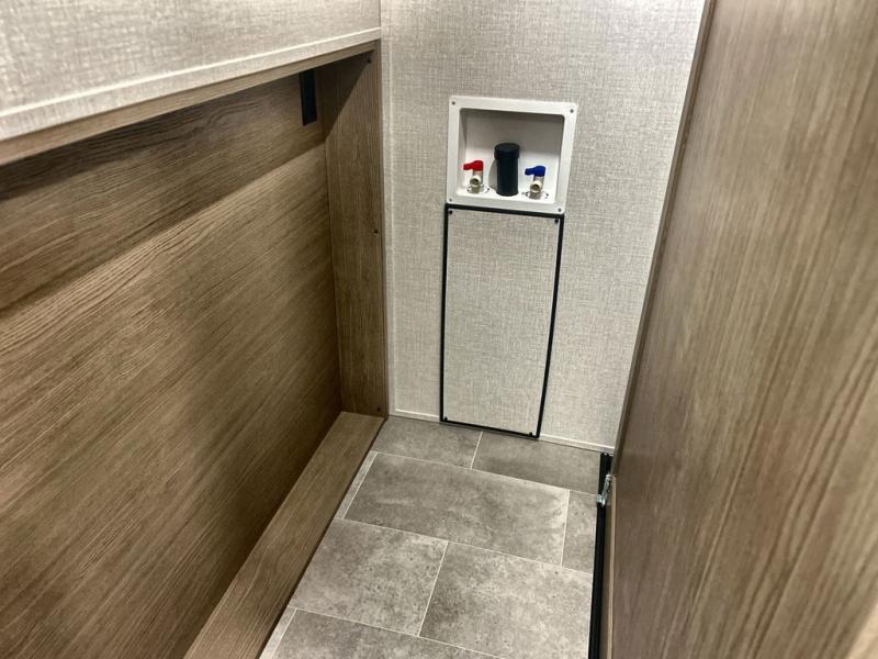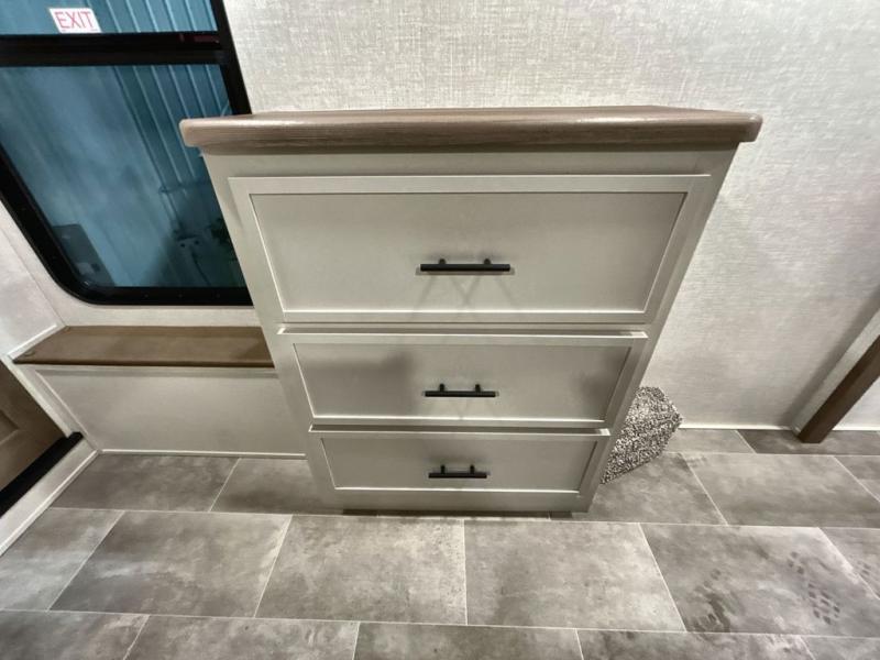 With any Impression fifth wheel by Forest River, the focus of the design is comfort and value, built with quality craftsmanship and attention to customer's desires in each Impression! The exterior includes upgraded E-rated tires, custom exterior graphics package, and insulated slam latch baggage doors. There is also an enclosed docking station, an outside shower, and a 100W roof panel for off-grid capabilities. The fully heated and enclosed AccessiBelly has removable underbelly panels along with enclosed tank valves. There is an industry leading 15K A/C plus 35K BTU furnace to keep you comfortable. The interior has lumbercore cabinetry, residential linoleum, residential backsplash in the kitchen, and oversized opening windows in the living area for more natural lighting and good air flow.