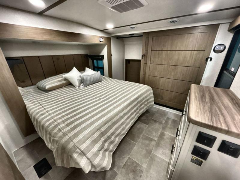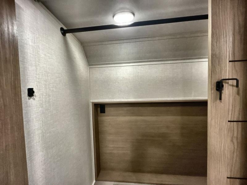 With this 301ML model, the main living area of this travel trailer is truly the heart of the home, featuring a spacious table and chairs perfect for gathering around during dinner or enjoying a fun board game, all while watching TV with hidden storage behind it to keep your essentials and snacks neatly tucked away. For added comfort, there’s a versatile trifold sofa that doubles as extra sleeping space, or you can relax in the cozy recliners and kick your feet up. Next to the recliners is a convenient desk, ideal for studying or working from home. The full rear kitchen is fully equipped with modern conveniences, including a dishwasher and a spacious 16-cubic-foot refrigerator. Moving toward the center, you’ll find a full bathroom with a walk-in shower and skylight, while the front of the trailer boasts a private bedroom complete with a king bed featuring Versa Tilt technology, a dresser, bench, and wardrobe to ensure maximum comfort and storage.