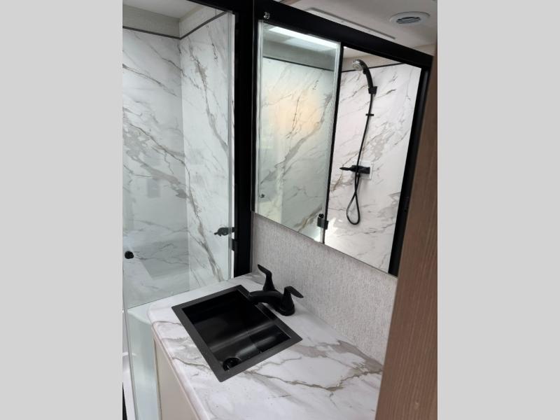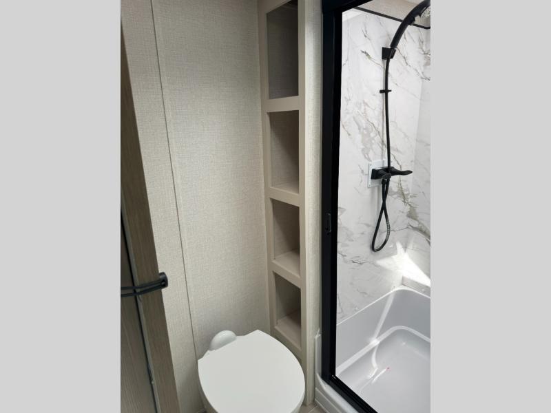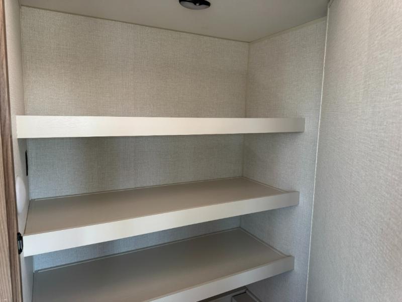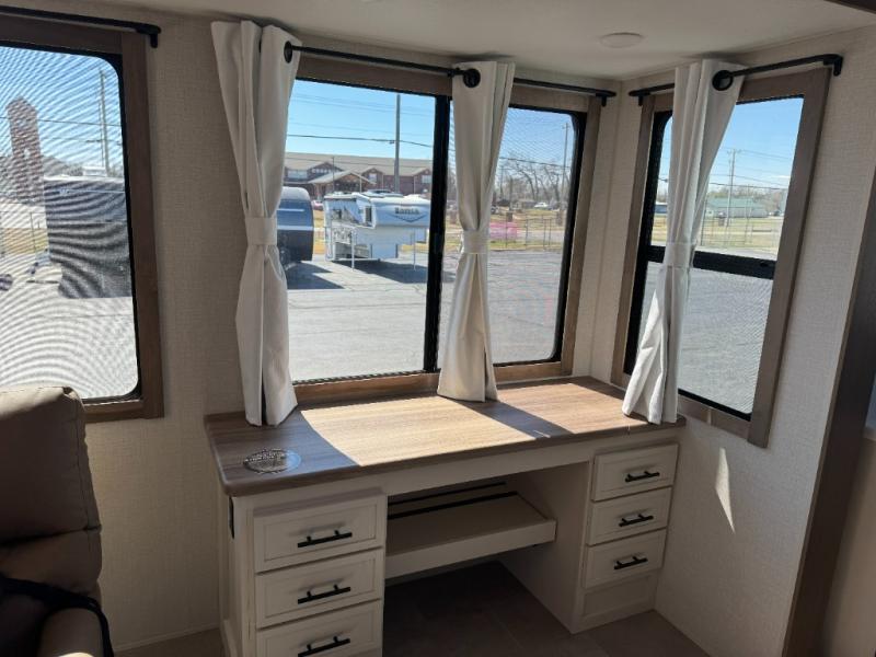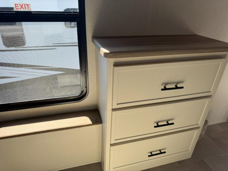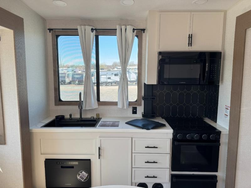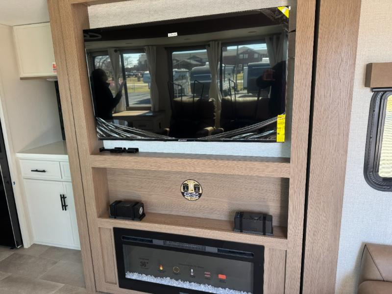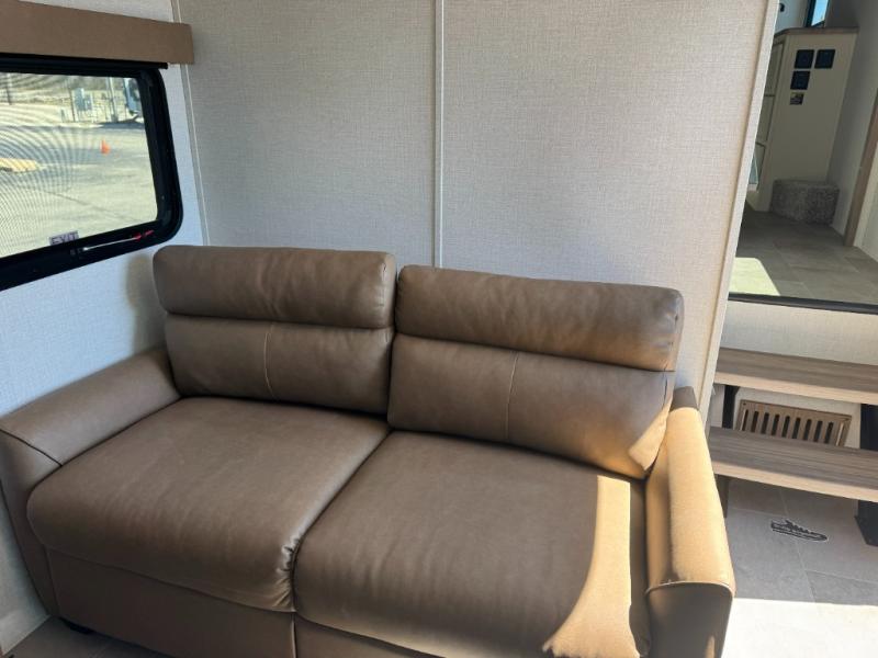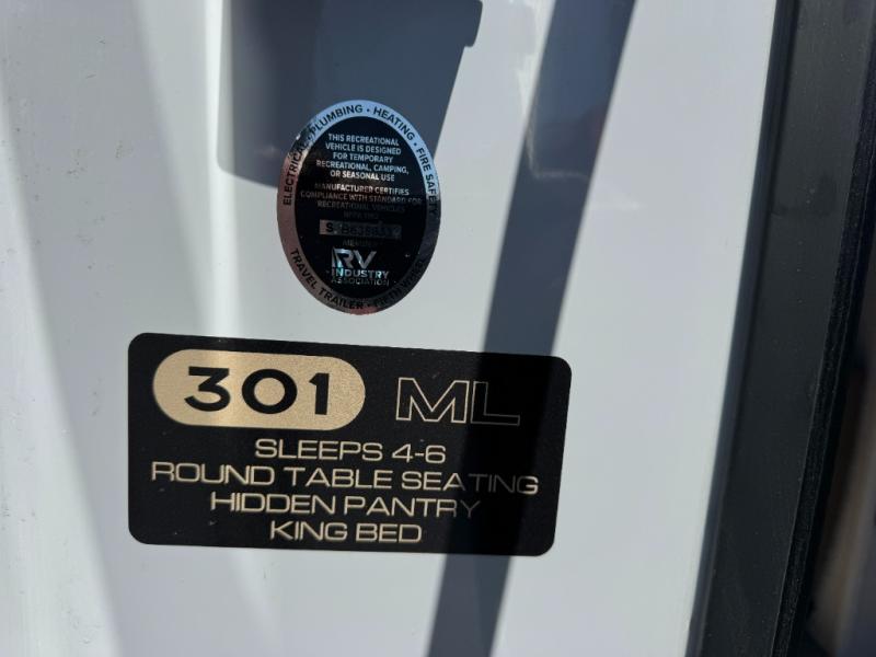 With this 301ML model, the main living area of this travel trailer is truly the heart of the home, featuring a spacious table and chairs perfect for gathering around during dinner or enjoying a fun board game, all while watching TV with hidden storage behind it to keep your essentials and snacks neatly tucked away. For added comfort, there’s a versatile trifold sofa that doubles as extra sleeping space, or you can relax in the cozy recliners and kick your feet up. Next to the recliners is a convenient desk, ideal for studying or working from home. The full rear kitchen is fully equipped with modern conveniences, including a dishwasher and a spacious 16-cubic-foot refrigerator. Moving toward the center, you’ll find a full bathroom with a walk-in shower and skylight, while the front of the trailer boasts a private bedroom complete with a king bed featuring Versa Tilt technology, a dresser, bench, and wardrobe to ensure maximum comfort and storage.