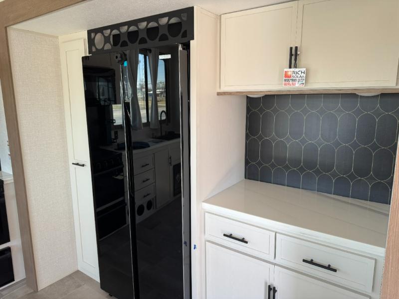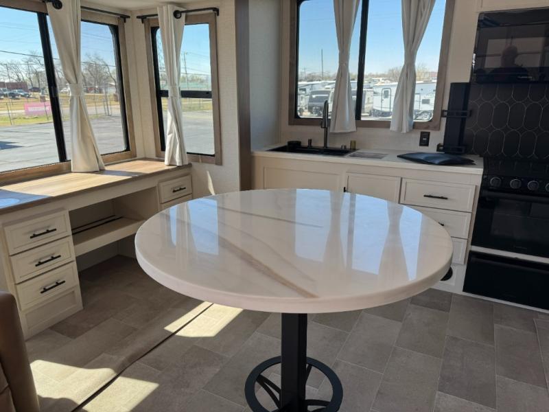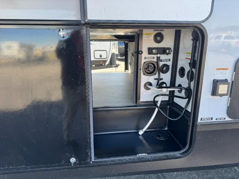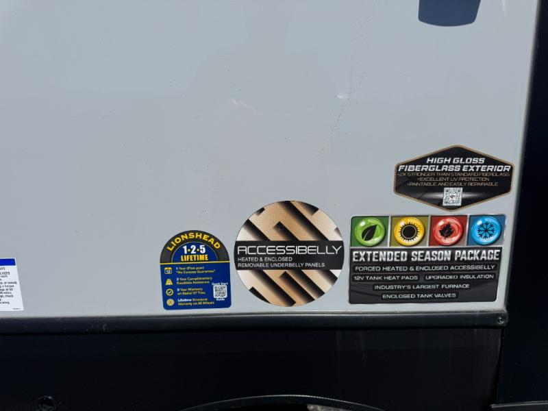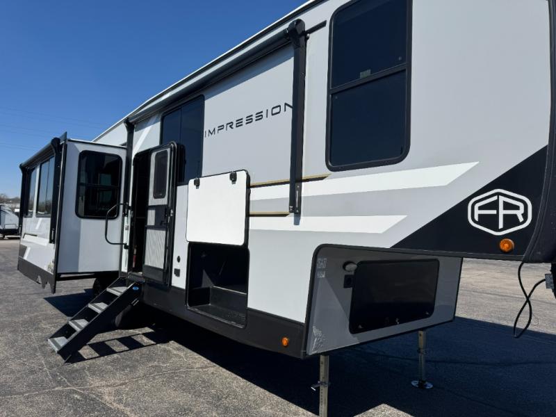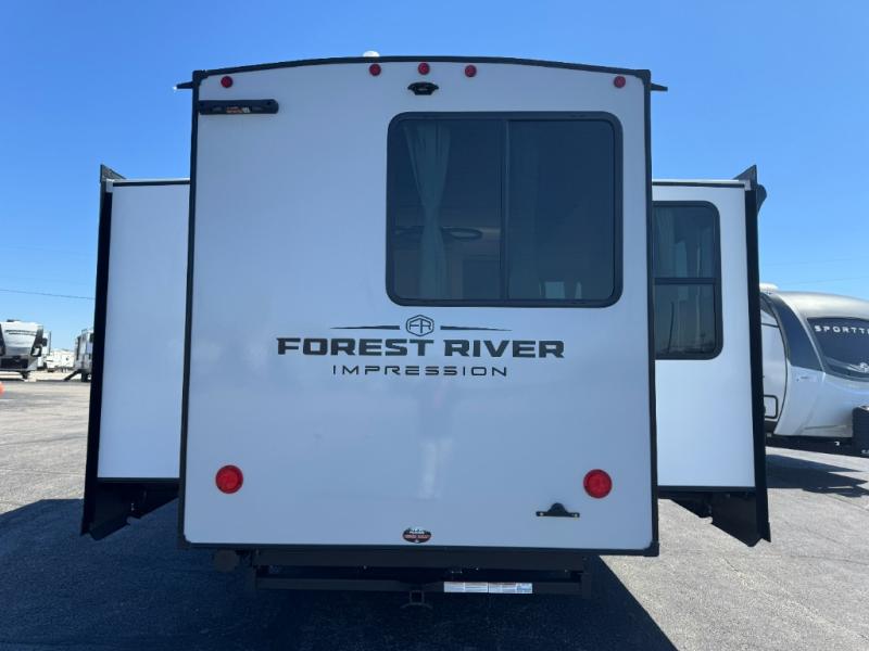 With any Impression fifth wheel by Forest River, the focus of the design is comfort and value, built with quality craftsmanship and attention to customer's desires in each Impression! The exterior includes upgraded E-rated tires, custom exterior graphics package, and insulated slam latch baggage doors. There is also an enclosed docking station, an outside shower, and a 100W roof panel for off-grid capabilities. The fully heated and enclosed AccessiBelly has removable underbelly panels along with enclosed tank valves. There is an industry leading 15K A/C plus 35K BTU furnace to keep you comfortable. The interior has lumbercore cabinetry, residential linoleum, residential backsplash in the kitchen, and oversized opening windows in the living area for more natural lighting and good air flow.