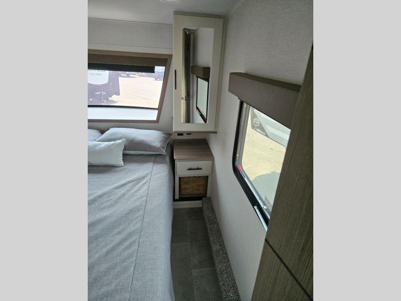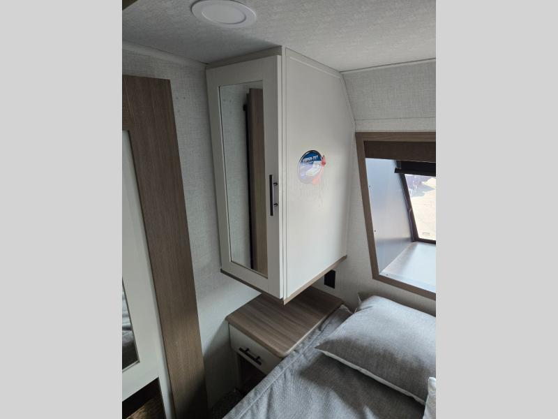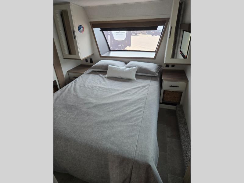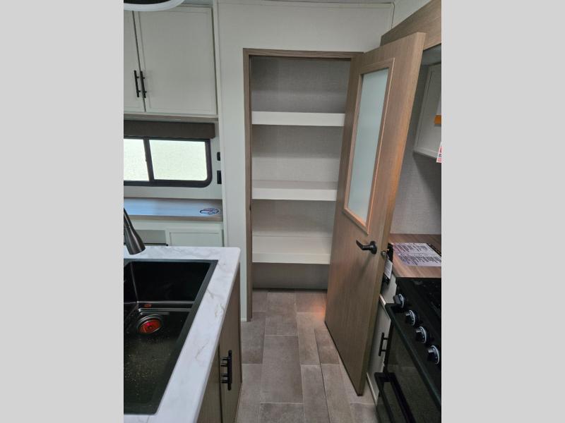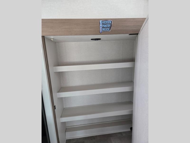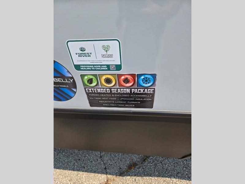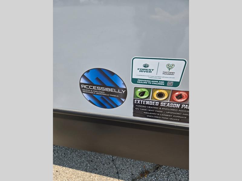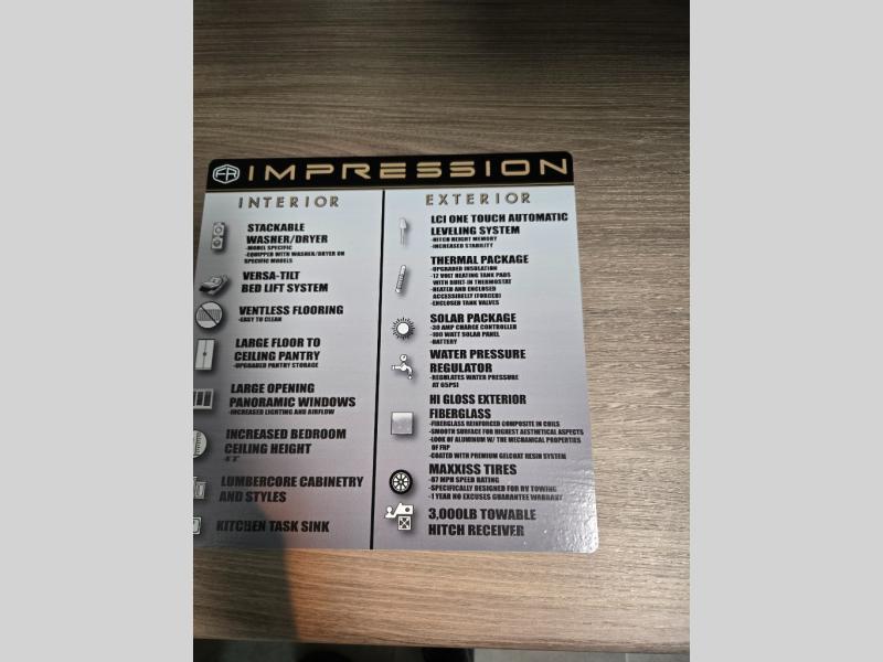With any Impression mid-profile fifth wheel by Forest River, the focus of the design is comfort and value, built with quality craftsmanship and attention to customer's desires in each Impression! The exterior includes upgraded E-rated tires, custom exterior graphics package, and insulated slam latch baggage doors. There is also an enclosed docking station, an outside shower, and a 100W roof solar panel for off-grid capabilities. The fully heated and enclosed AccessiBelly has removable underbelly panels and offers four seasons of travel, and there is an industry leading 15K A/C plus 35K BTU furnace to keep you comfortable. The interior has lumbercore cabinetry, residential linoleum, residential backsplash in the kitchen, and oversized opening windows in the living area for more natural lighting and good air flow.