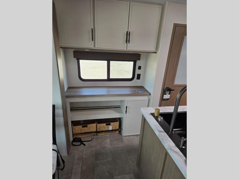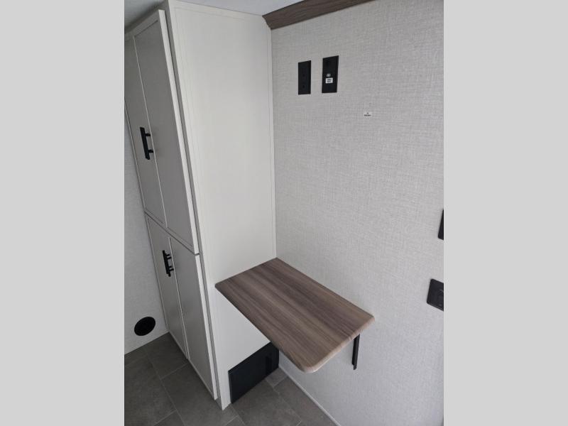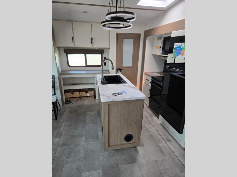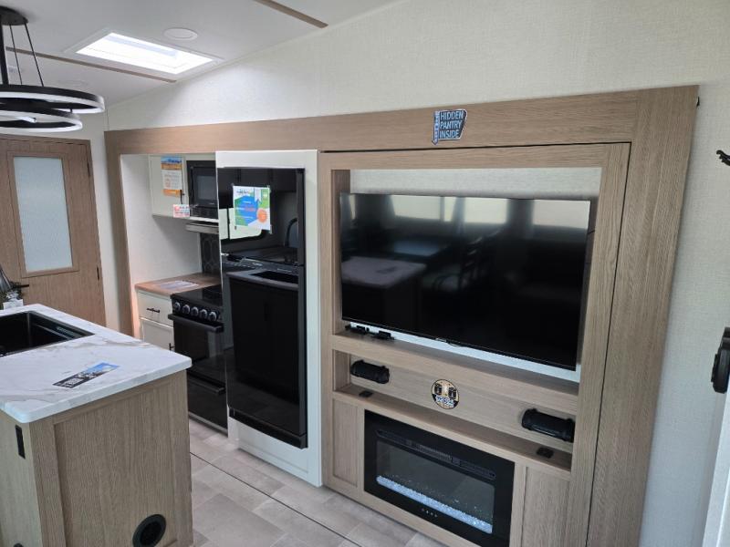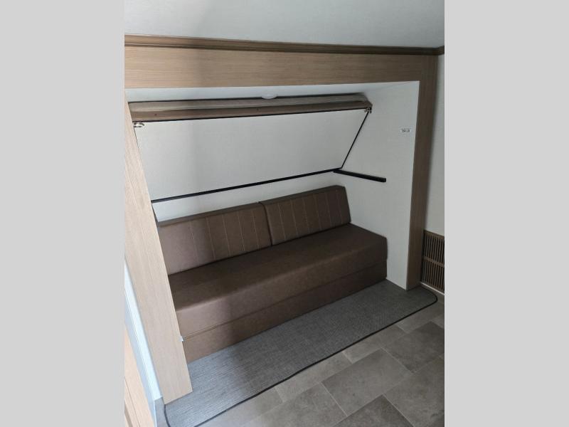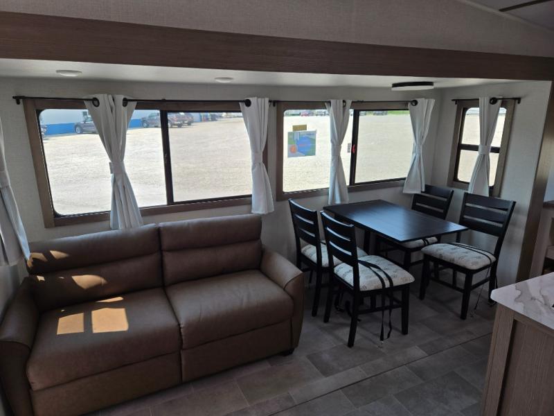 Wow! This fifth wheel will surely make an impression with its middle bunkhouse that can be utilized as an extra bedroom, second living room or even an office thanks to the desk and sofa that becomes a Versa queen bed at night. You will also find a flip-down upper bunk, a slide out for more floor space, and a wardrobe for clothing. The full bathroom is between this room and the front bedroom that offers lots of storage including a slide out wardrobe, a space prepped for a washer/dryer option, nightstands to place your cellphone and such, plus a queen bed with Versa Tilt technology. The rear kitchen includes plenty of storage for your dishes, pans, drinkware, and dry goods. The cook will love the kitchen island, the full amenities as well as the choice to use the outside kitchen to help feed everyone. And the free standing dinette with chairs plus the so a theater seating offer seating inside.