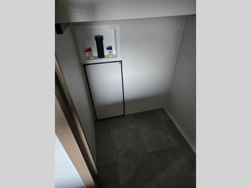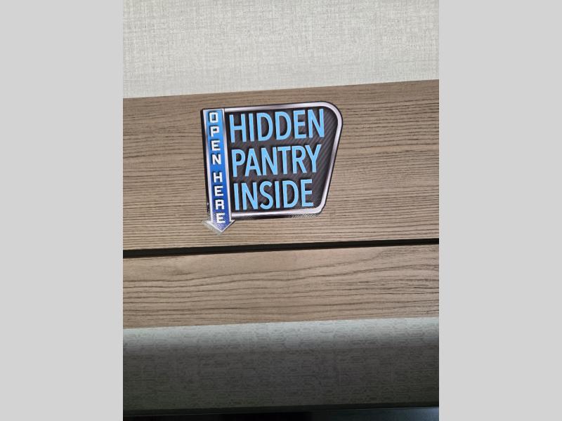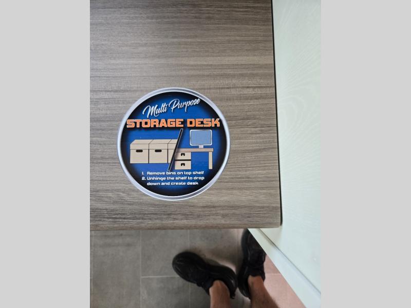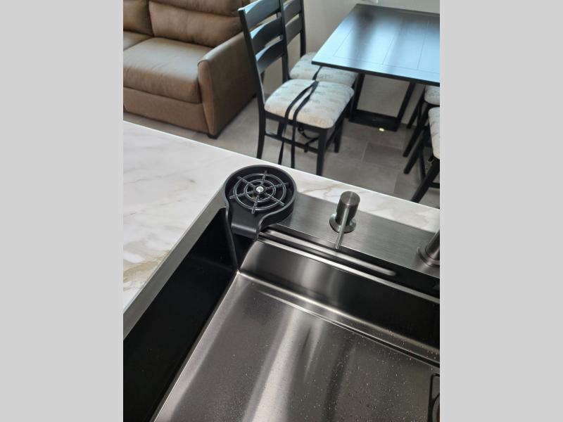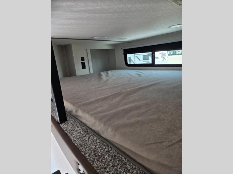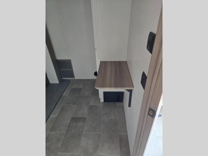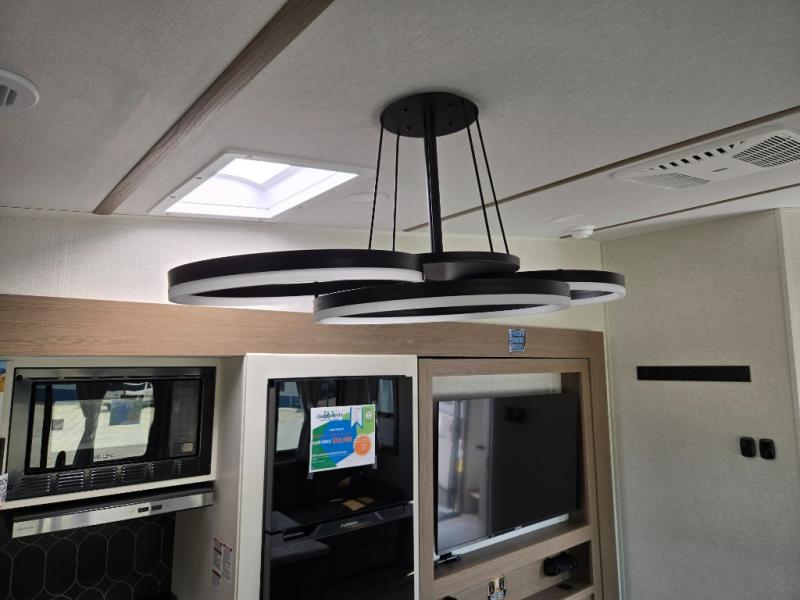 Wow! This fifth wheel will surely make an impression with its middle bunkhouse that can be utilized as an extra bedroom, second living room or even an office thanks to the desk and sofa that becomes a Versa queen bed at night. You will also find a flip-down upper bunk, a slide out for more floor space, and a wardrobe for clothing. The full bathroom is between this room and the front bedroom that offers lots of storage including a slide out wardrobe, a space prepped for a washer/dryer option, nightstands to place your cellphone and such, plus a queen bed with Versa Tilt technology. The rear kitchen includes plenty of storage for your dishes, pans, drinkware, and dry goods. The cook will love the kitchen island, the full amenities as well as the choice to use the outside kitchen to help feed everyone. And the free standing dinette with chairs plus the so a theater seating offer seating inside.