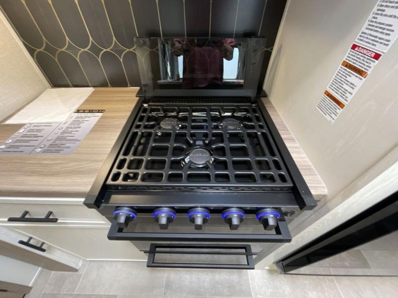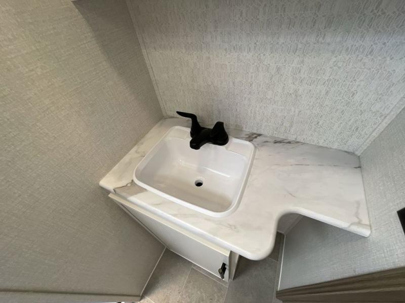 With any Impression mid-profile fifth wheel by Forest River, the focus of the design is comfort and value, built with quality craftsmanship and attention to customer's desires in each Impression! The exterior includes upgraded E-rated tires, custom exterior graphics package, and insulated slam latch baggage doors. There is also an enclosed docking station, an outside shower, and a 100W roof solar panel for off-grid capabilities. The fully heated and enclosed AccessiBelly has removable underbelly panels and offers four seasons of travel, and there is an industry leading 15K A/C plus 35K BTU furnace to keep you comfortable. The interior has lumbercore cabinetry, residential linoleum, residential backsplash in the kitchen, and oversized opening windows in the living area for more natural lighting and good air flow.