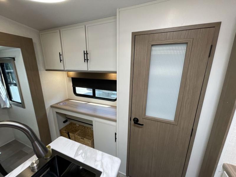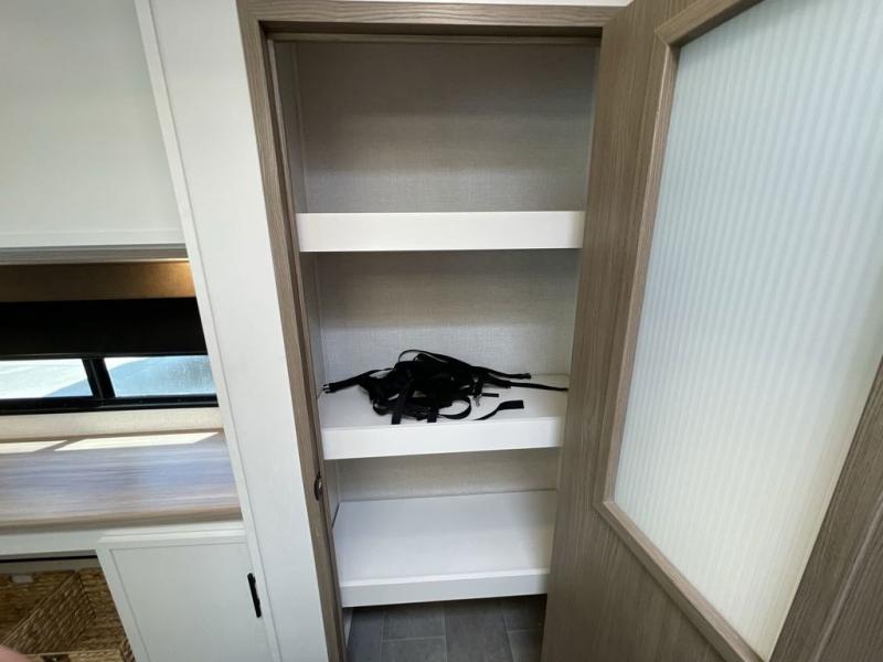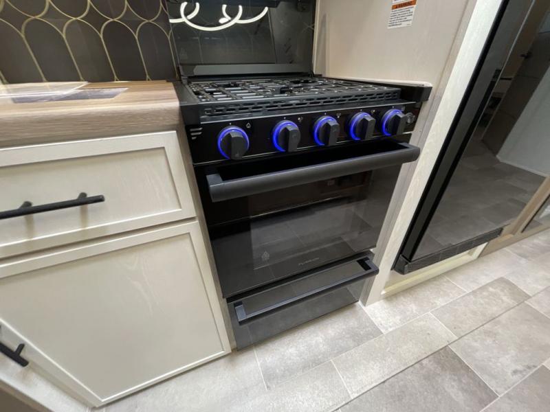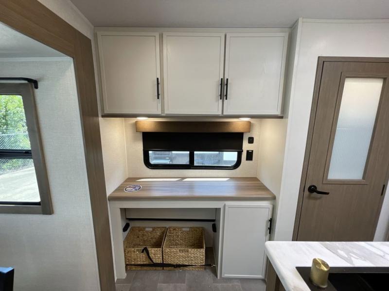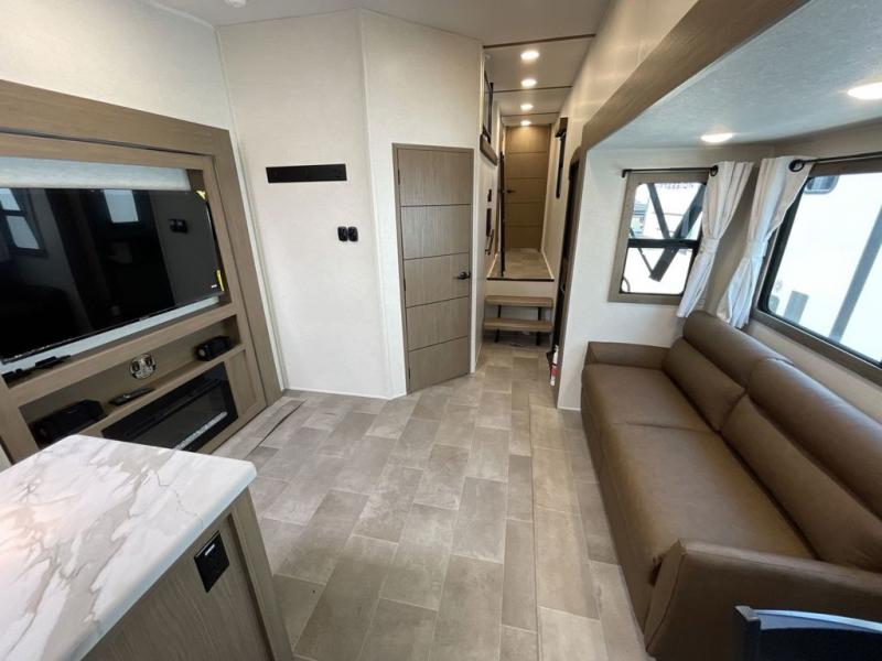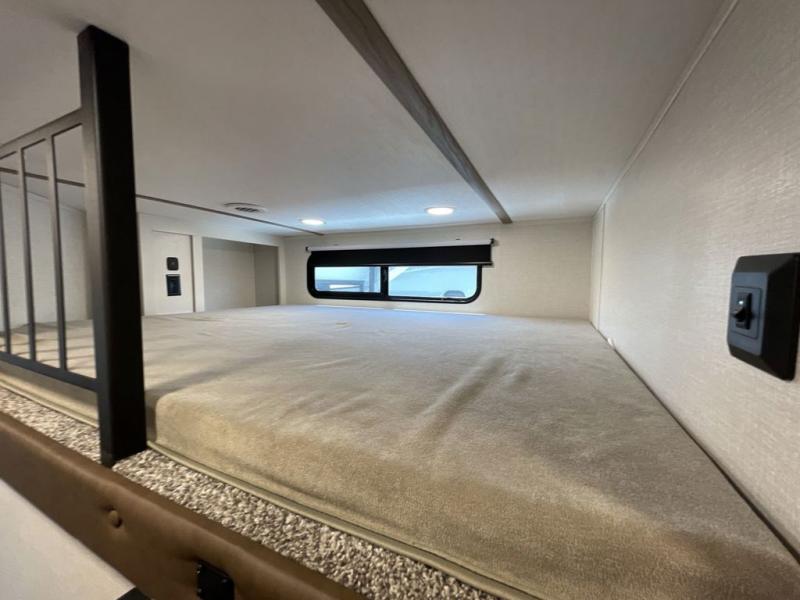 Wow! This fifth wheel will surely make an impression with its middle bunkhouse that can be utilized as an extra bedroom, second living room or even an office thanks to the desk and sofa that becomes a Versa queen bed at night. You will also find a flip-down upper bunk, a slide out for more floor space, and a wardrobe for clothing. The full bathroom is between this room and the front bedroom that offers lots of storage including a slide out wardrobe, a space prepped for a washer/dryer option, nightstands to place your cellphone and such, plus a queen bed with Versa Tilt technology. The rear kitchen includes plenty of storage for your dishes, pans, drinkware, and dry goods. The cook will love the kitchen island, the full amenities as well as the choice to use the outside kitchen to help feed everyone. And the free standing dinette with chairs plus the so a theater seating offer seating inside.