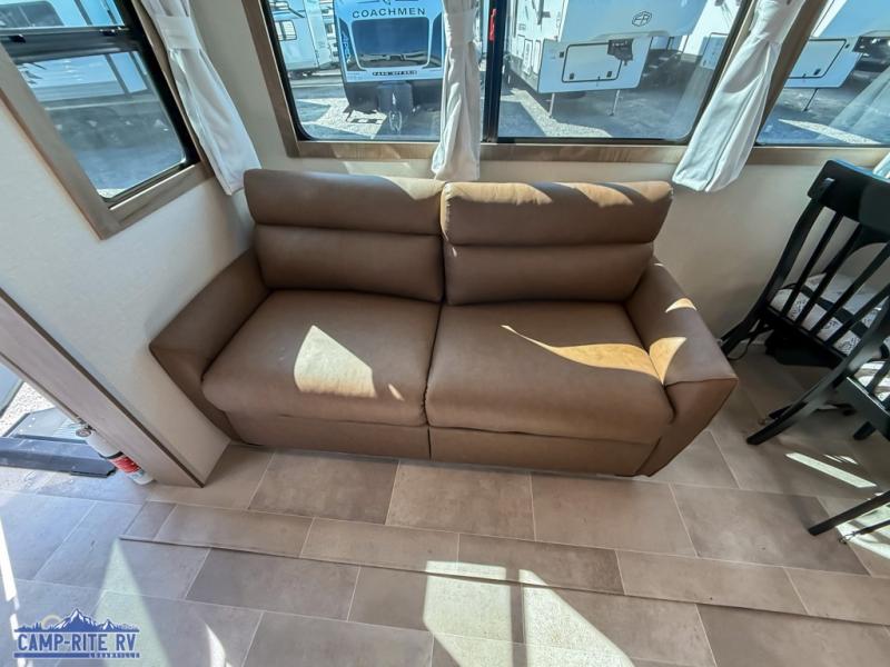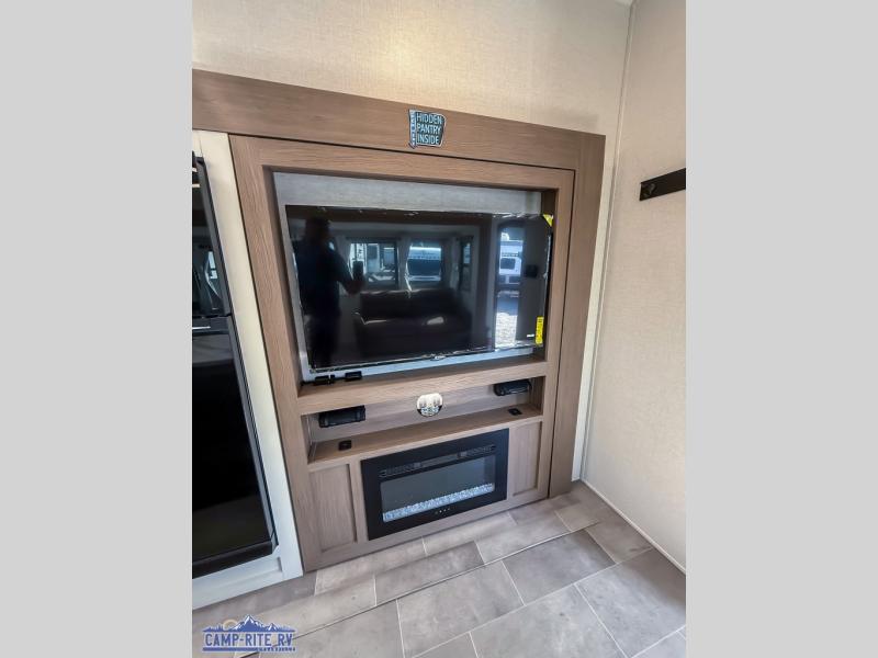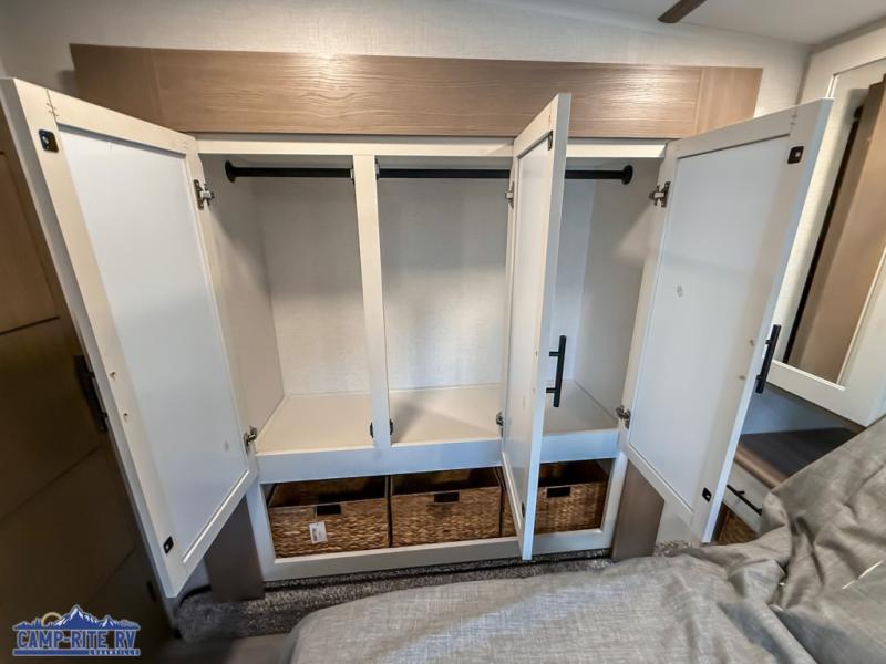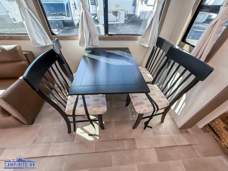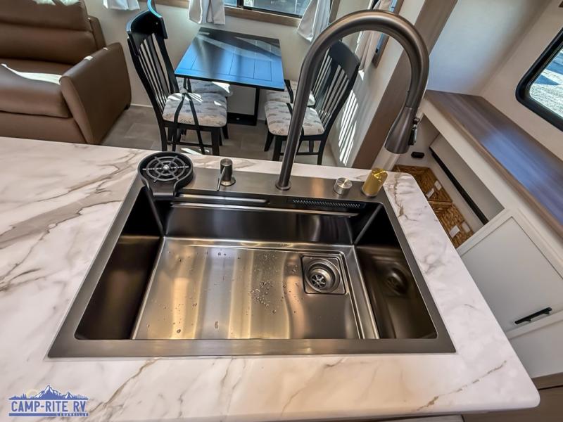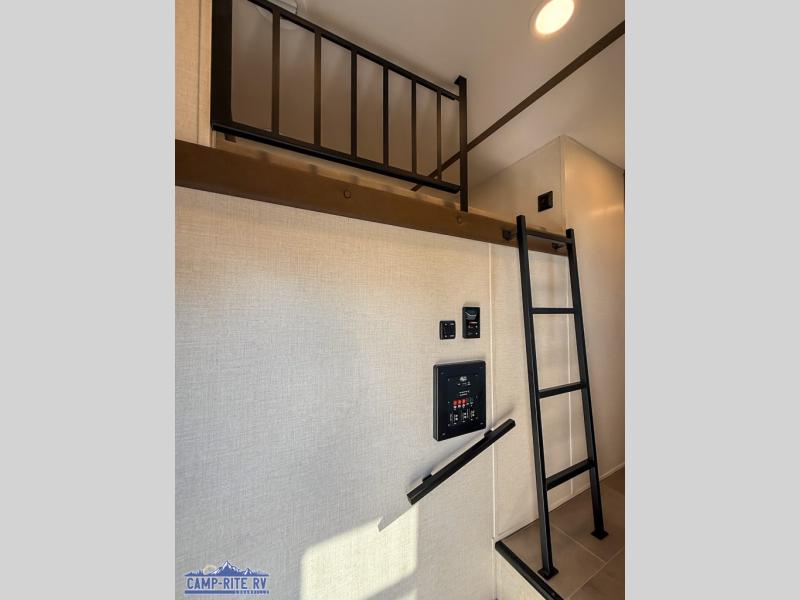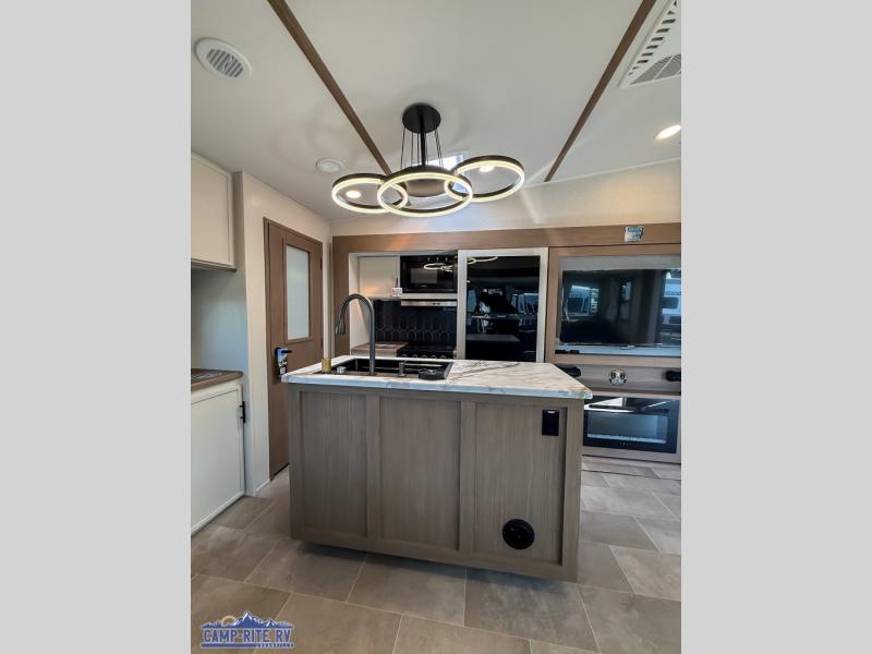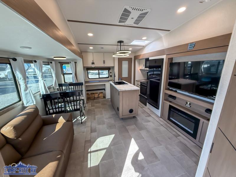 Wow! This fifth wheel will surely make an impression with its middle bunkhouse that can be utilized as an extra bedroom, second living room or even an office thanks to the desk and sofa that becomes a Versa queen bed at night. You will also find a flip-down upper bunk, a slide out for more floor space, and a wardrobe for clothing. The full bathroom is between this room and the front bedroom that offers lots of storage including a slide out wardrobe, a space prepped for a washer/dryer option, nightstands to place your cellphone and such, plus a queen bed with Versa Tilt technology. The kitchen at the back includes plenty of storage for your dishes, pans, drinkware, and dry goods. The cook will love the kitchen island and the full amenities. And the free-standing table with chairs plus the theater seating offer even more seating.