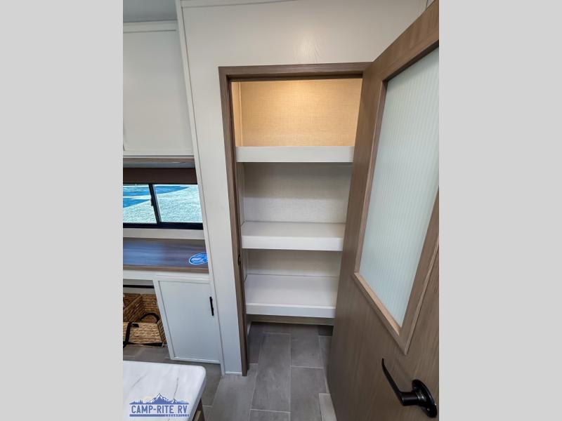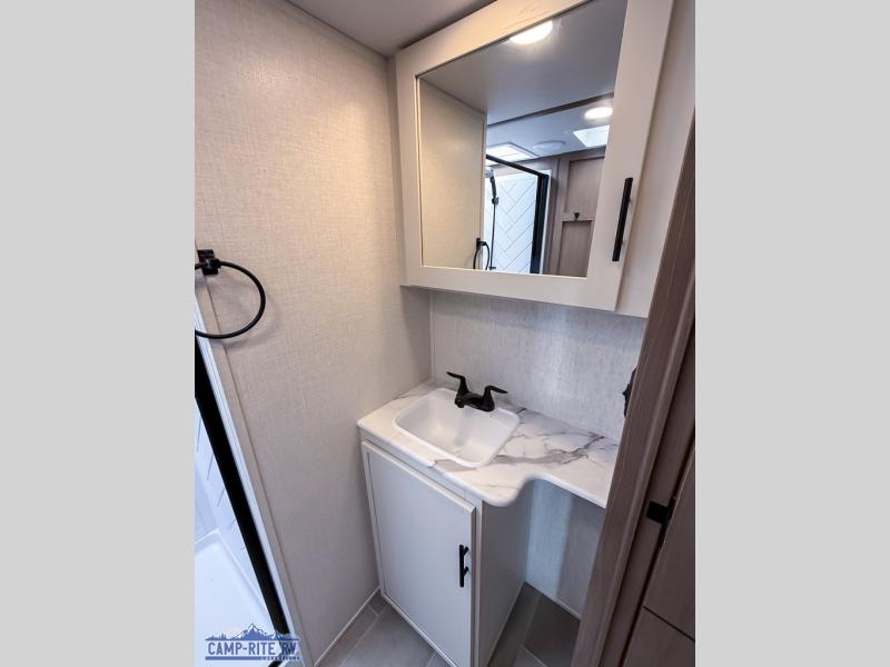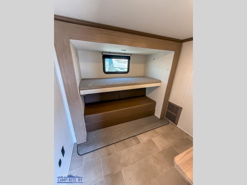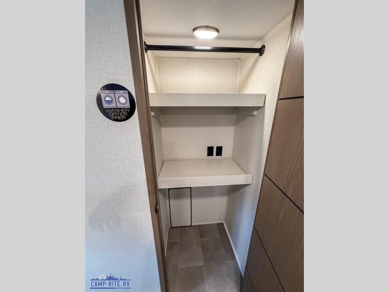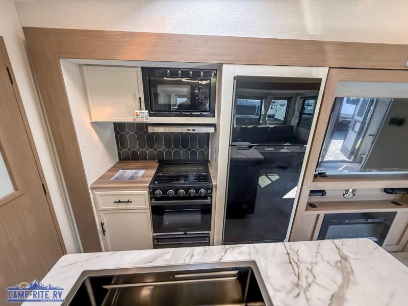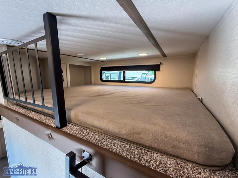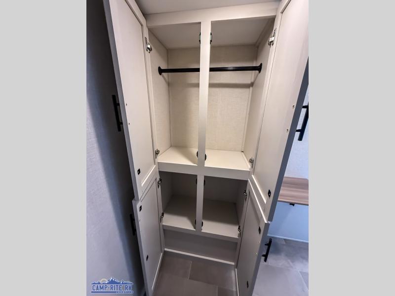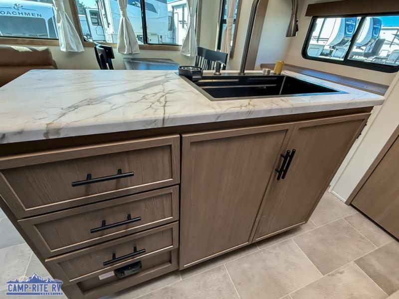Wow! This fifth wheel will surely make an impression with its middle bunkhouse that can be utilized as an extra bedroom, second living room or even an office thanks to the desk and sofa that becomes a Versa queen bed at night. You will also find a flip-down upper bunk, a slide out for more floor space, and a wardrobe for clothing. The full bathroom is between this room and the front bedroom that offers lots of storage including a slide out wardrobe, a space prepped for a washer/dryer option, nightstands to place your cellphone and such, plus a queen bed with Versa Tilt technology. The kitchen at the back includes plenty of storage for your dishes, pans, drinkware, and dry goods. The cook will love the kitchen island and the full amenities. And the free-standing table with chairs plus the theater seating offer even more seating.