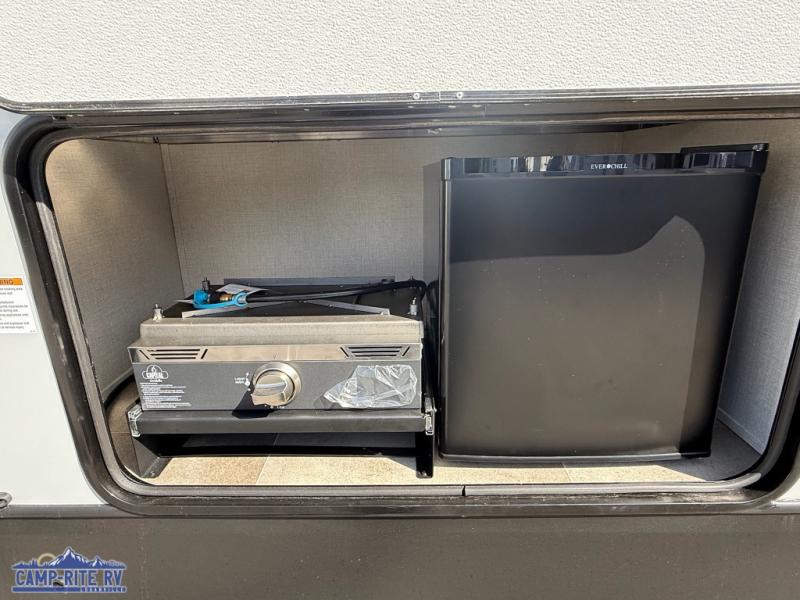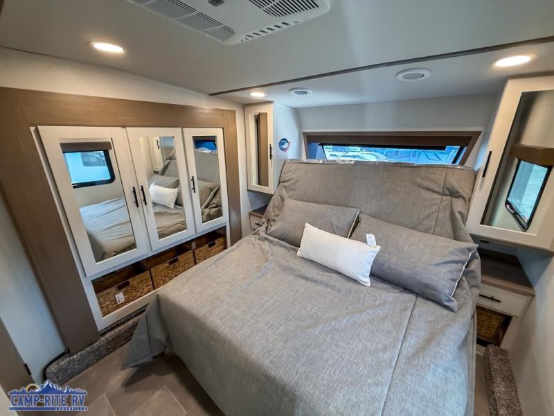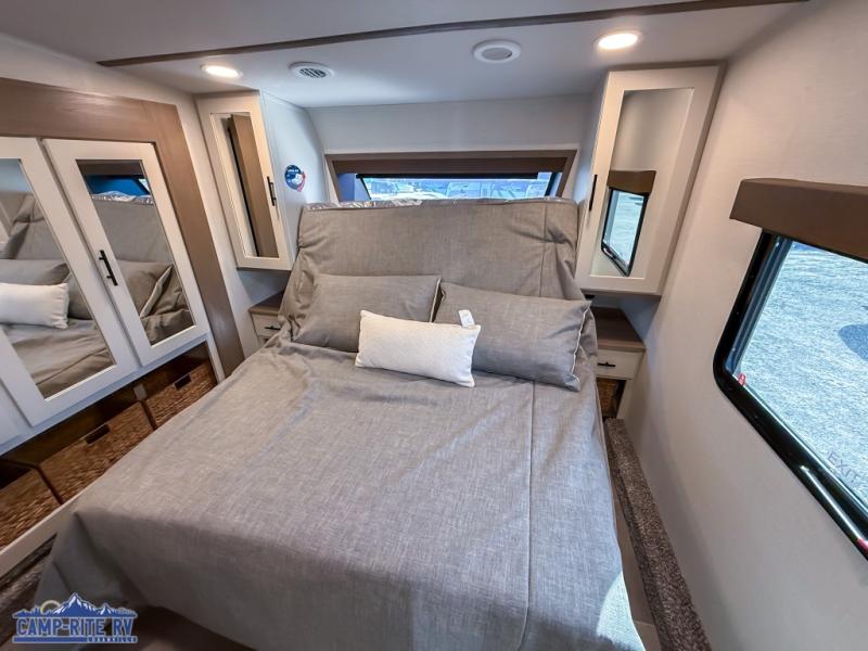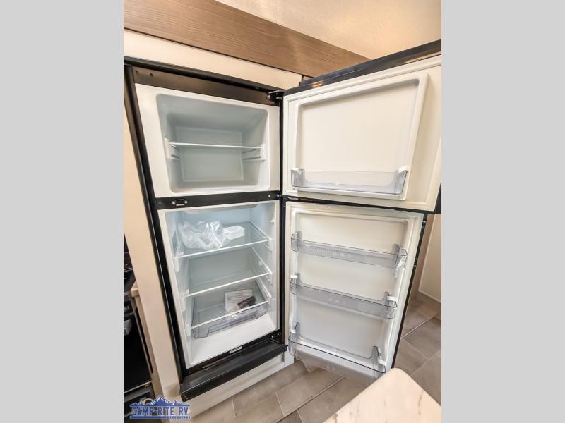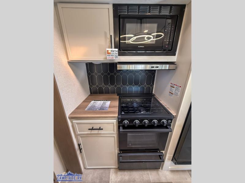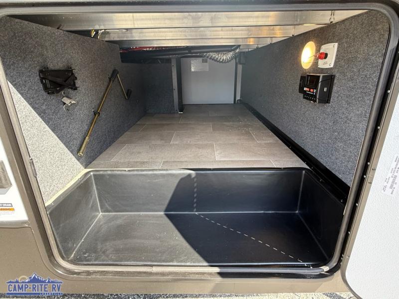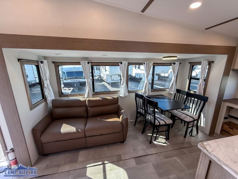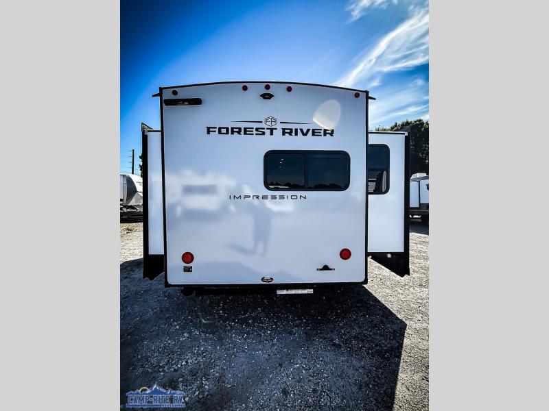 With any Impression fifth wheel by Forest River, the focus of the design is comfort and value, built with quality craftsmanship and attention to customer's desires in each Impression! The exterior includes upgraded E-rated tires, custom exterior graphics package, and insulated slam latch baggage doors. There is also an enclosed docking station, an outside shower, and a 100W roof panel for off-grid capabilities. The fully heated and enclosed AccessiBelly has removable underbelly panels along with enclosed tank valves. There is an industry leading 15K A/C plus 35K BTU furnace to keep you comfortable. The interior has lumbercore cabinetry, residential linoleum, residential backsplash in the kitchen, and oversized opening windows in the living area for more natural lighting and good air flow.