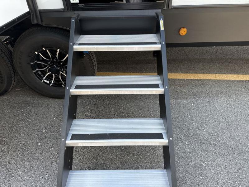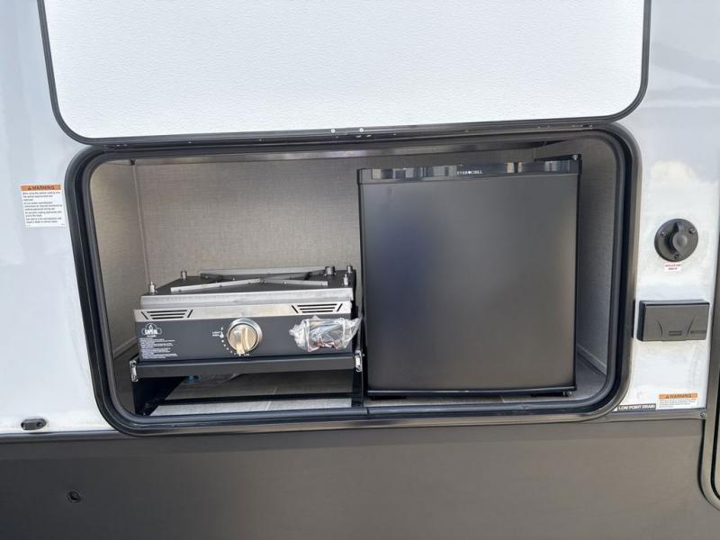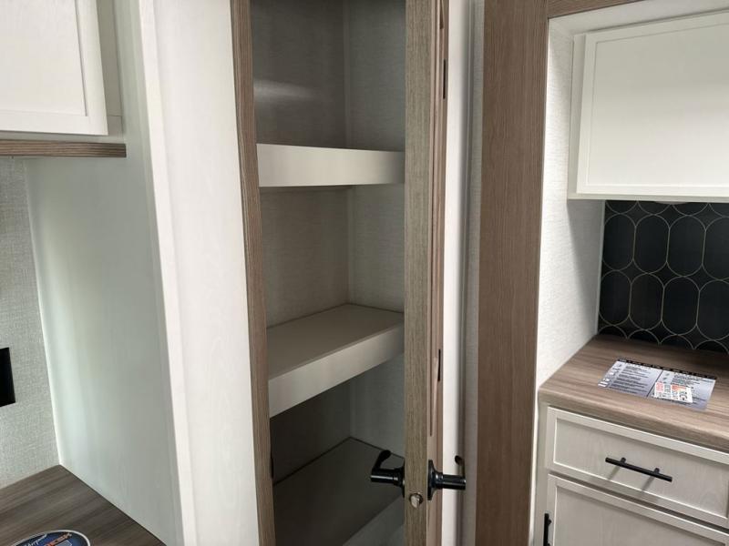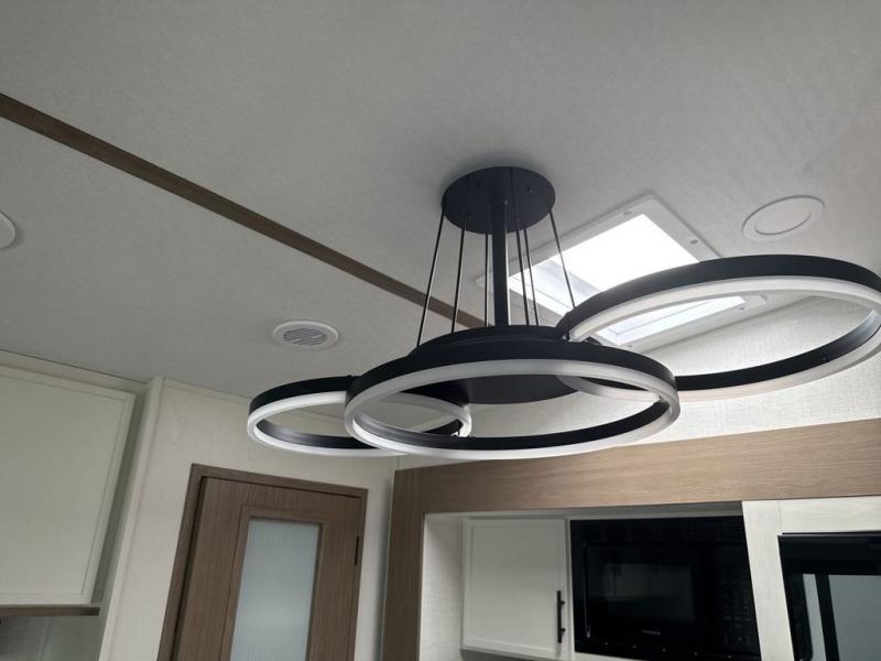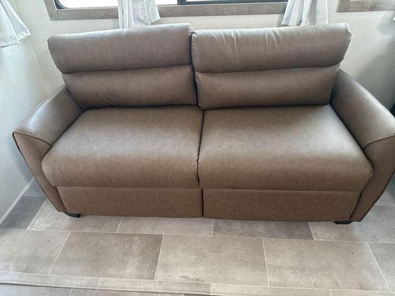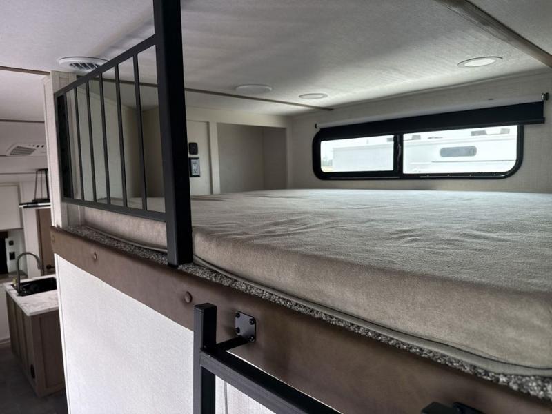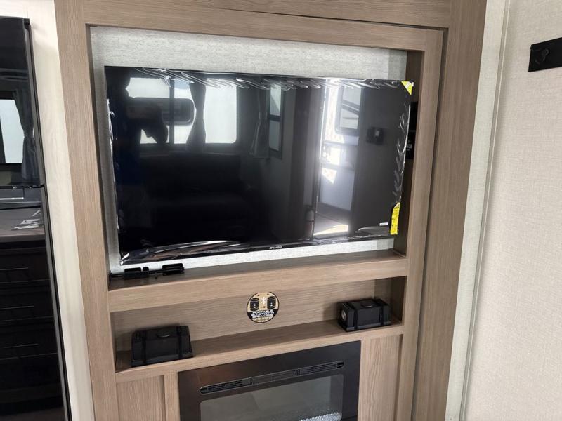Wow! This fifth wheel will surely make an impression with its middle bunkhouse that can be utilized as an extra bedroom, second living room or even an office thanks to the desk and sofa that becomes a Versa queen bed at night. You will also find a flip-down upper bunk, a slide out for more floor space, and a wardrobe for clothing. The full bathroom is between this room and the front bedroom that offers lots of storage including a slide out wardrobe, a space prepped for a washer/dryer option, nightstands to place your cellphone and such, plus a queen bed with Versa Tilt technology. The rear kitchen includes plenty of storage for your dishes, pans, drinkware, and dry goods. The cook will love the kitchen island, the full amenities as well as the choice to use the outside kitchen to help feed everyone. And the free standing dinette with chairs plus the so a theater seating offer seating inside.