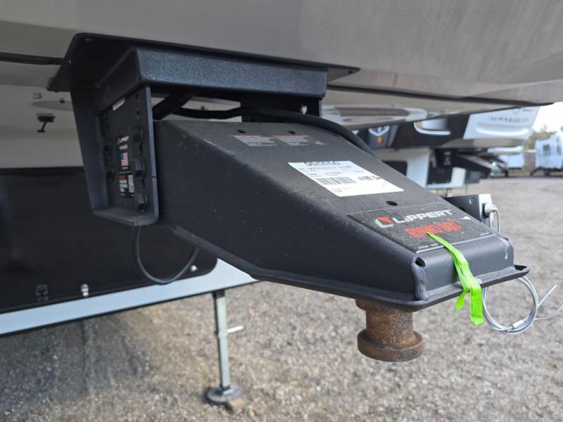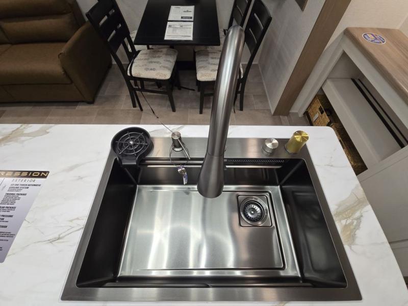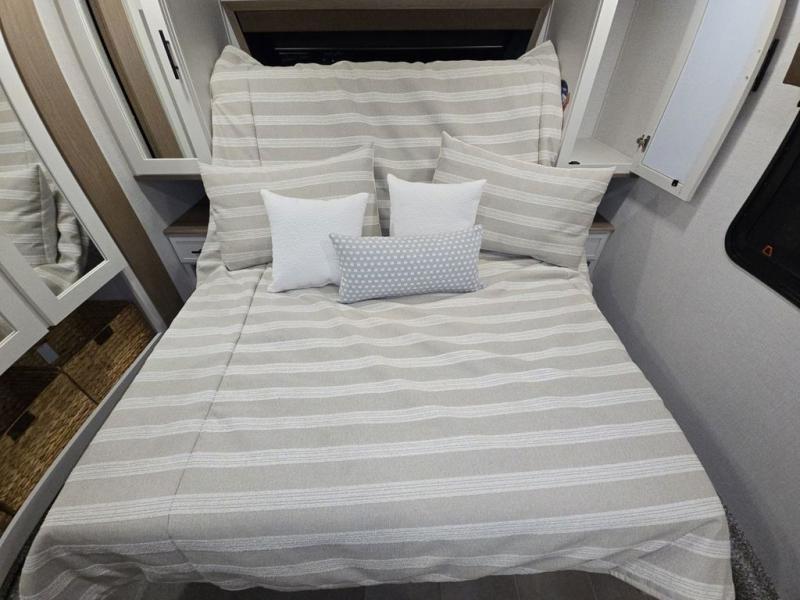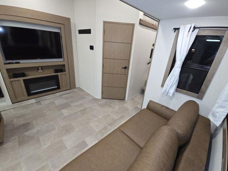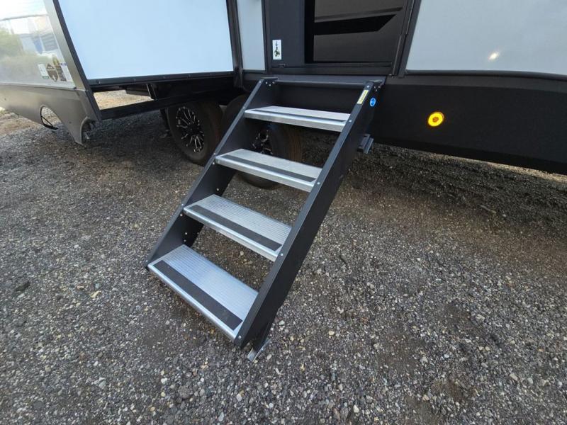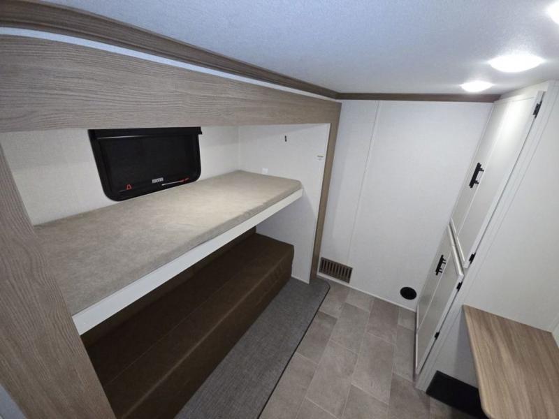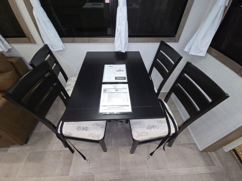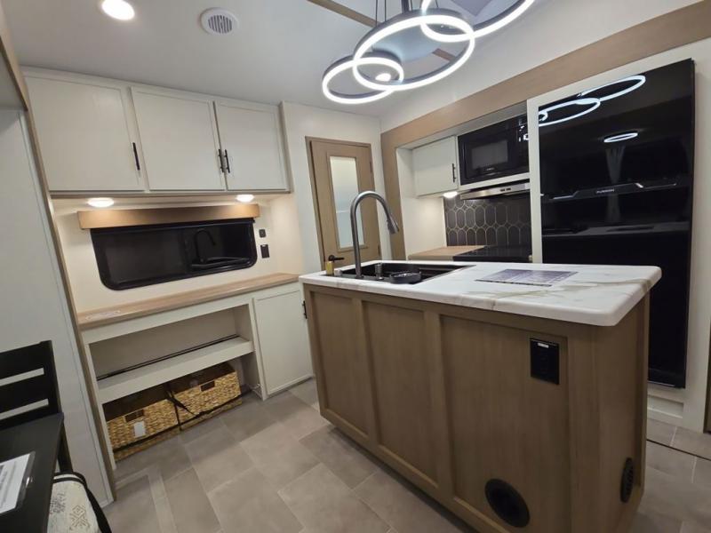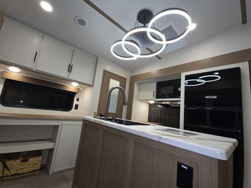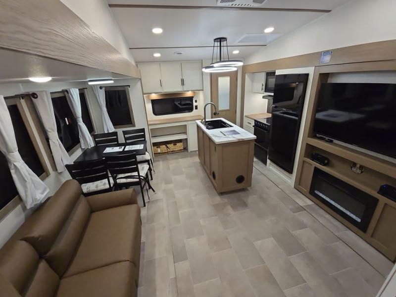 Wow! This fifth wheel will surely make an impression with its middle bunkhouse that can be utilized as an extra bedroom, second living room or even an office thanks to the desk and sofa that becomes a Versa queen bed at night. You will also find a flip-down upper bunk, a slide out for more floor space, and a wardrobe for clothing. The full bathroom is between this room and the front bedroom that offers lots of storage including a slide out wardrobe, a space prepped for a washer/dryer option, nightstands to place your cellphone and such, plus a queen bed with Versa Tilt technology. The kitchen at the back includes plenty of storage for your dishes, pans, drinkware, and dry goods. The cook will love the kitchen island and the full amenities. And the free-standing table with chairs plus the theater seating offer even more seating.