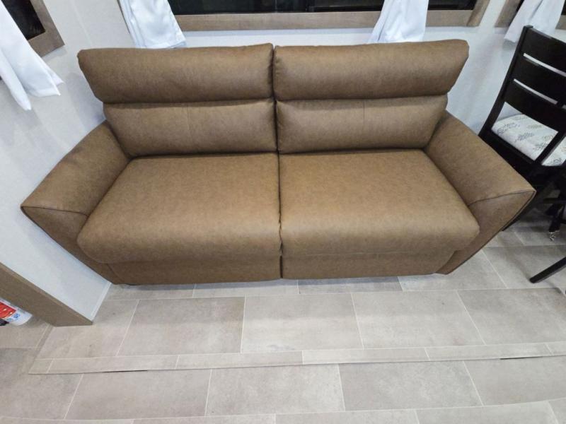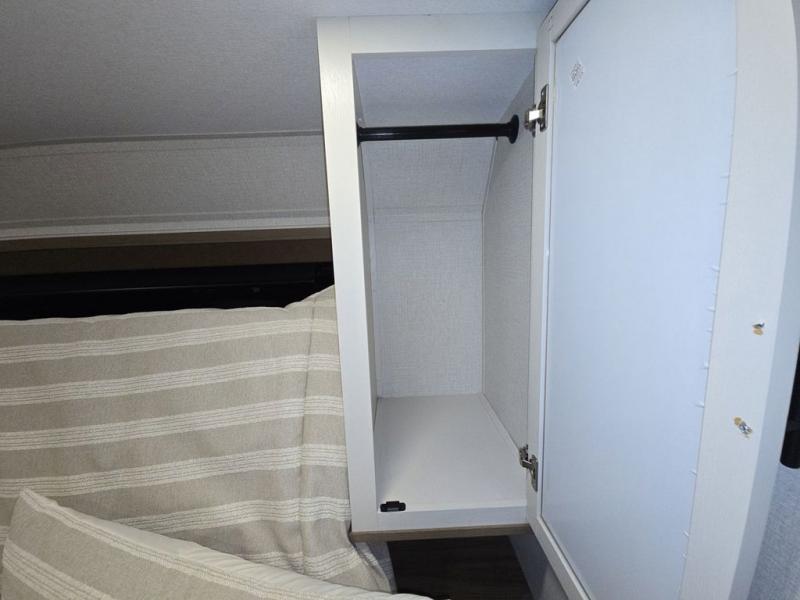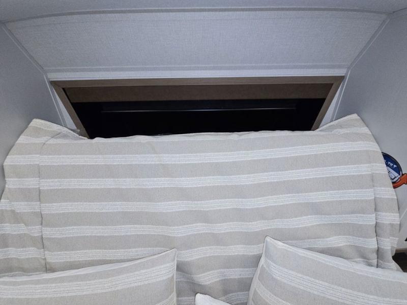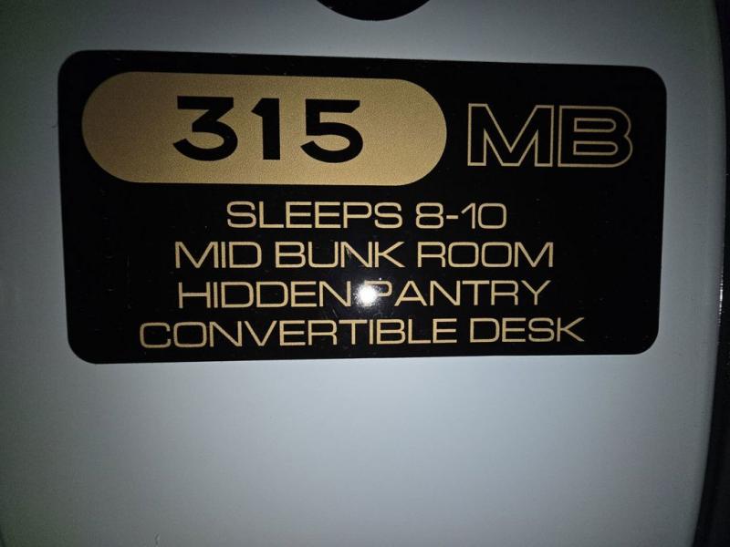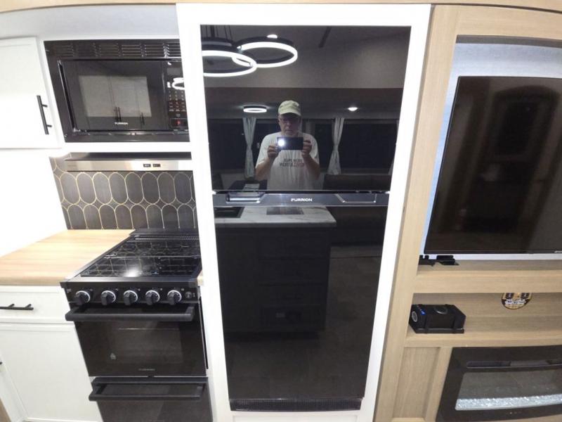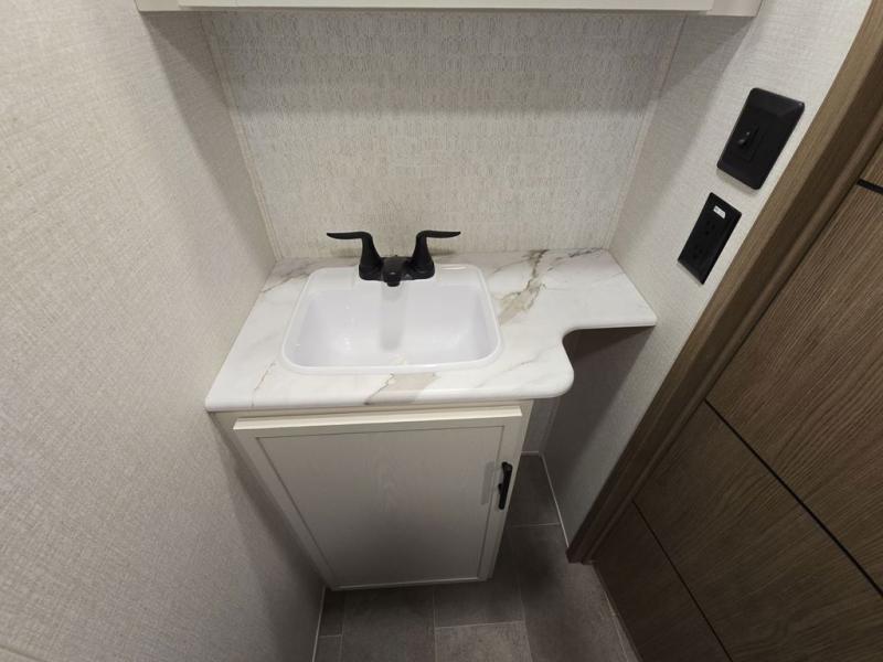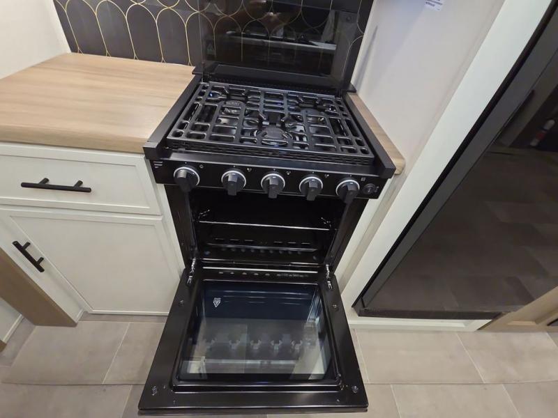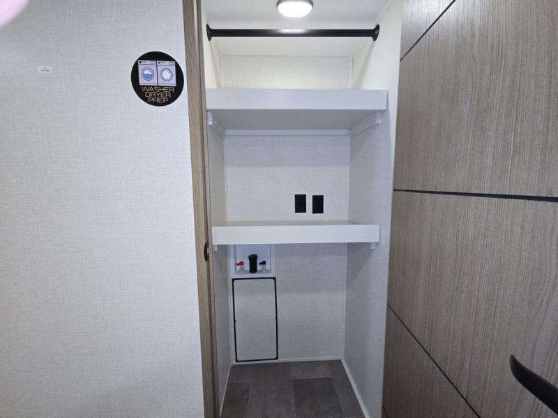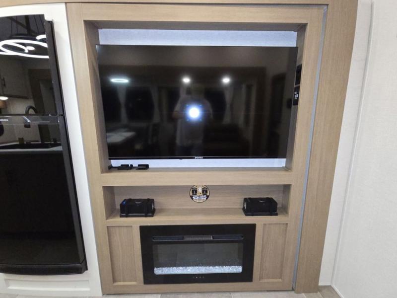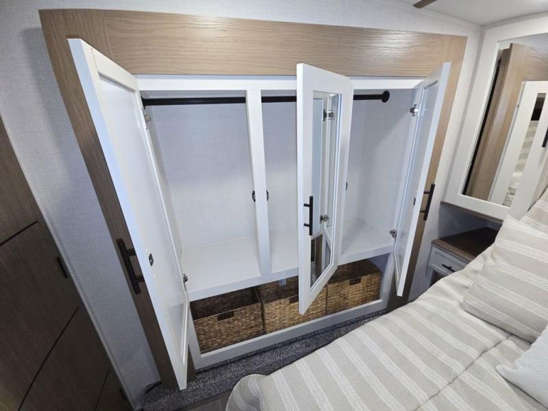 Wow! This fifth wheel will surely make an impression with its middle bunkhouse that can be utilized as an extra bedroom, second living room or even an office thanks to the desk and sofa that becomes a Versa queen bed at night. You will also find a flip-down upper bunk, a slide out for more floor space, and a wardrobe for clothing. The full bathroom is between this room and the front bedroom that offers lots of storage including a slide out wardrobe, a space prepped for a washer/dryer option, nightstands to place your cellphone and such, plus a queen bed with Versa Tilt technology. The kitchen at the back includes plenty of storage for your dishes, pans, drinkware, and dry goods. The cook will love the kitchen island and the full amenities. And the free-standing table with chairs plus the theater seating offer even more seating.