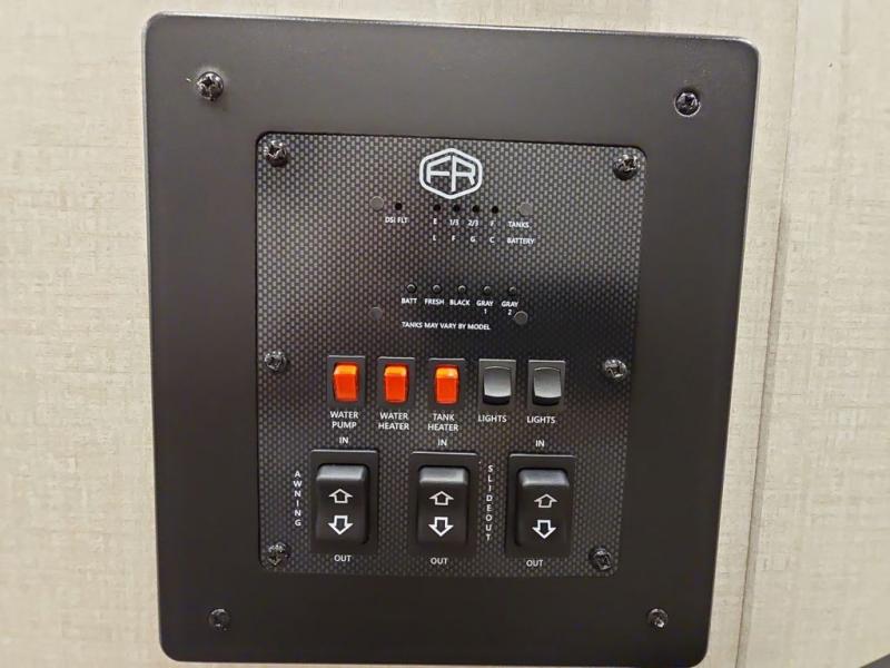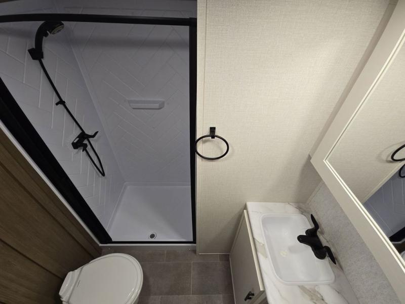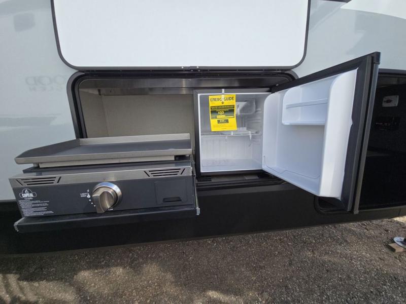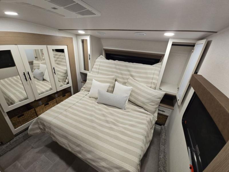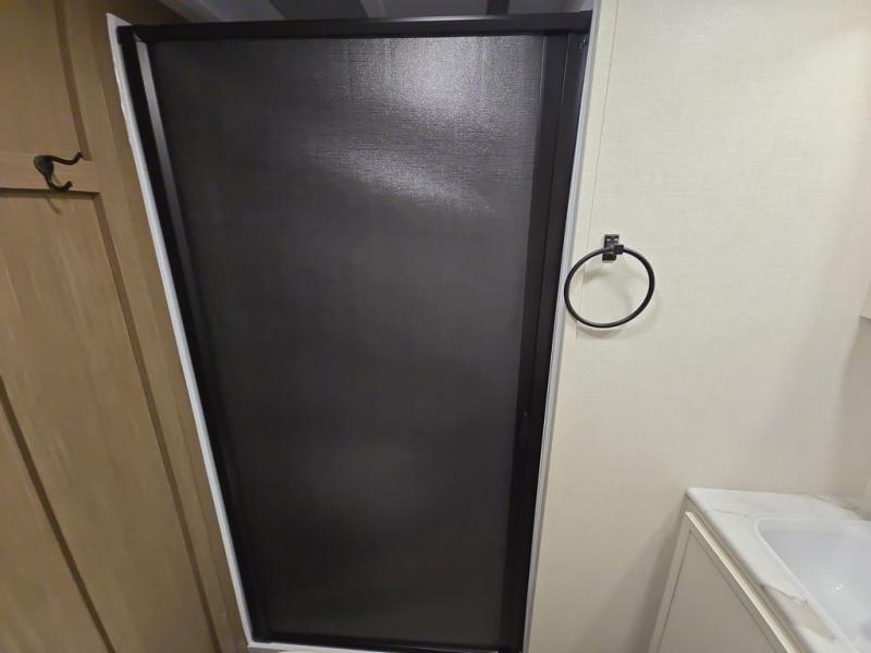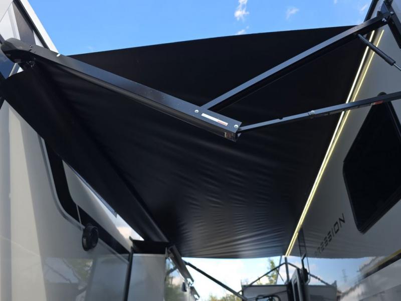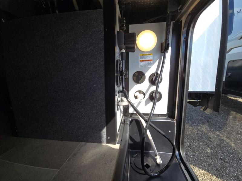 With any Impression fifth wheel by Forest River, the focus of the design is comfort and value, built with quality craftsmanship and attention to customer's desires in each Impression! The exterior includes upgraded E-rated tires, custom exterior graphics package, and insulated slam latch baggage doors. There is also an enclosed docking station, an outside shower, and a 100W roof panel for off-grid capabilities. The fully heated and enclosed AccessiBelly has removable underbelly panels and help to travel in any season. There is an industry leading 15K A/C plus 35K BTU furnace to keep you comfortable. The interior has lumbercore cabinetry, residential linoleum, residential backsplash in the kitchen, and oversized opening windows in the living area for more natural lighting and good air flow.