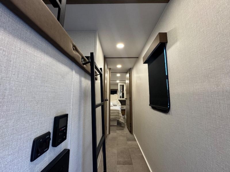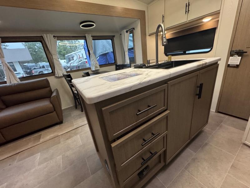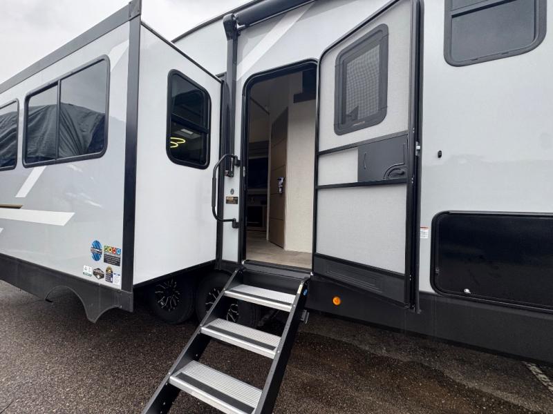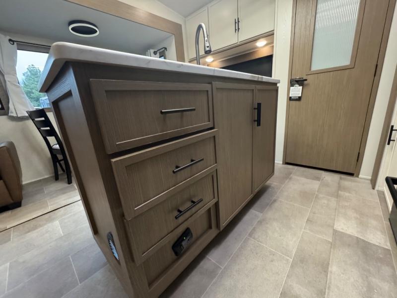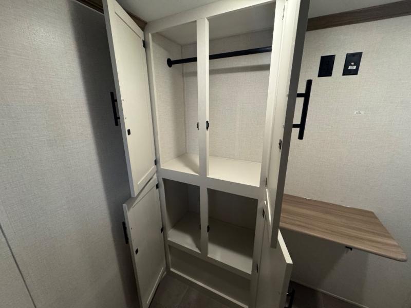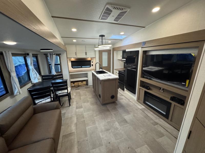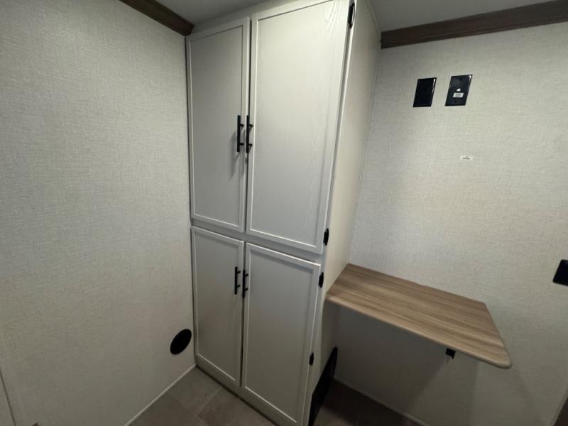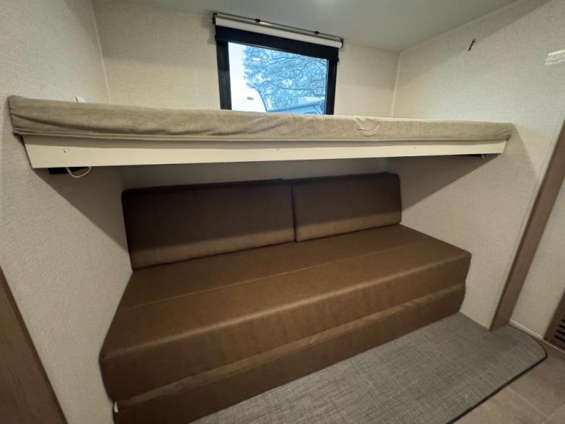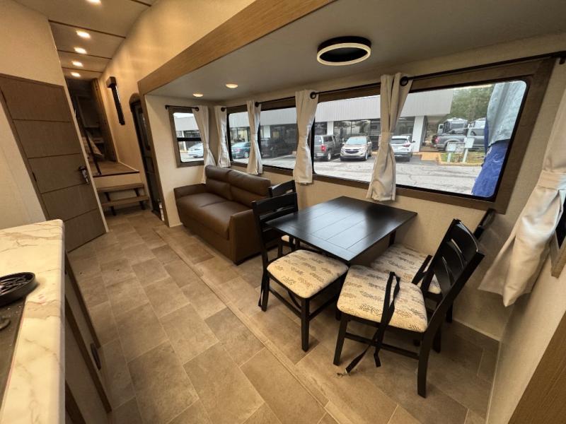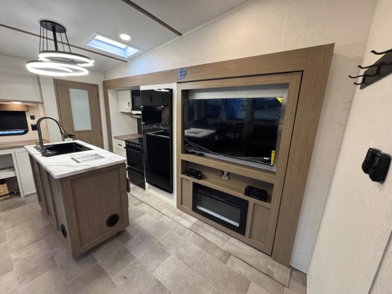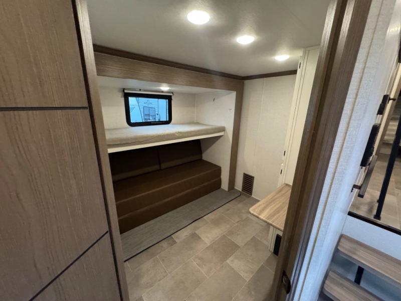 Wow! This fifth wheel will surely make an impression with its middle bunkhouse that can be utilized as an extra bedroom, second living room or even an office thanks to the desk and sofa that becomes a Versa queen bed at night. You will also find a flip-down upper bunk, a slide out for more floor space, and a wardrobe for clothing. The full bathroom is between this room and the front bedroom that offers lots of storage including a slide out wardrobe, a space prepped for a washer/dryer option, nightstands to place your cellphone and such, plus a queen bed with Versa Tilt technology. The kitchen at the back includes plenty of storage for your dishes, pans, drinkware, and dry goods. The cook will love the kitchen island and the full amenities. And the free-standing table with chairs plus the theater seating offer even more seating.